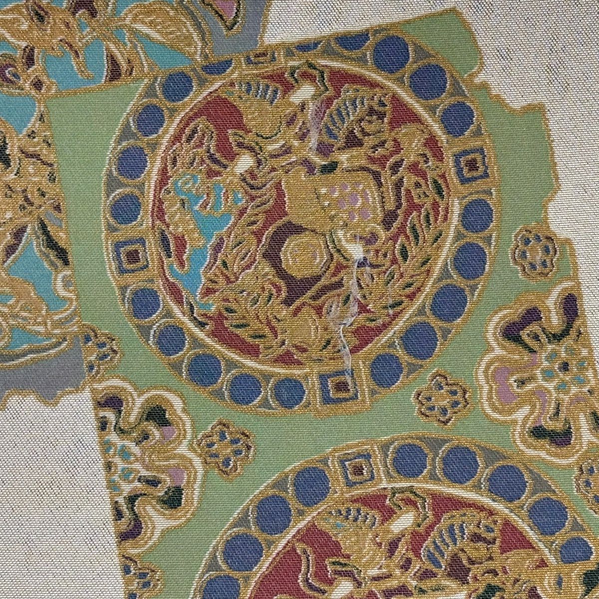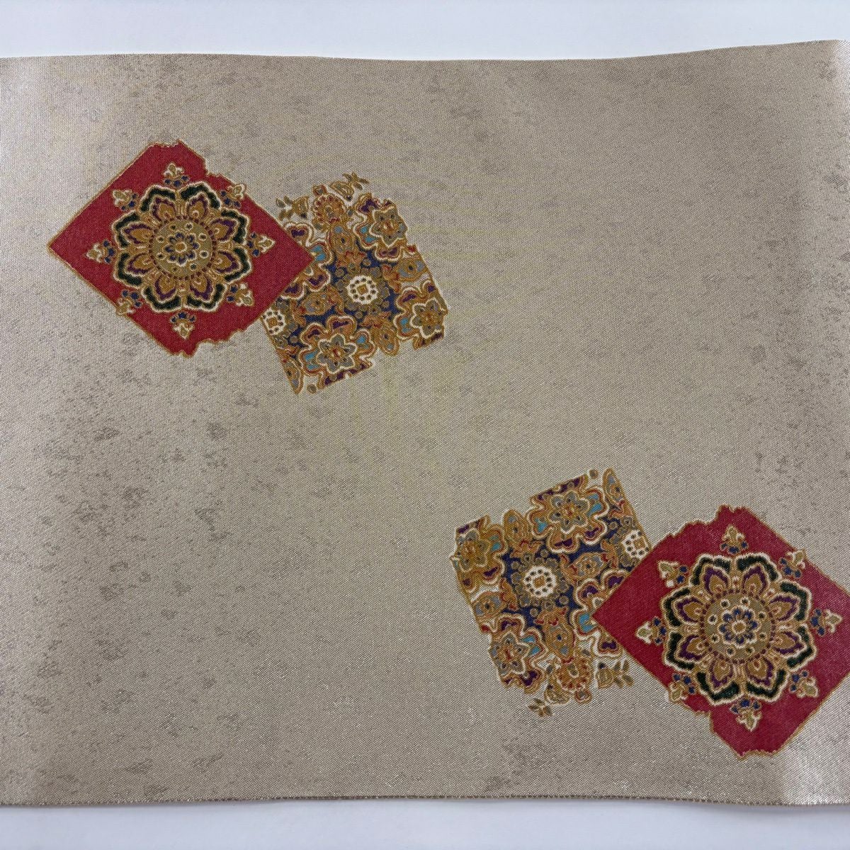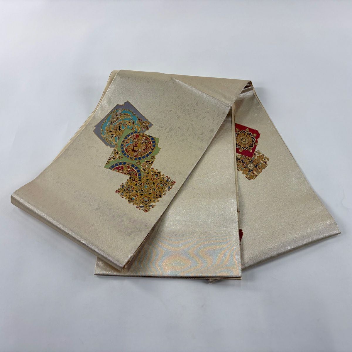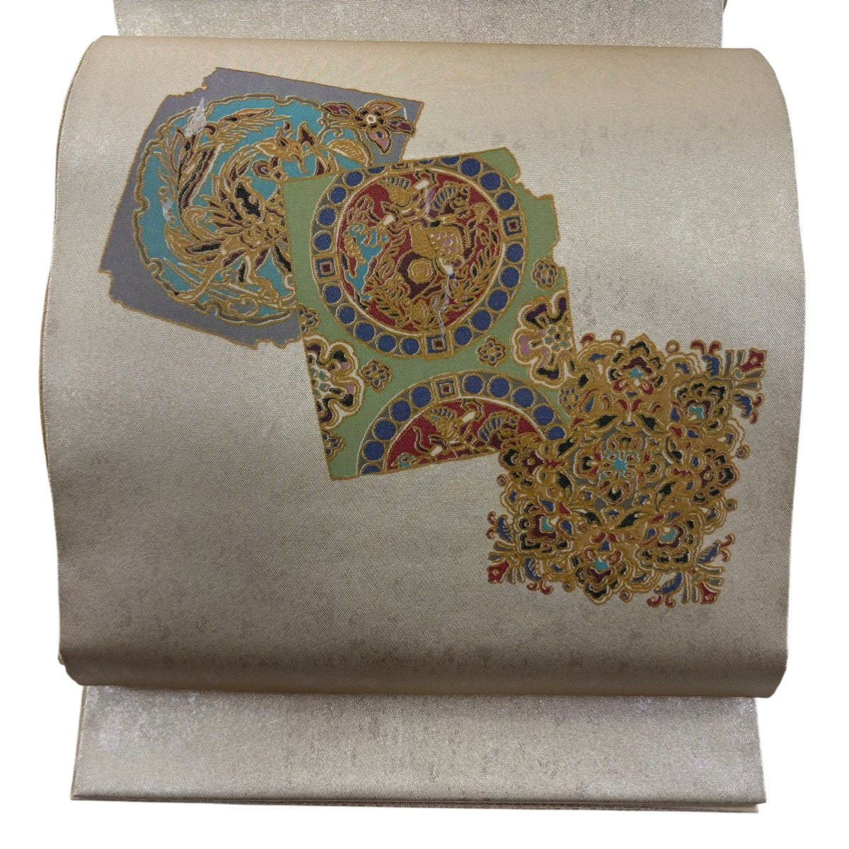 袋帯 秀品 破れ色紙 狩猟文 金彩 箔 ベージュ お太鼓柄 正絹