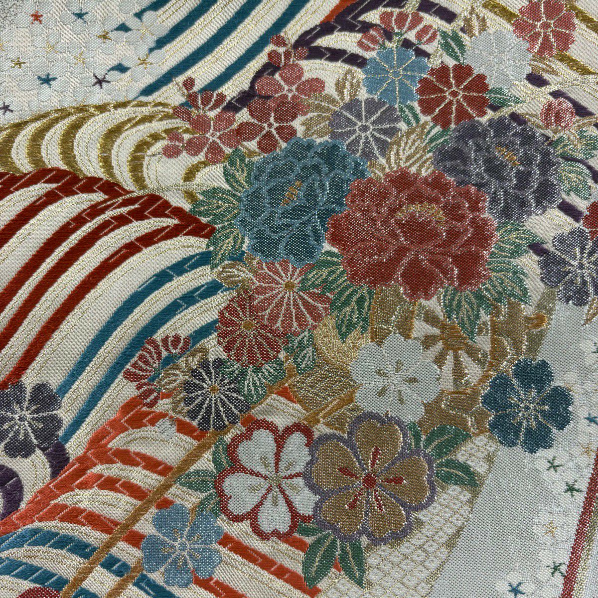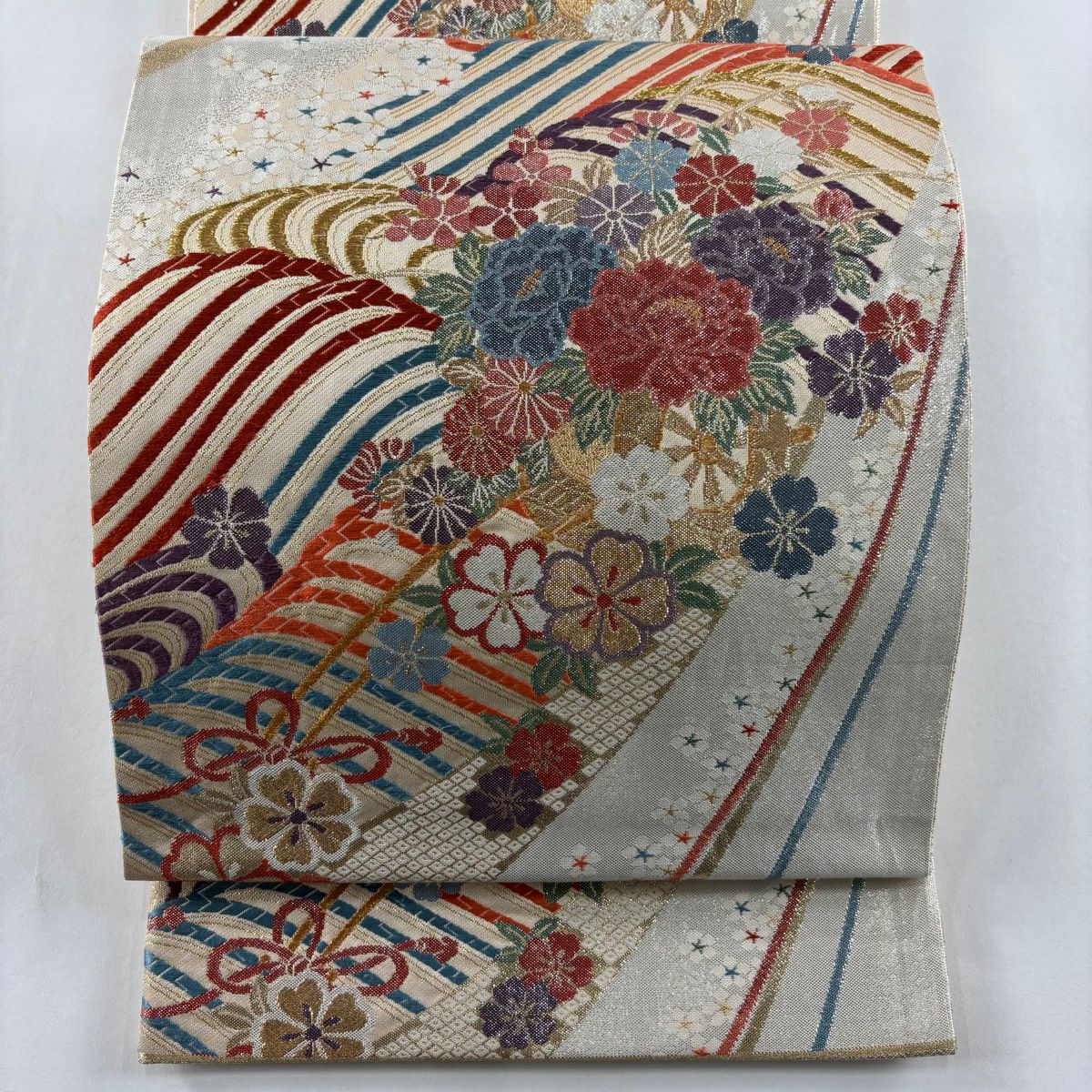 70%OFF 袋帯 秀品 桜 波 金糸 箔 灰白 六通 正絹 K70