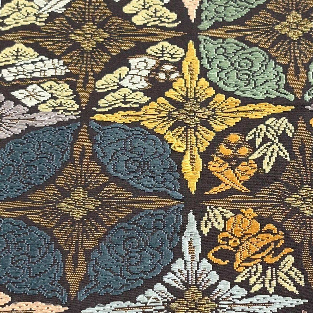 70%OFF 袋帯 秀品 草花 幾何学模様 灰色 全通 正絹 K70