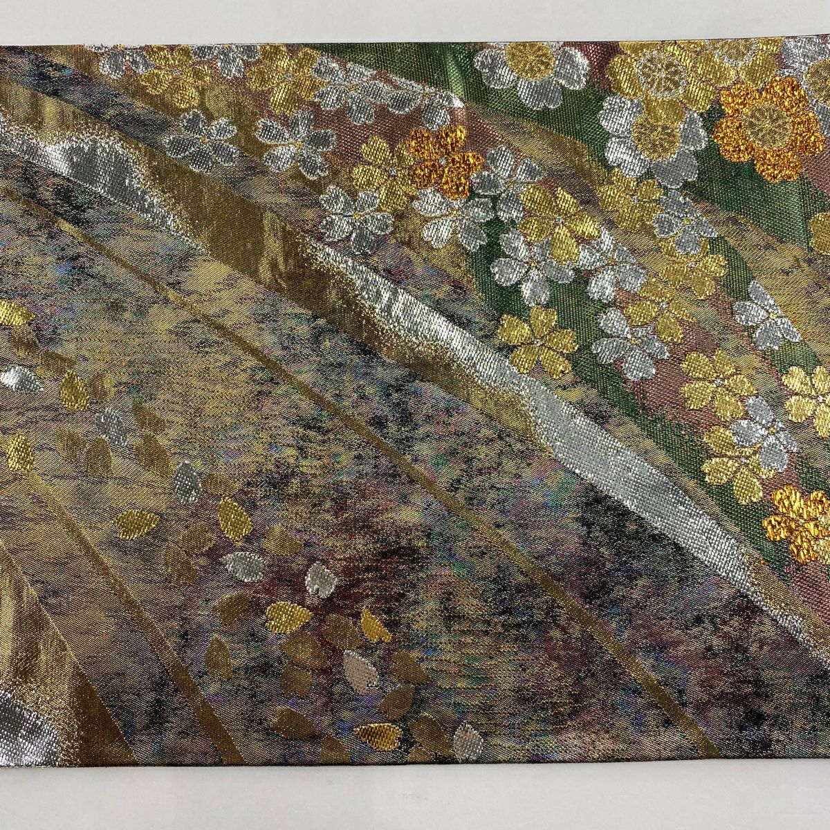 70%OFF 袋帯 秀品 草花 霞 箔 灰緑 お太鼓柄 正絹 K70