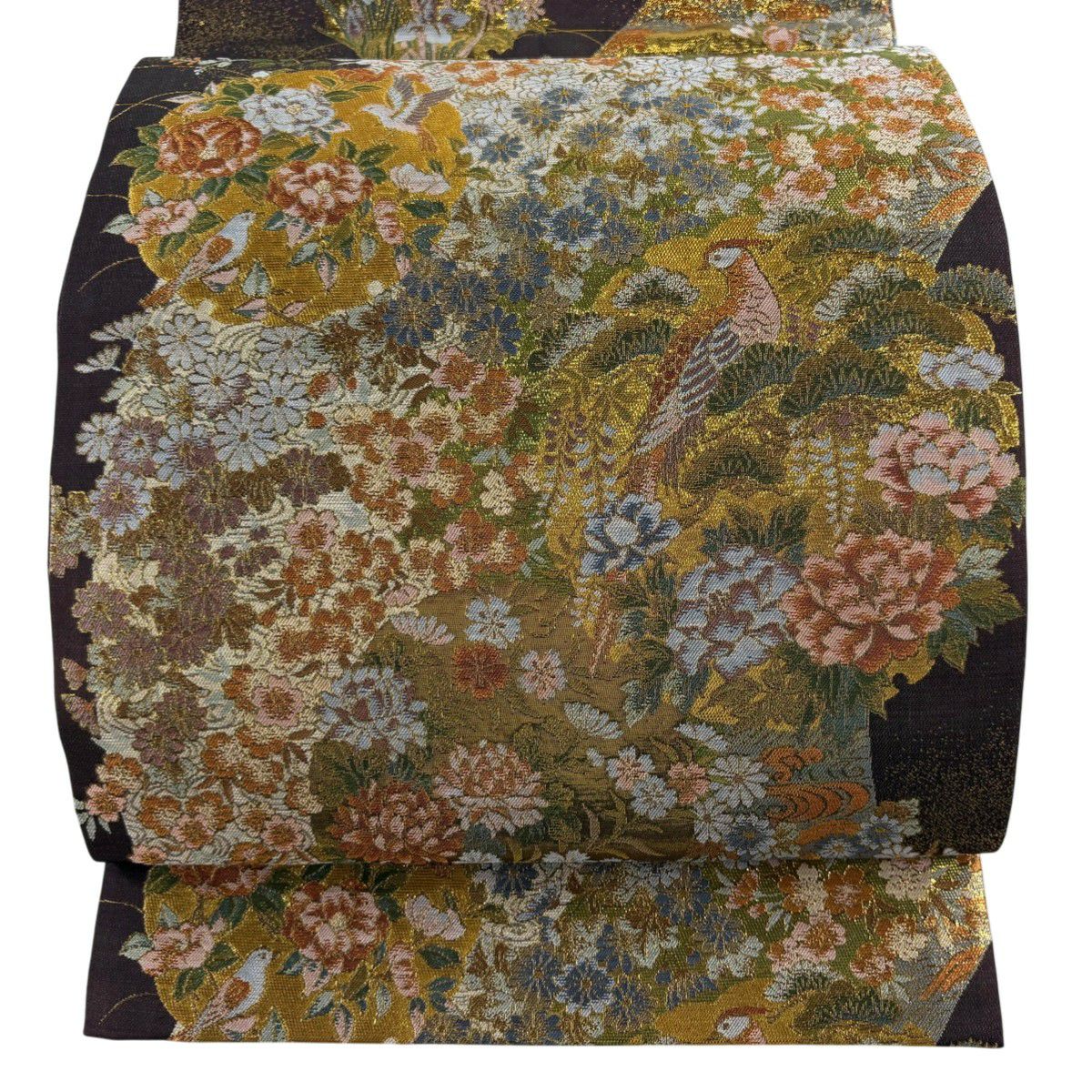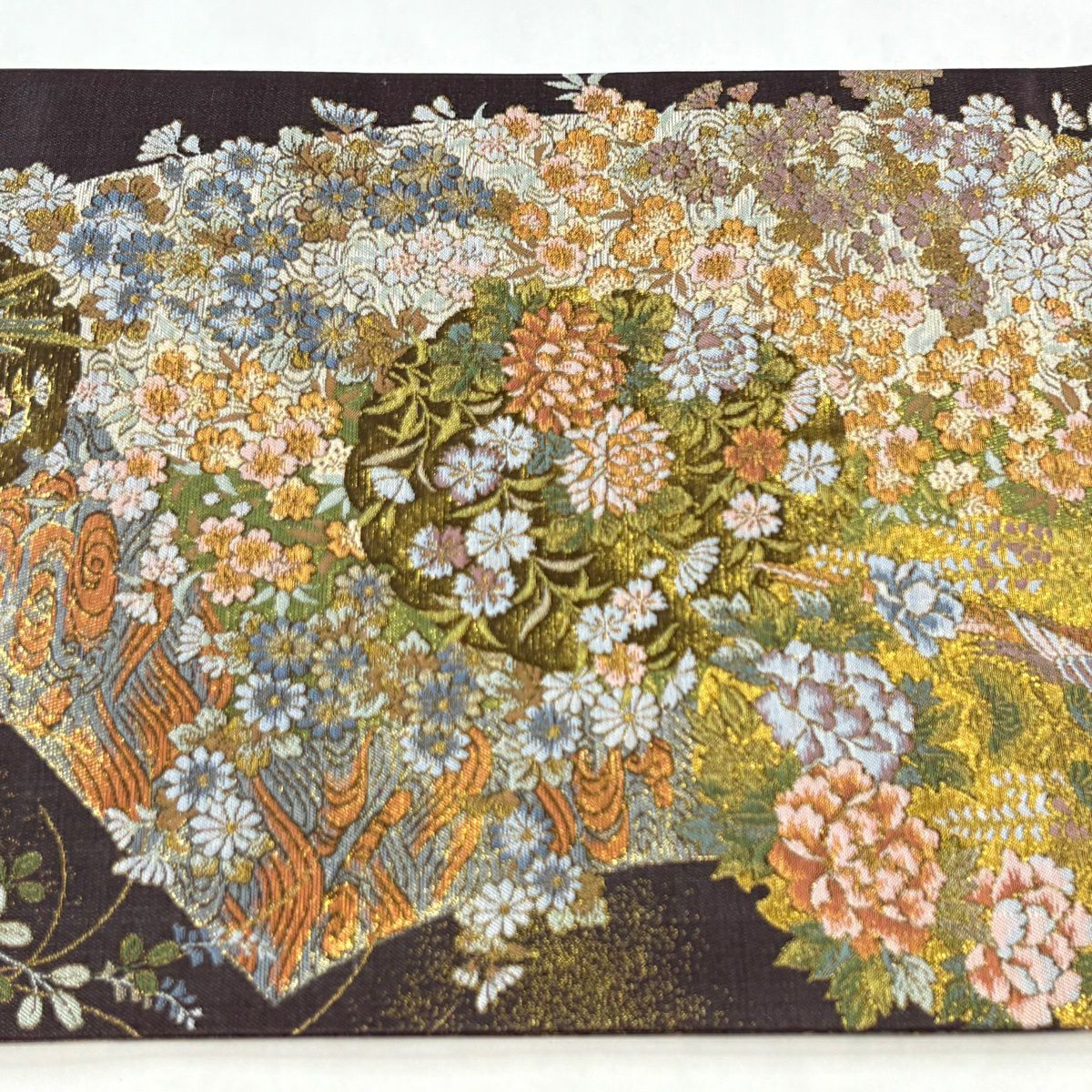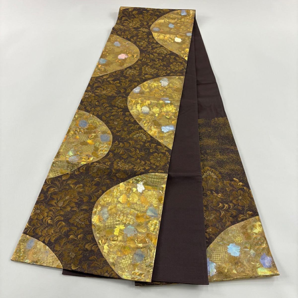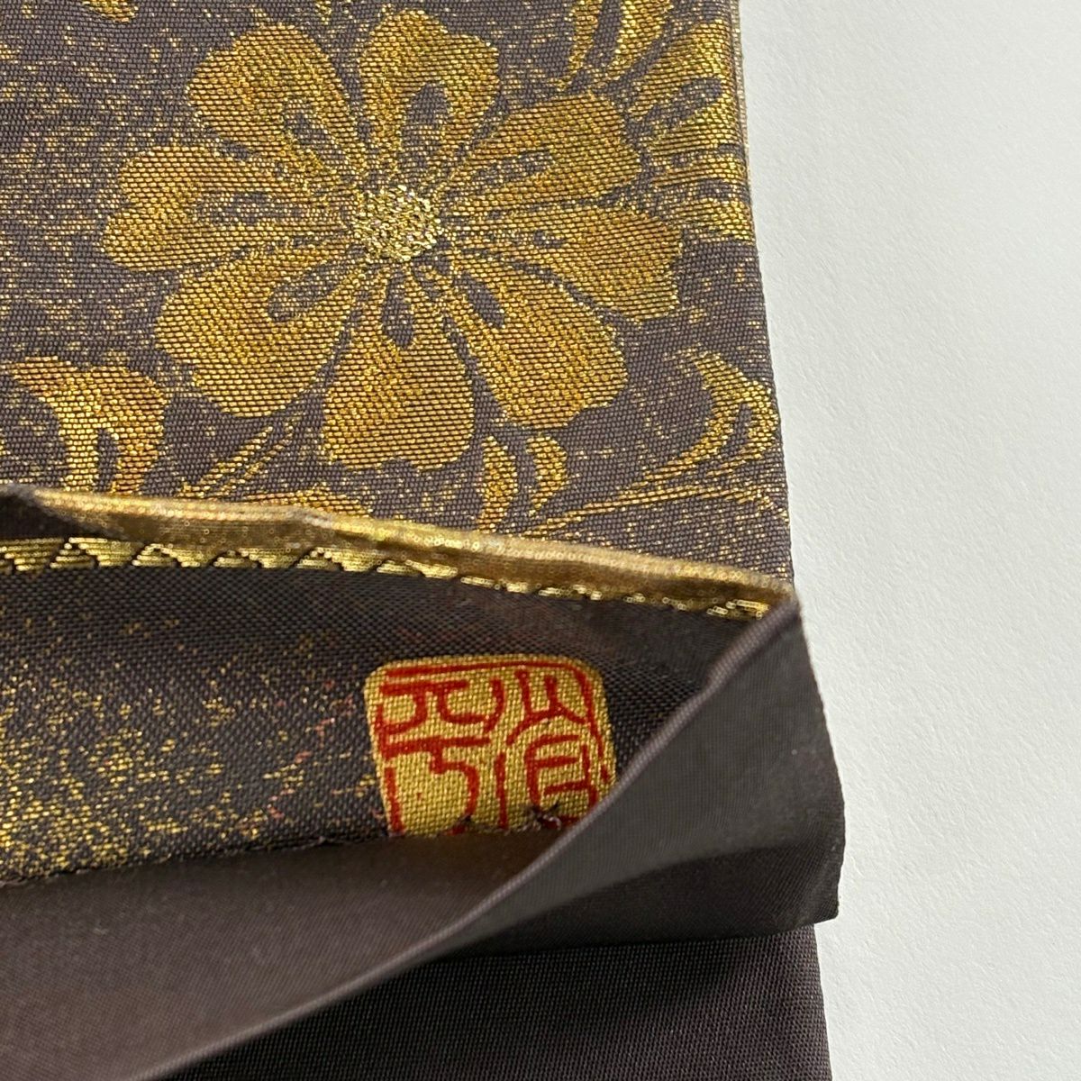 袋帯 秀品 堀省平 落款あり 花唐草 箔 金糸 焦茶色 お太鼓柄 正絹