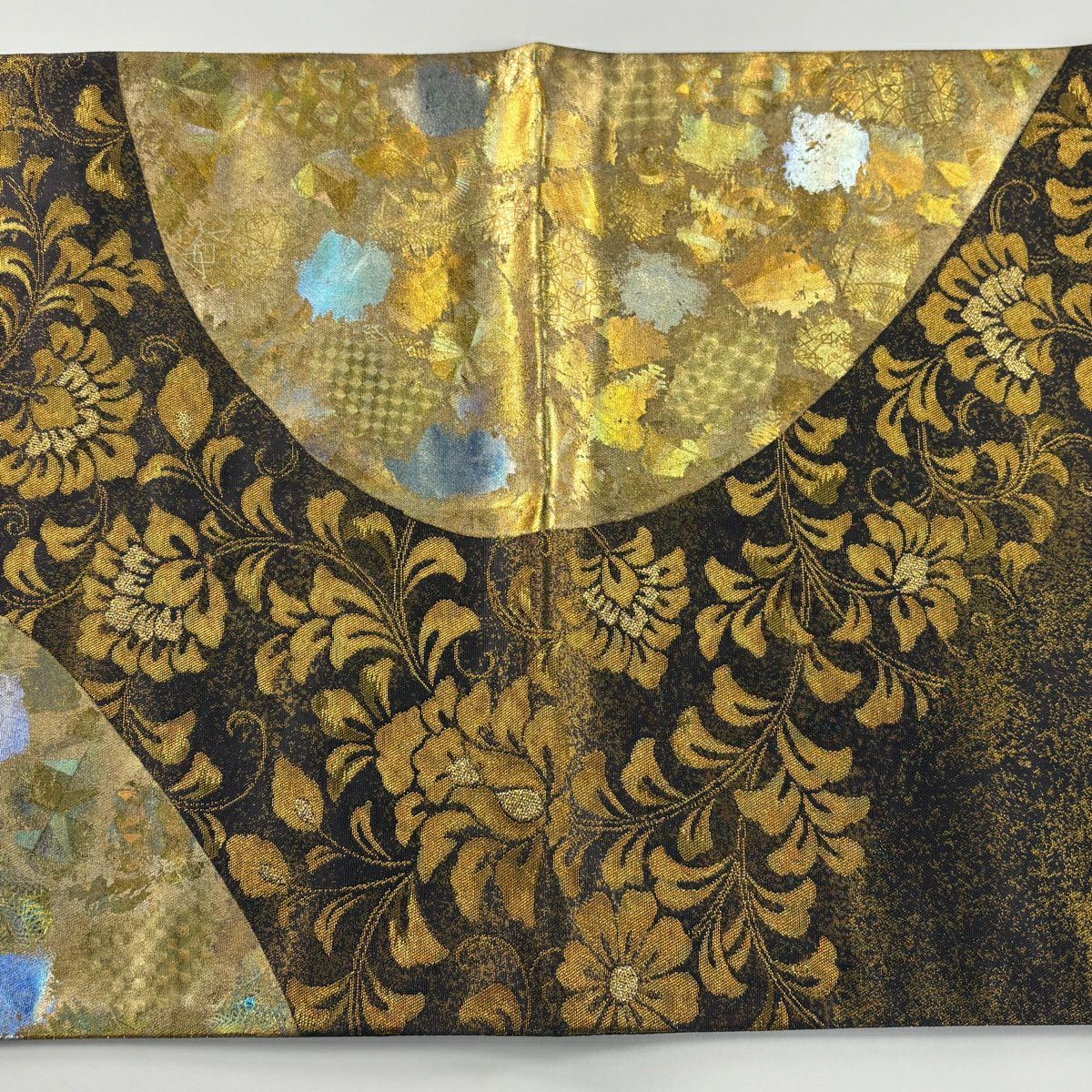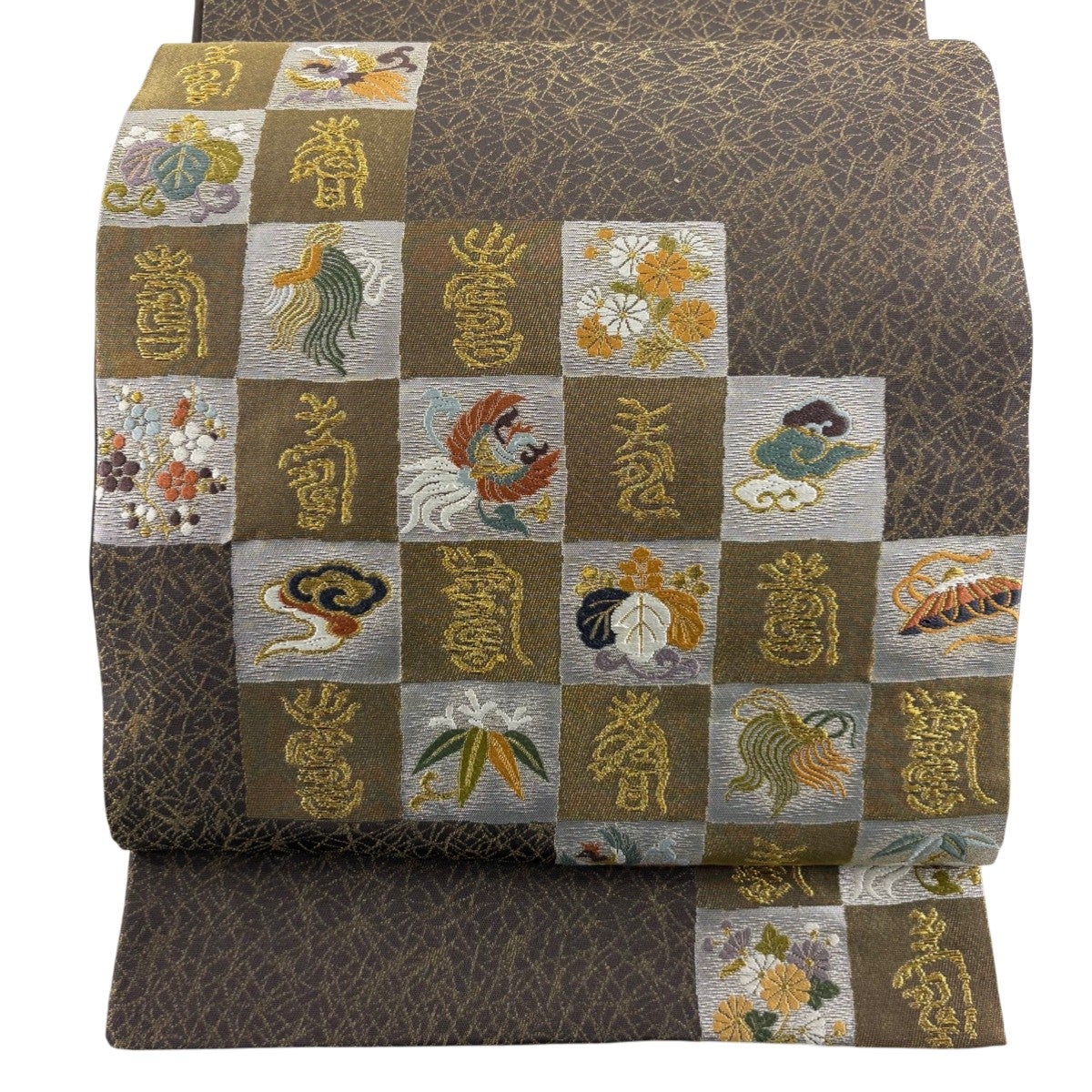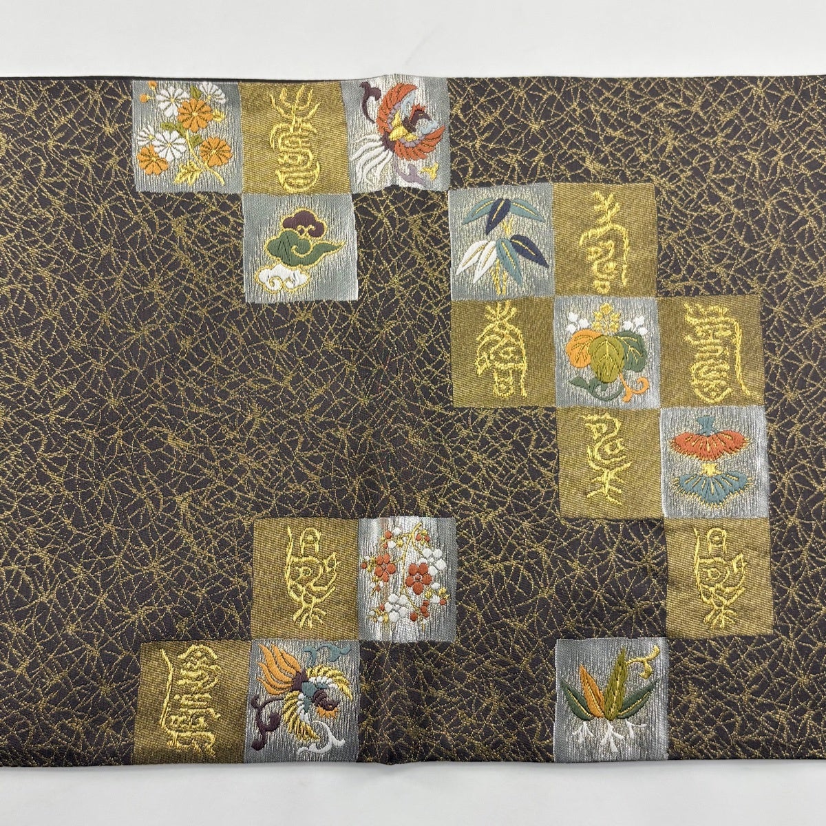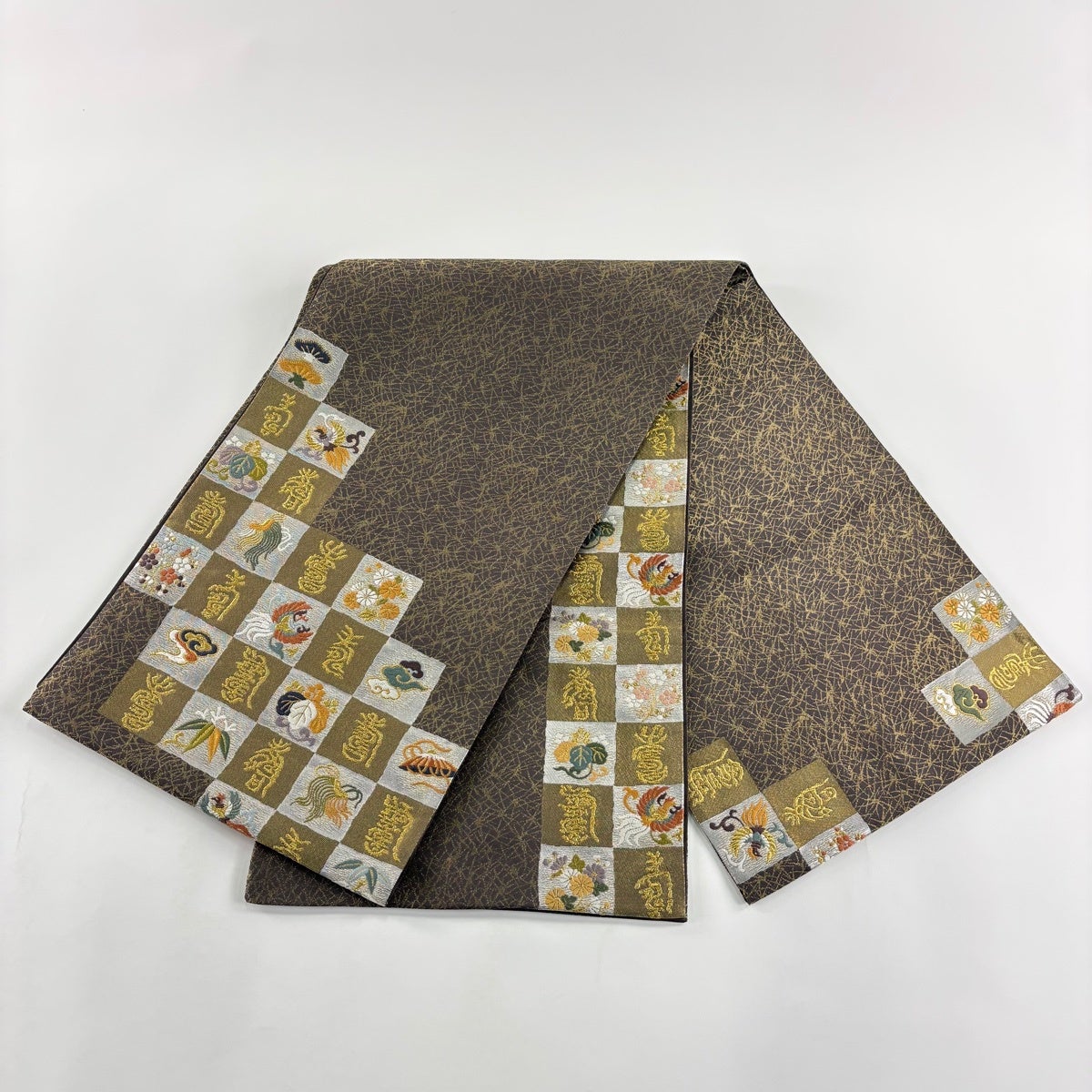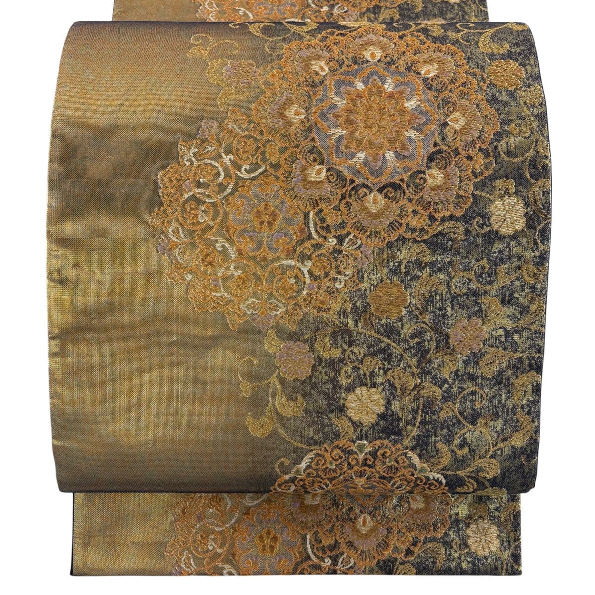 袋帯 秀品 堀省平 落款あり 花唐草 箔 金糸 焦茶色 お太鼓柄 正絹