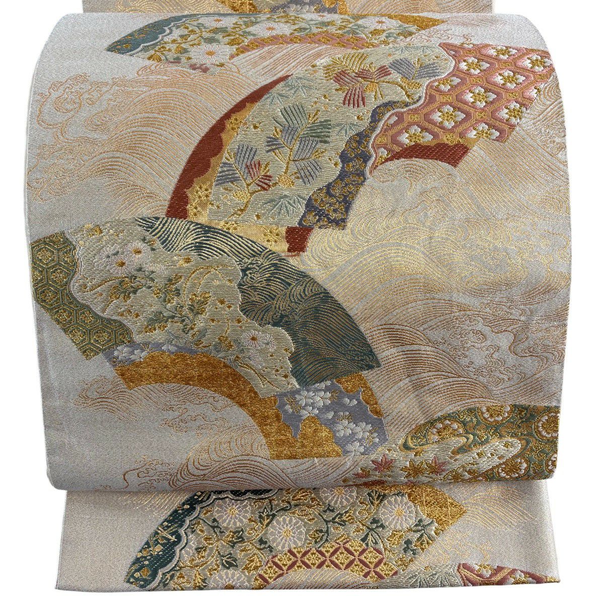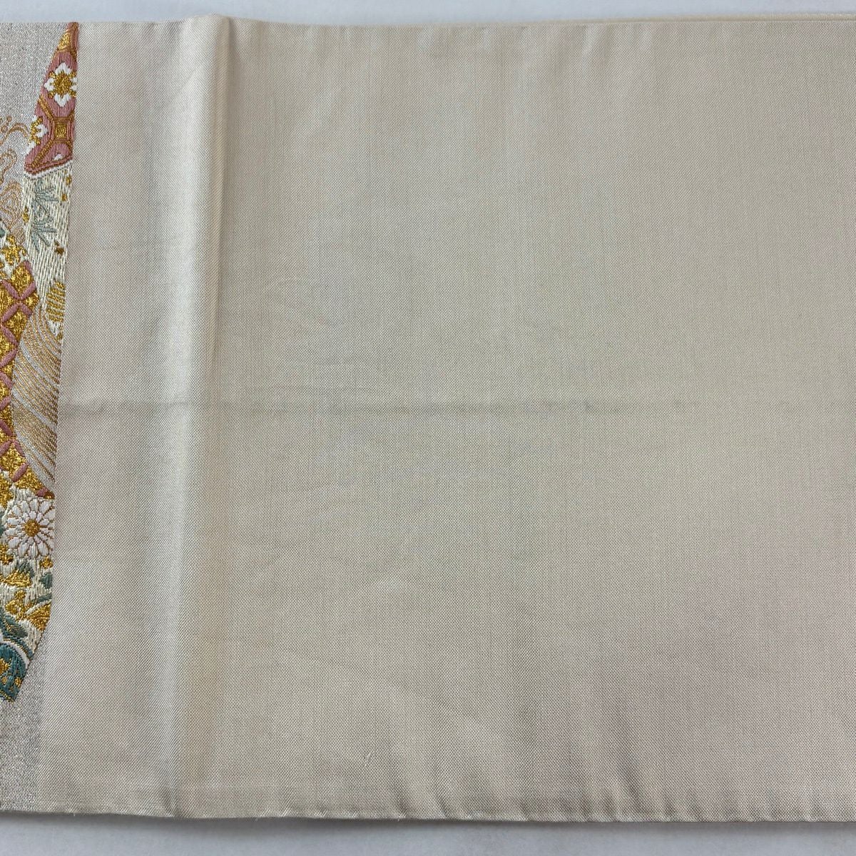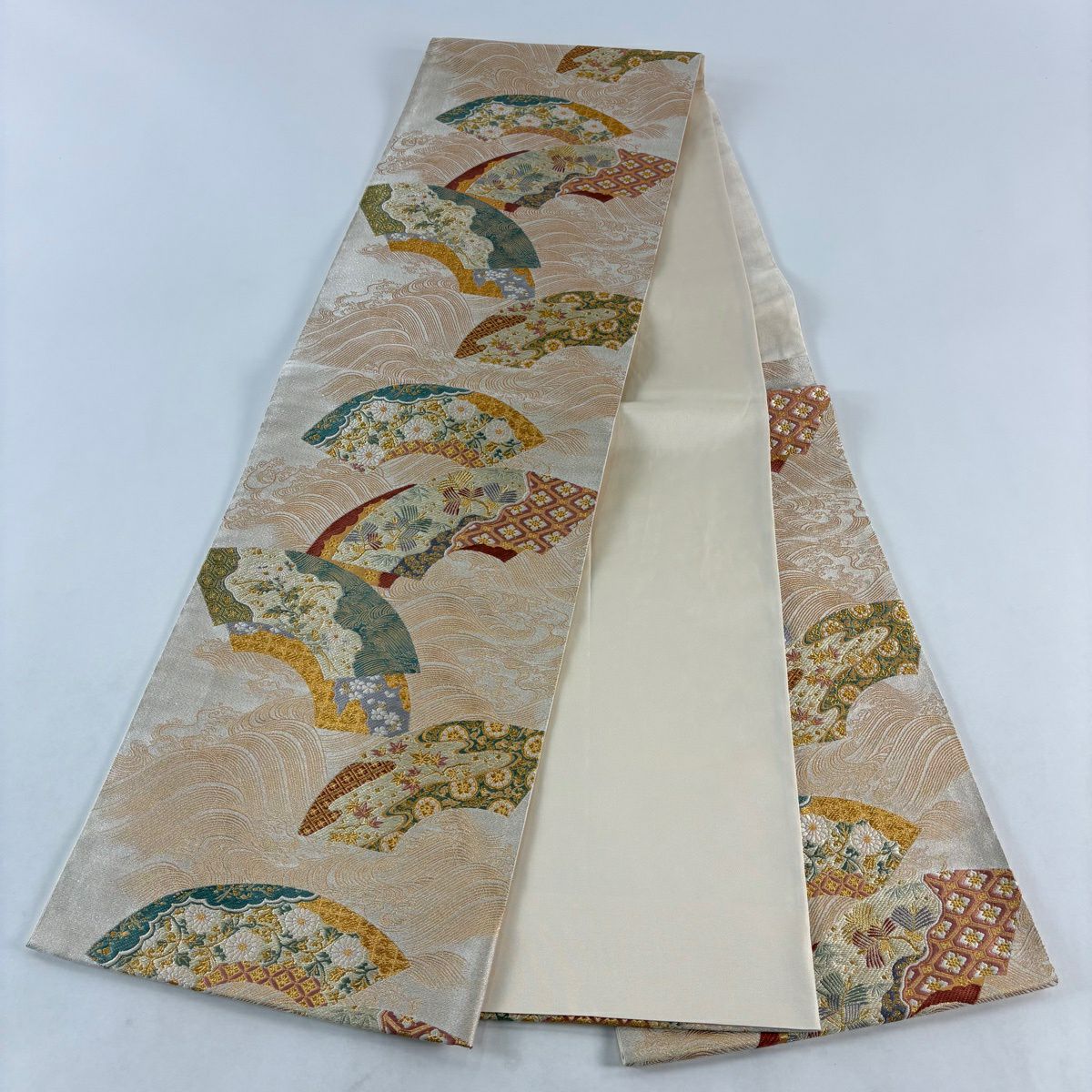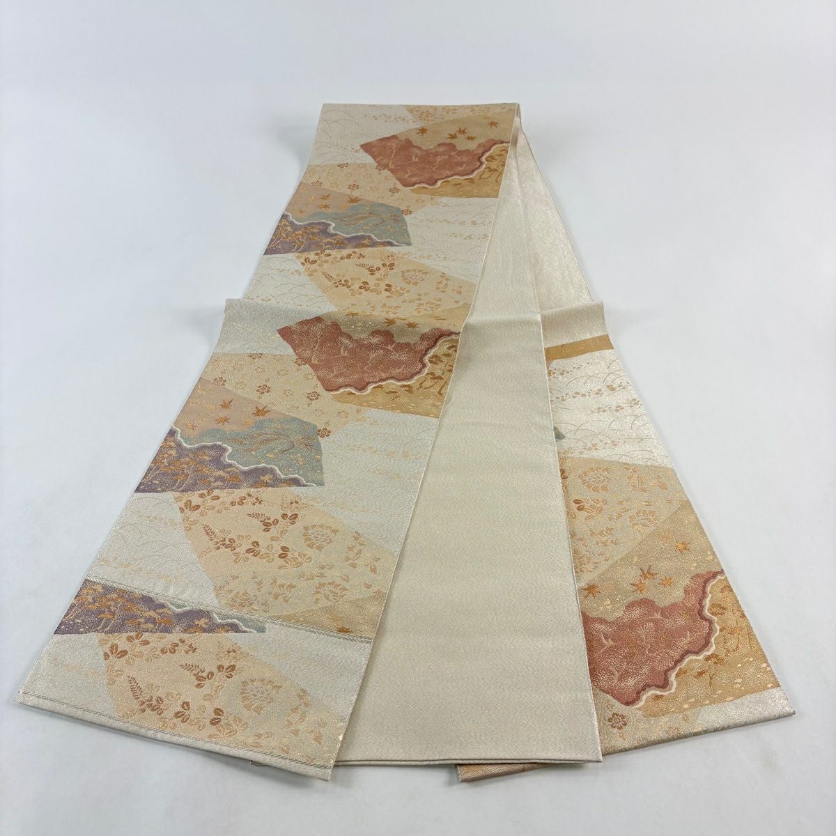 袋帯 秀品 朱雀つづれ 扇面 草花 箔 金糸 ベージュ 六通 正絹