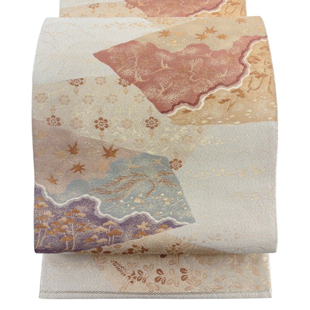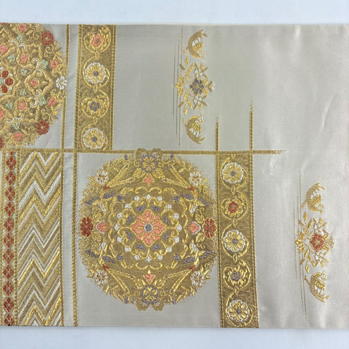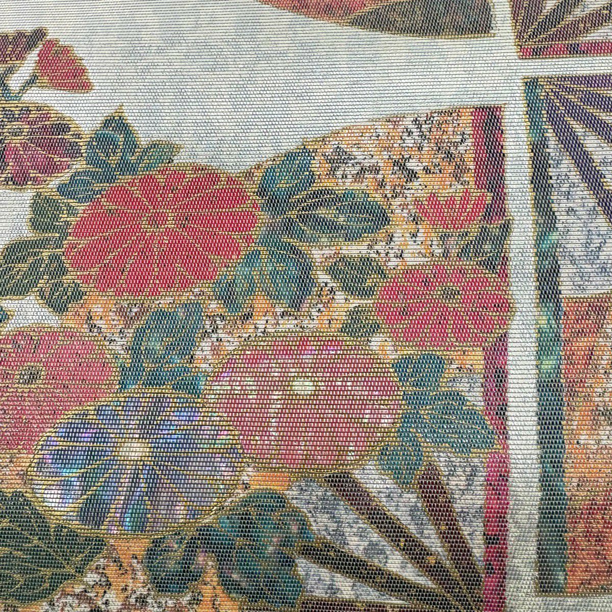 袋帯 秀品 朱雀つづれ 扇面 草花 箔 金糸 ベージュ 六通 正絹