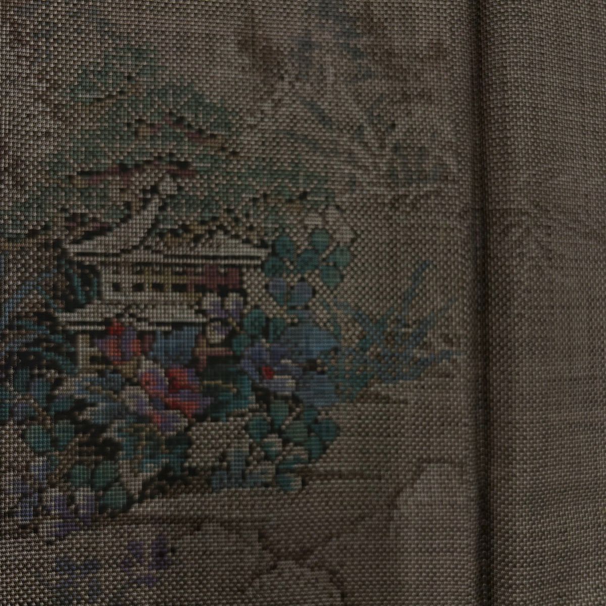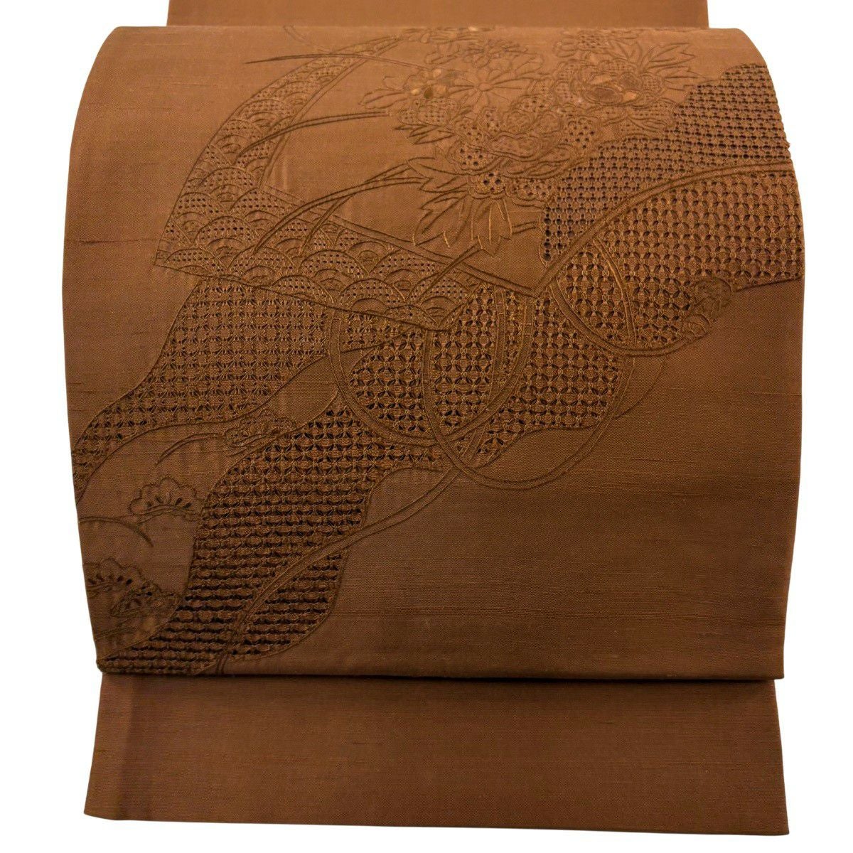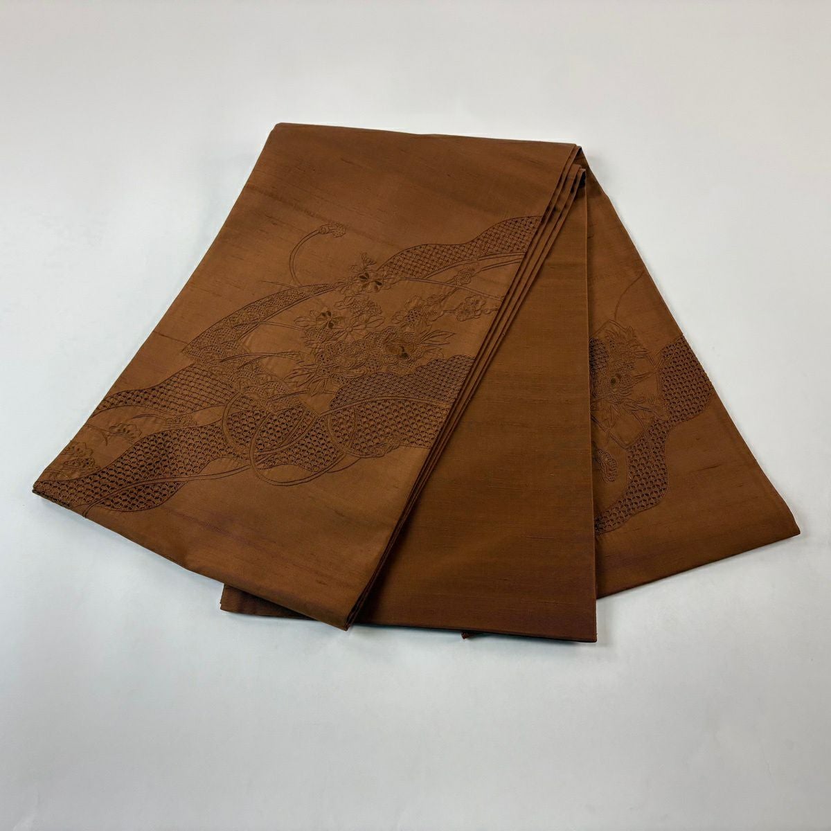 【美品】 袋帯 秀品 蘇州刺繍 紬地 扇面 草花 茶色 お太鼓柄 正絹