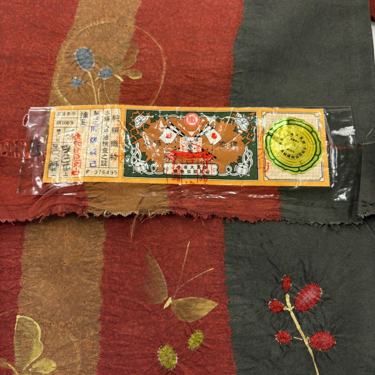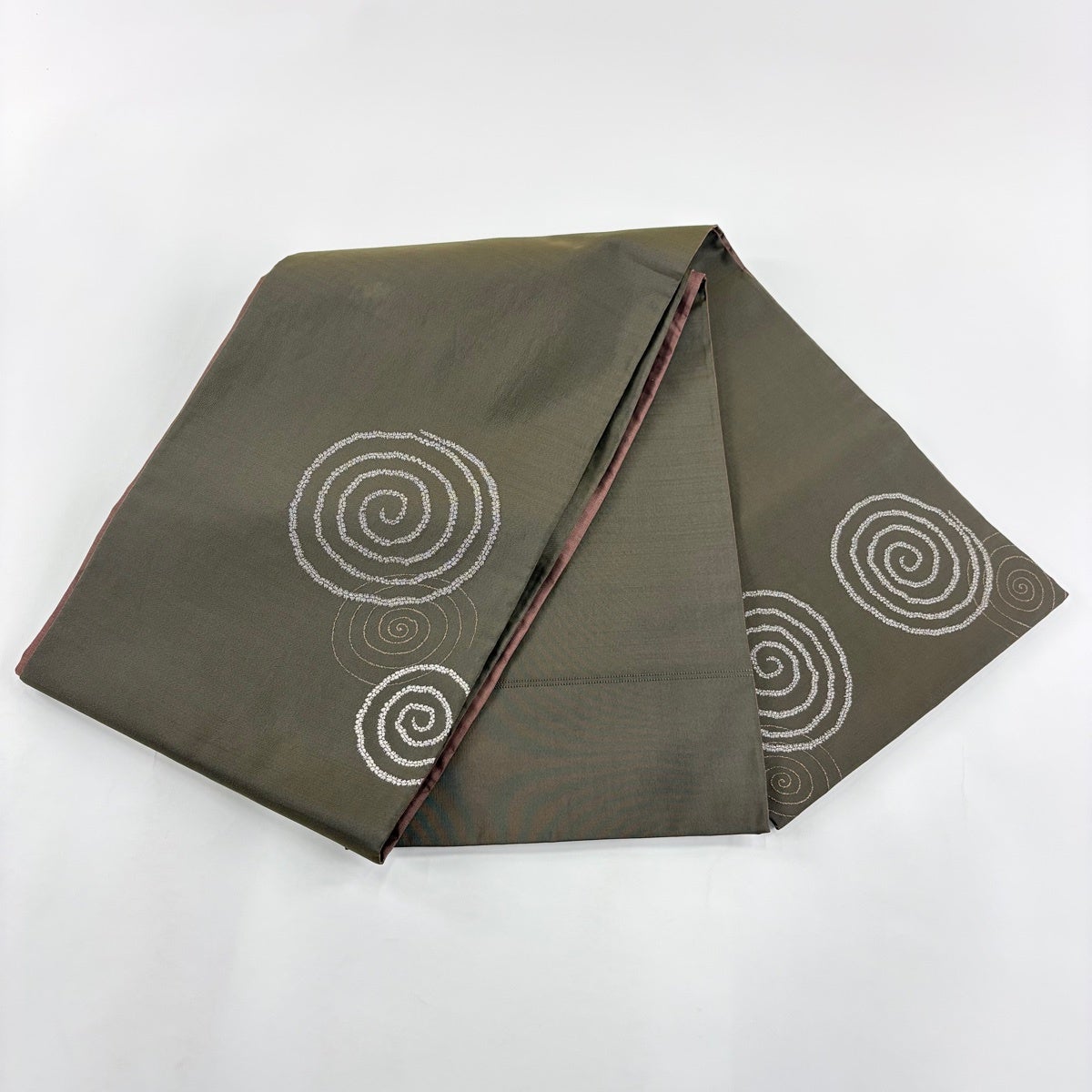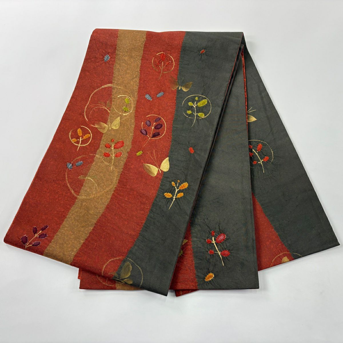 【美品】 袋帯 秀品 蘇州刺繍 紬地 扇面 草花 茶色 お太鼓柄 正絹