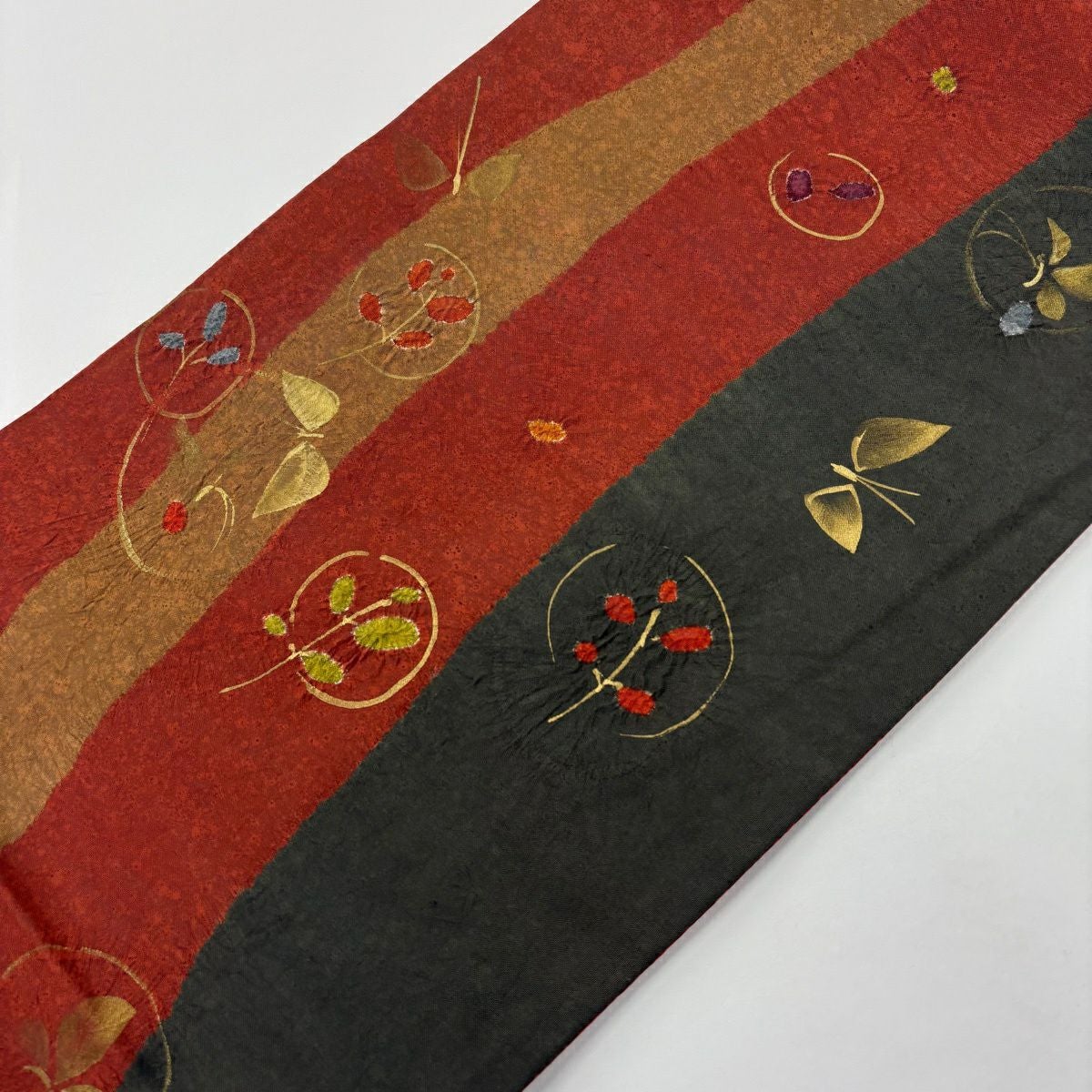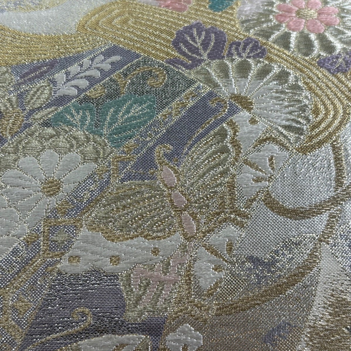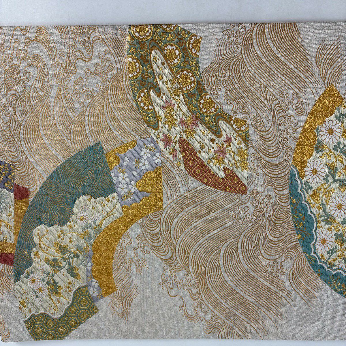 袋帯 秀品 落款あり 風物扇面散し 扇 草花 金糸 箔 金色 六通 正絹