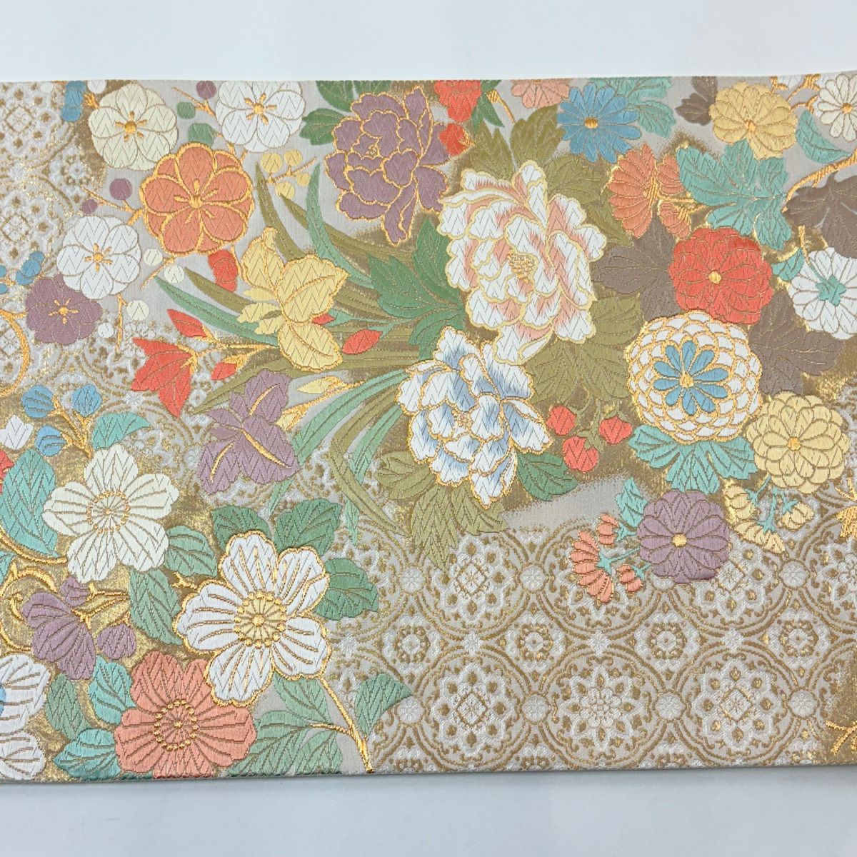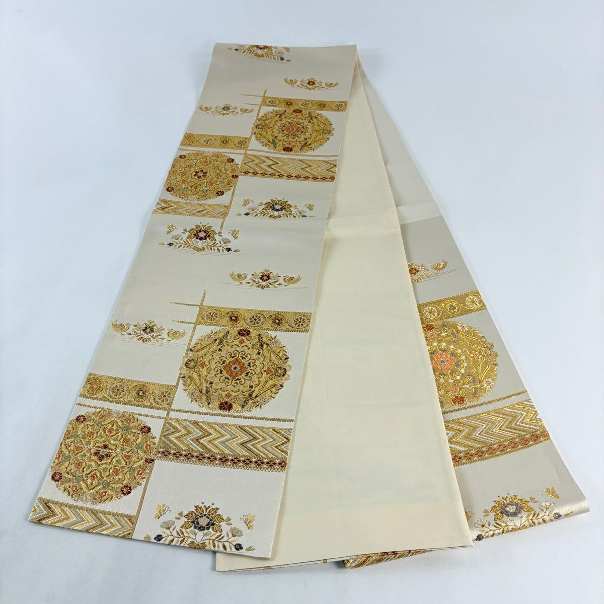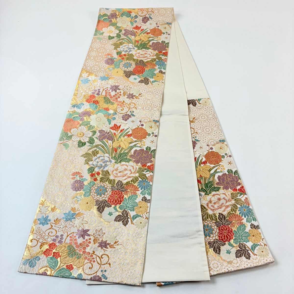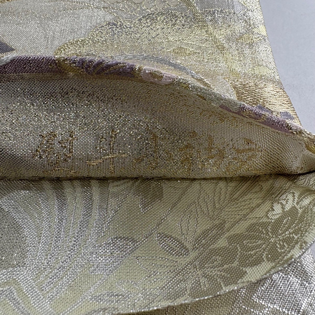 【美品】 袋帯 秀品 名匠華千種 草花 唐織 箔 クリーム 六通 正絹