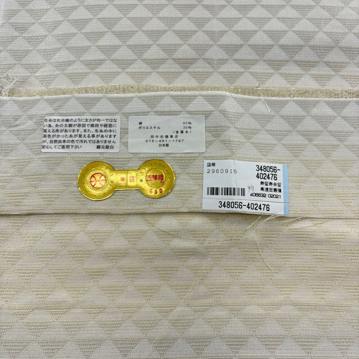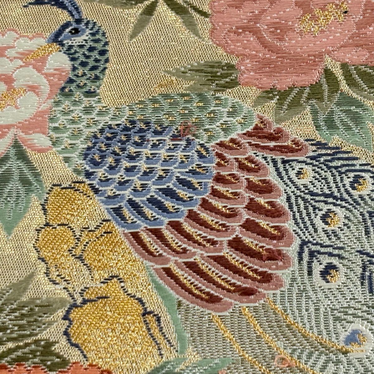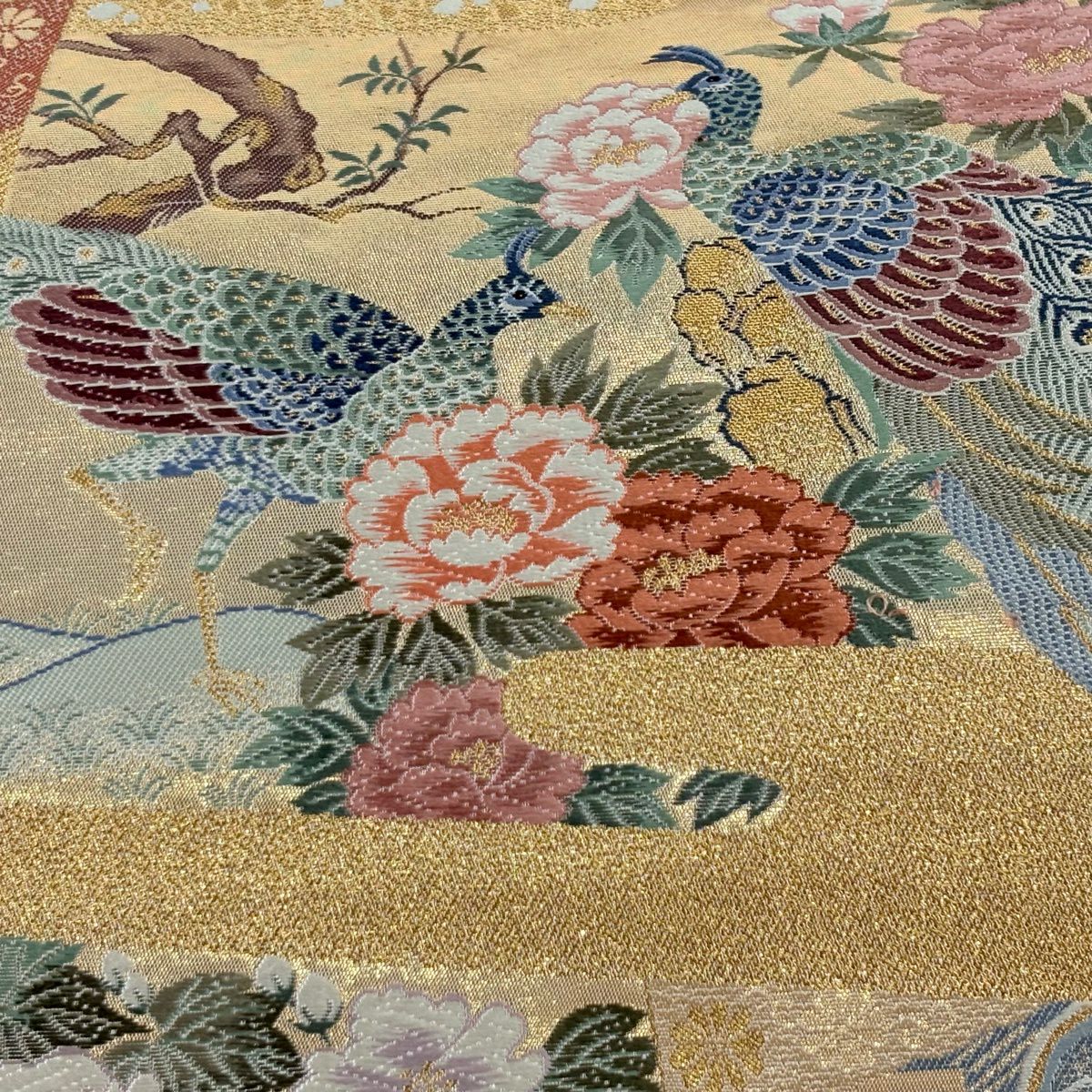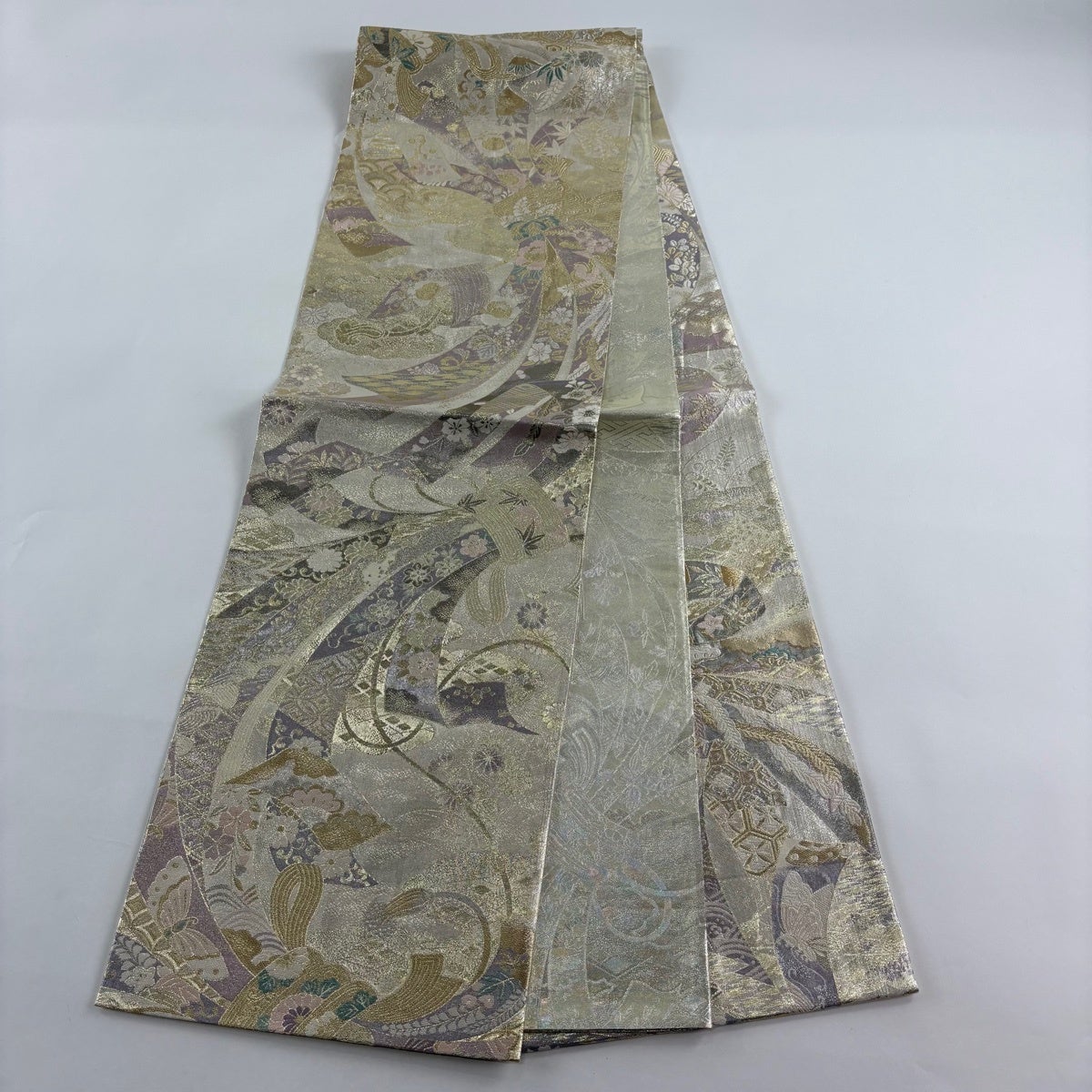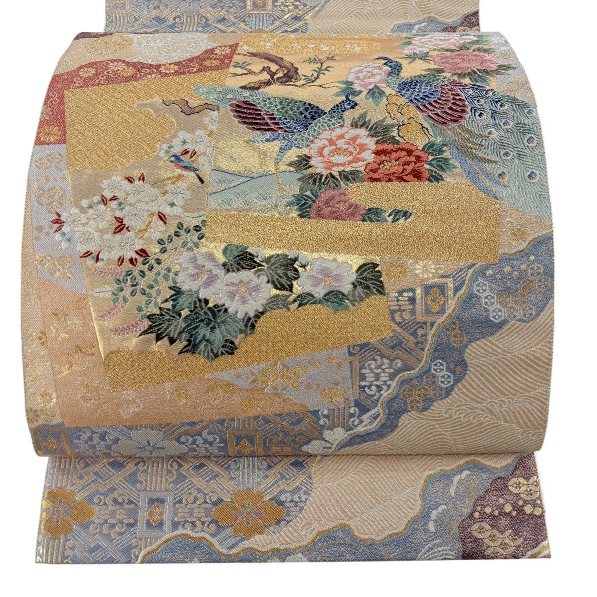 【美品】 袋帯 秀品 能衣色紙孔雀 箔 唐織 ベージュ 六通 正絹