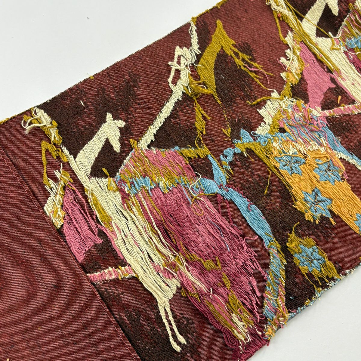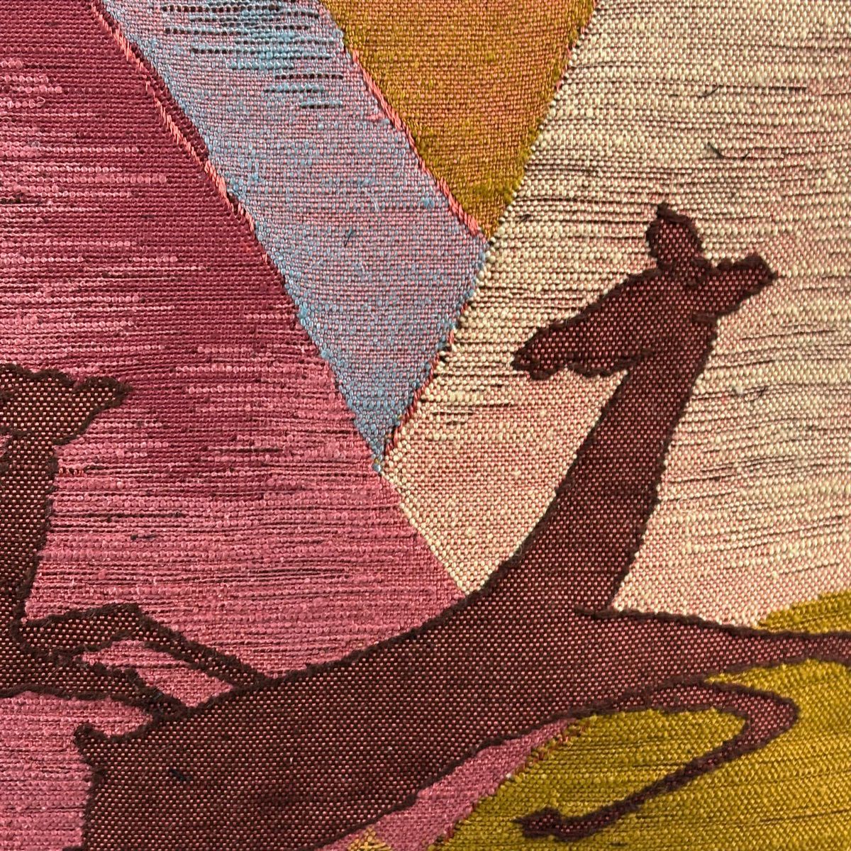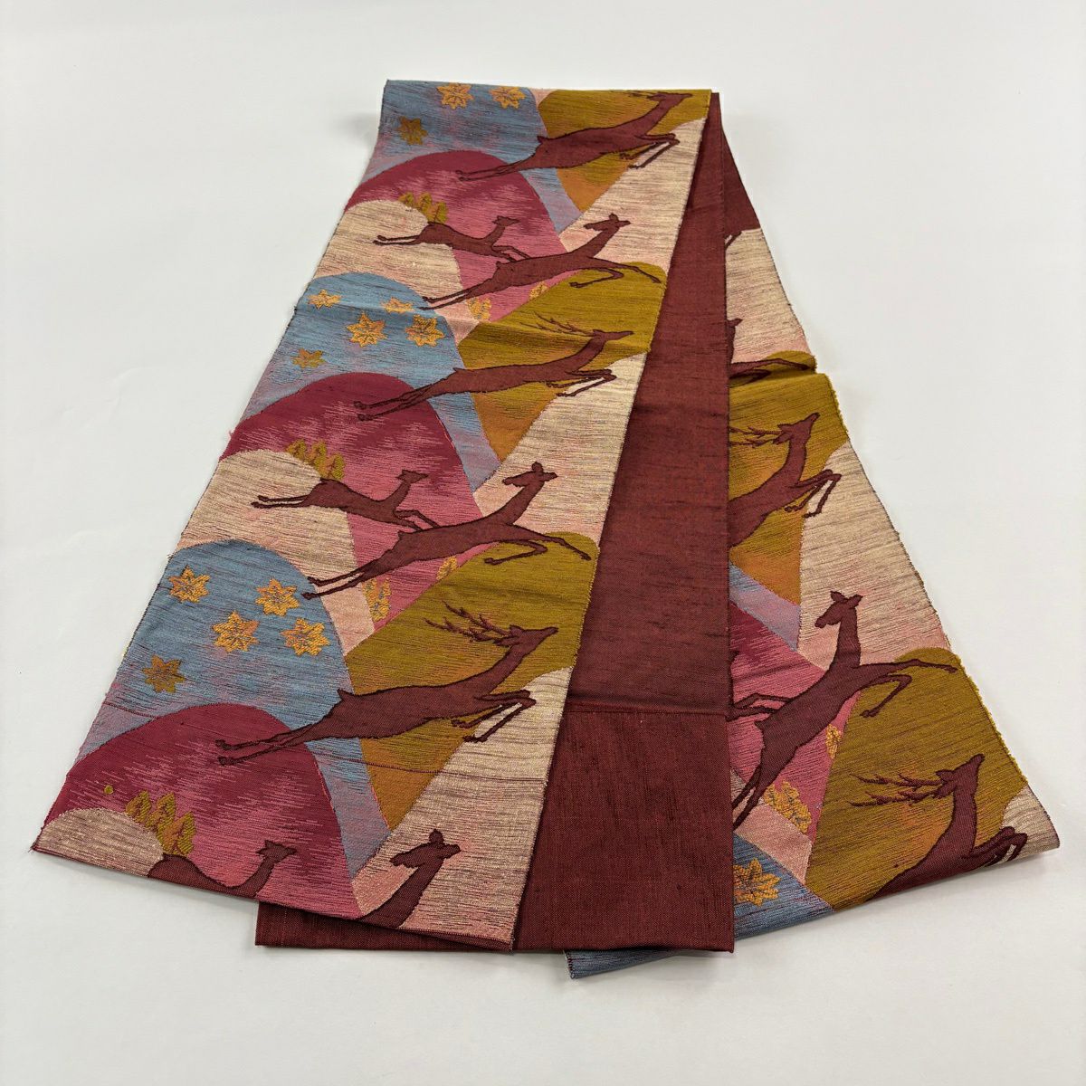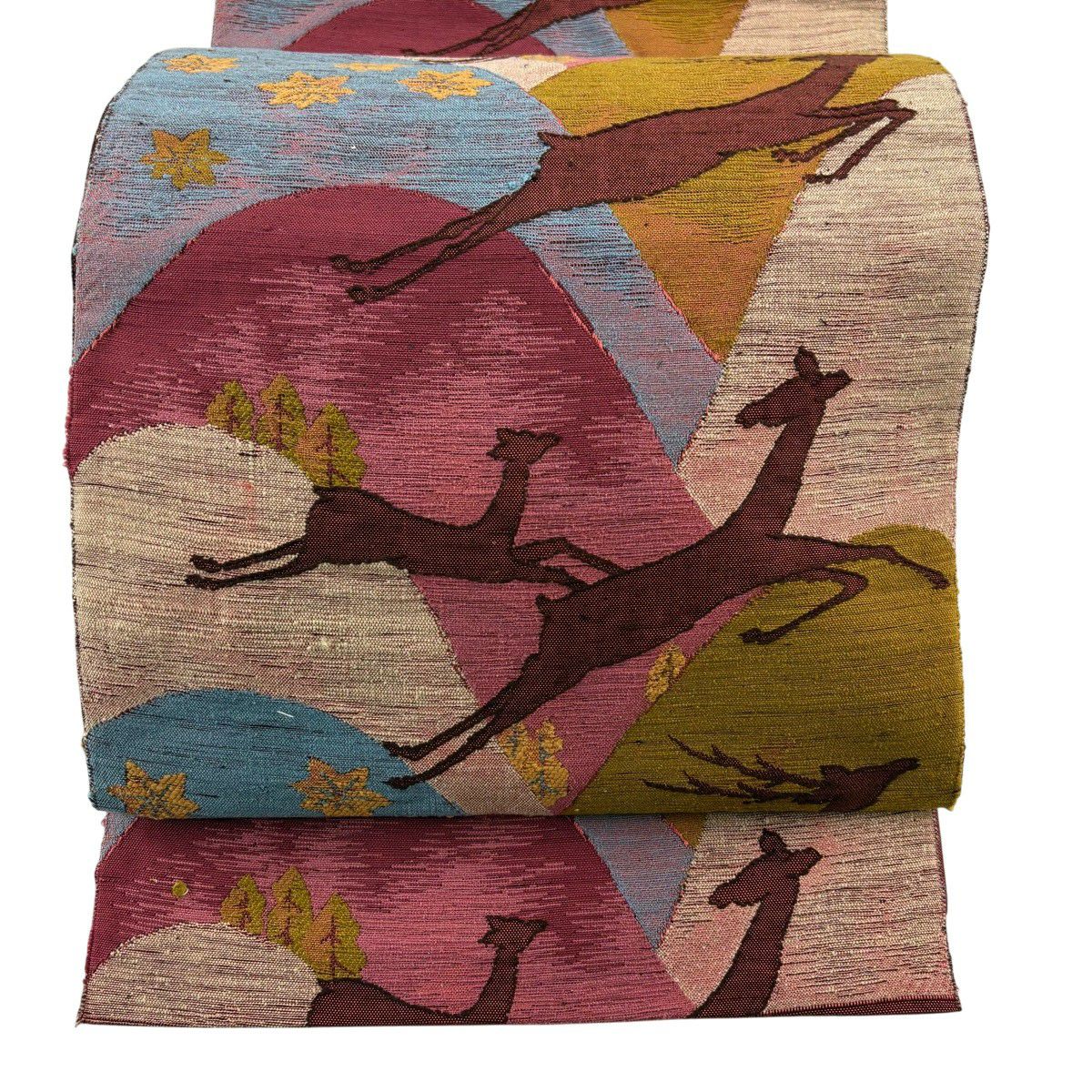 【美品】 名古屋帯 秀品 松葉仕立て 八寸名古屋帯 山 動物 えんじ色 正絹