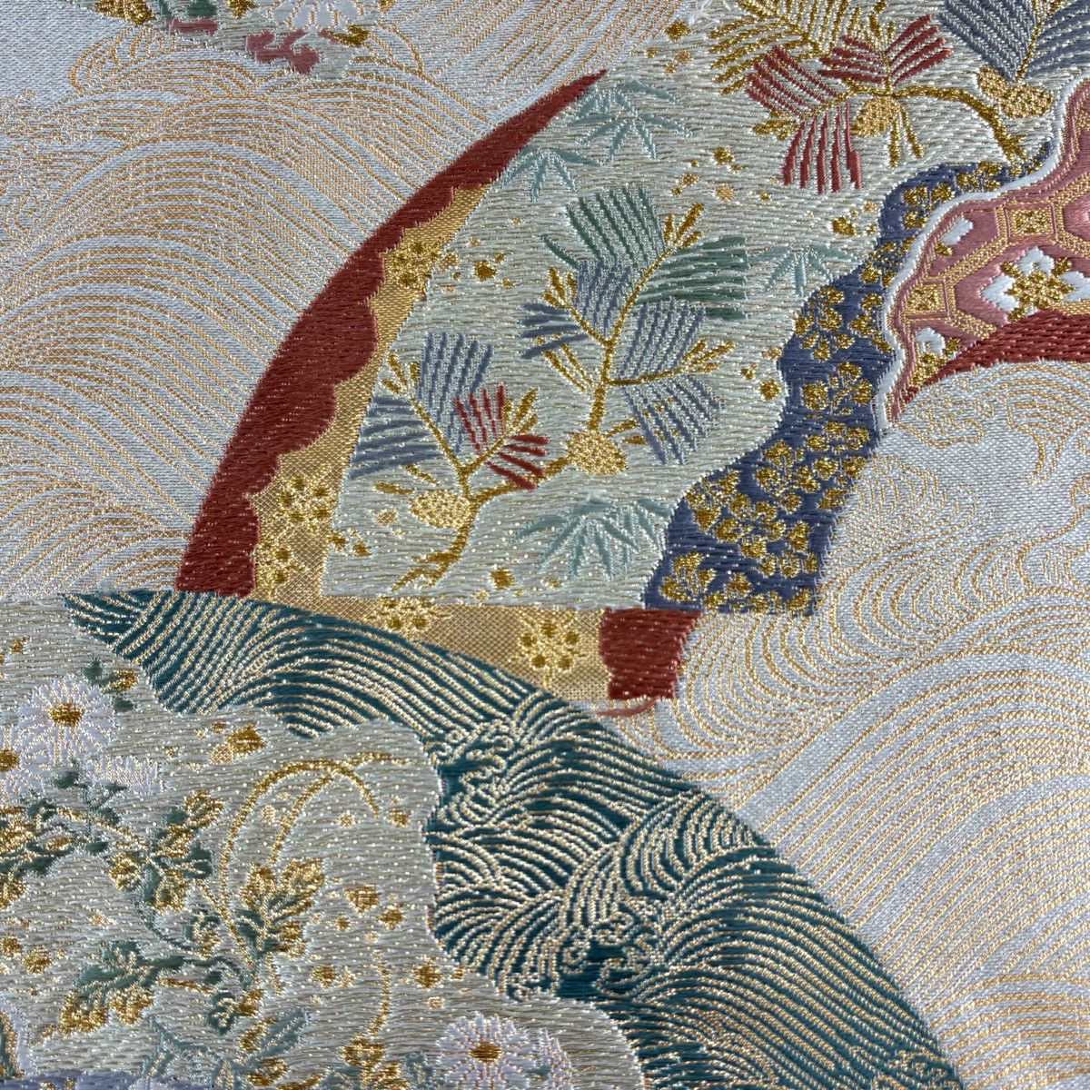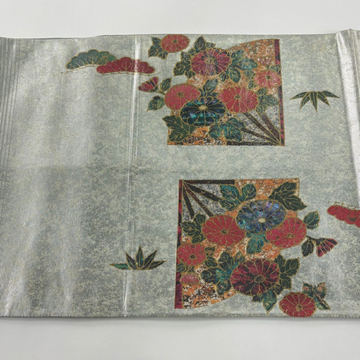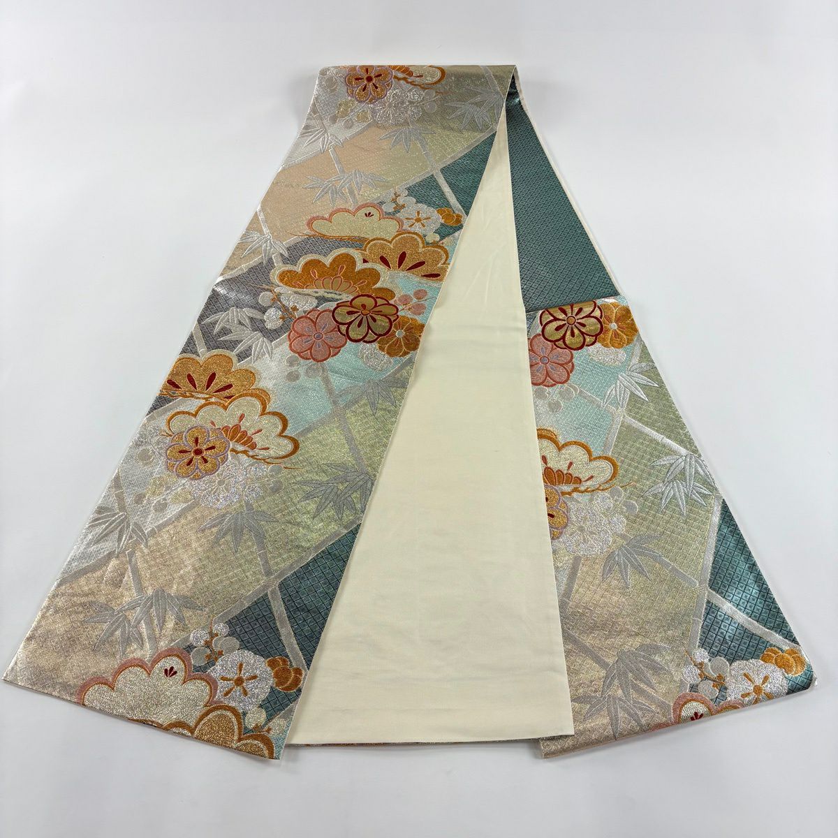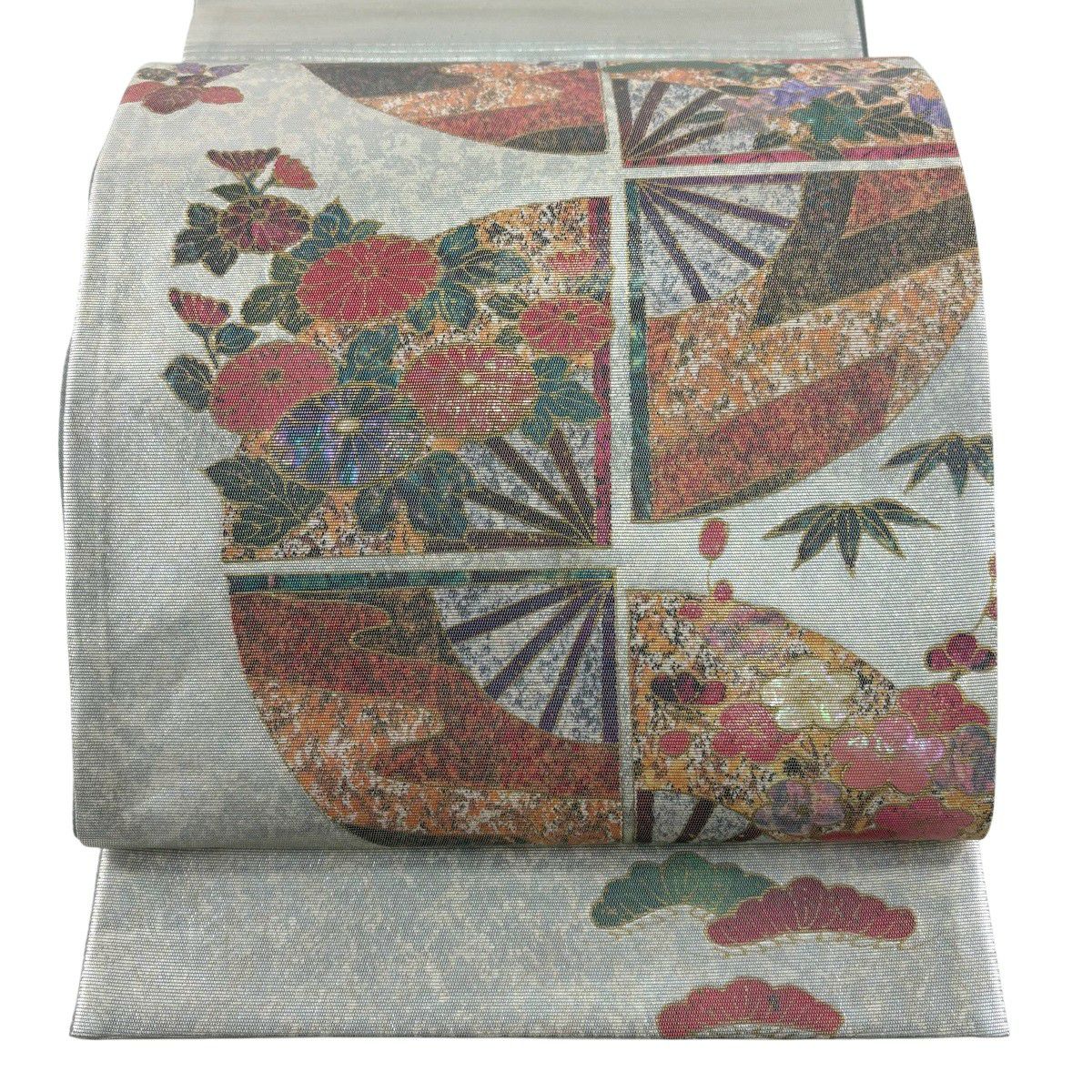 【美品】 袋帯 秀品 扇 松竹梅 螺鈿箔 金差し 銀色 お太鼓柄 正絹
