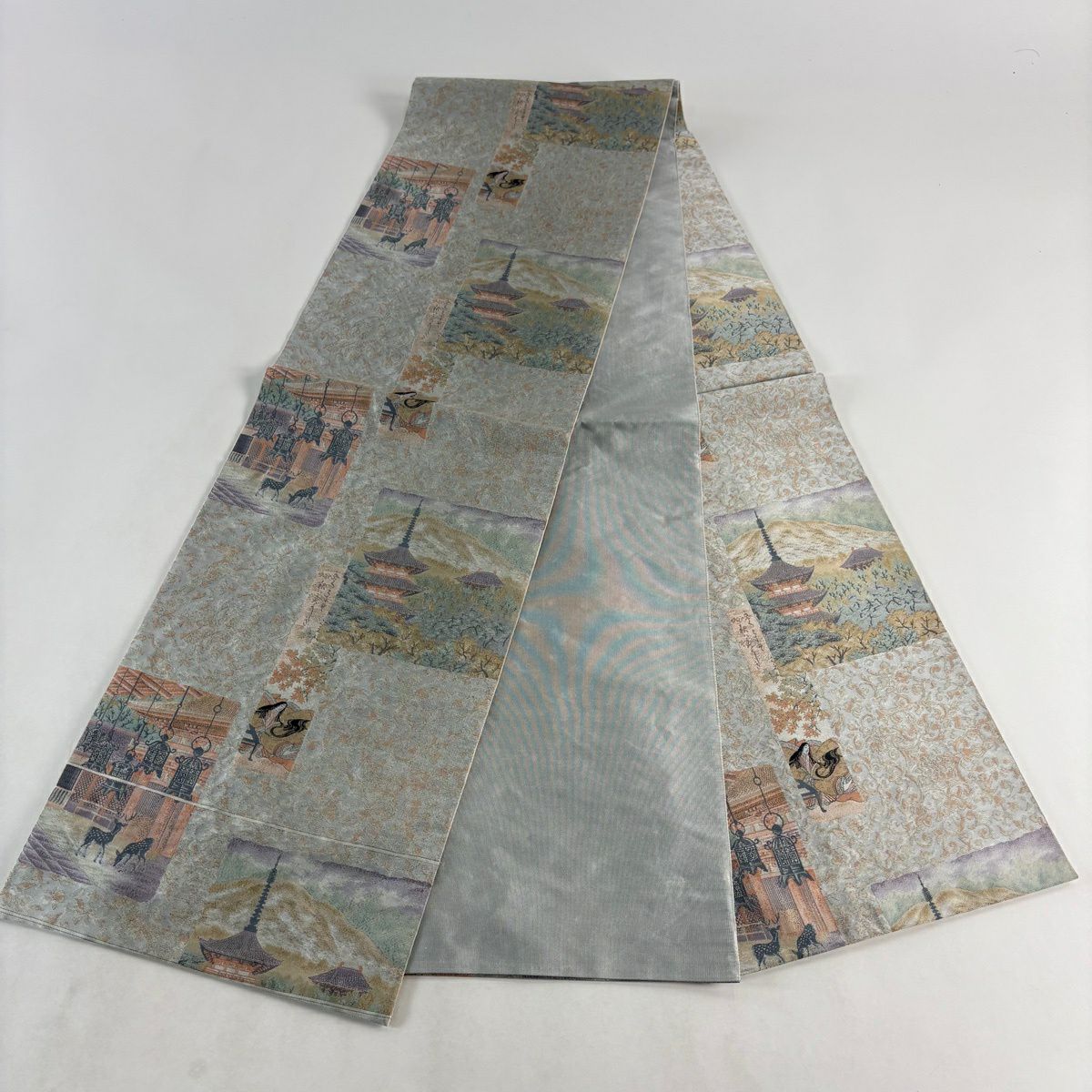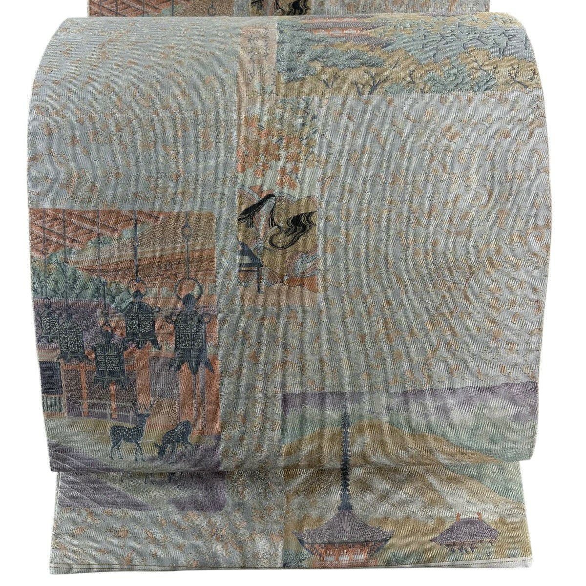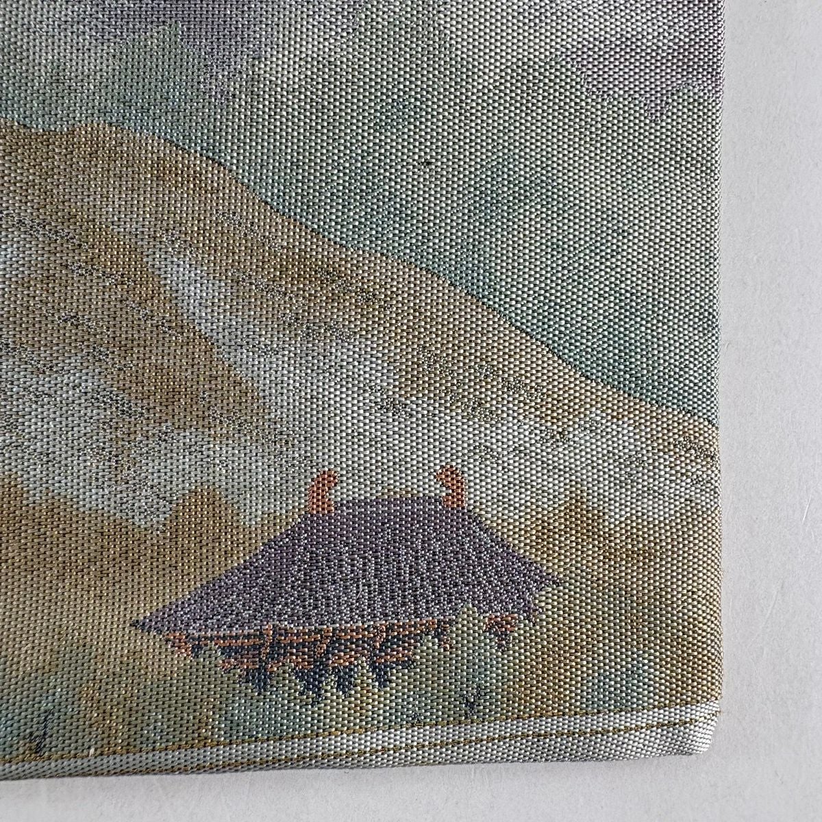 袋帯 秀品 落款あり 萬葉 関西仕立て 風景 人物 青灰色 全通 正絹