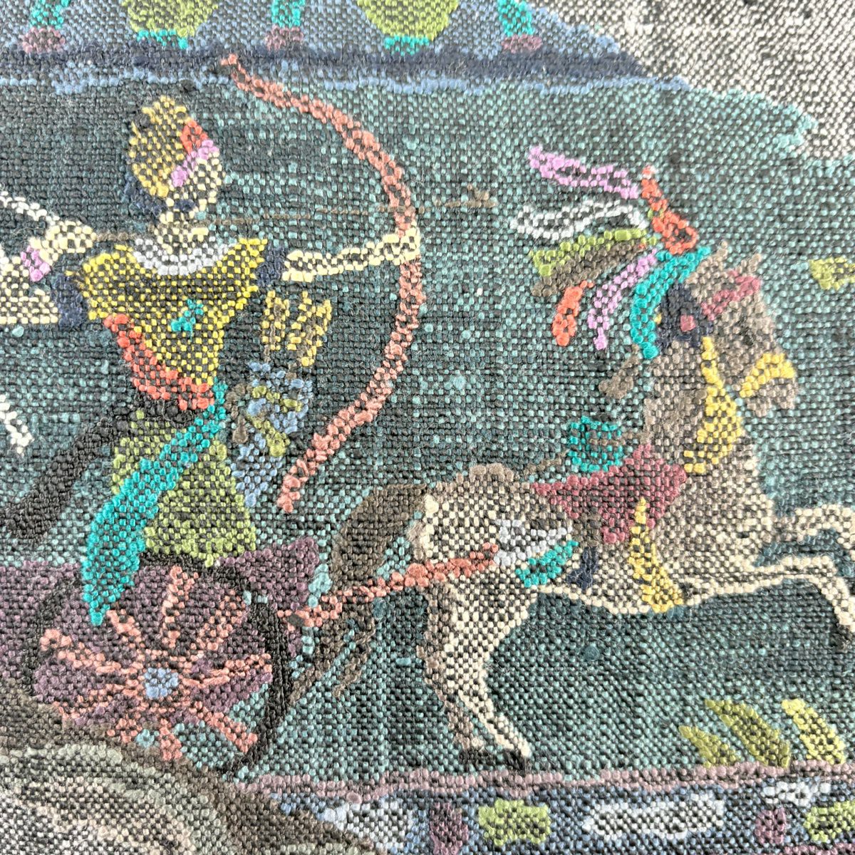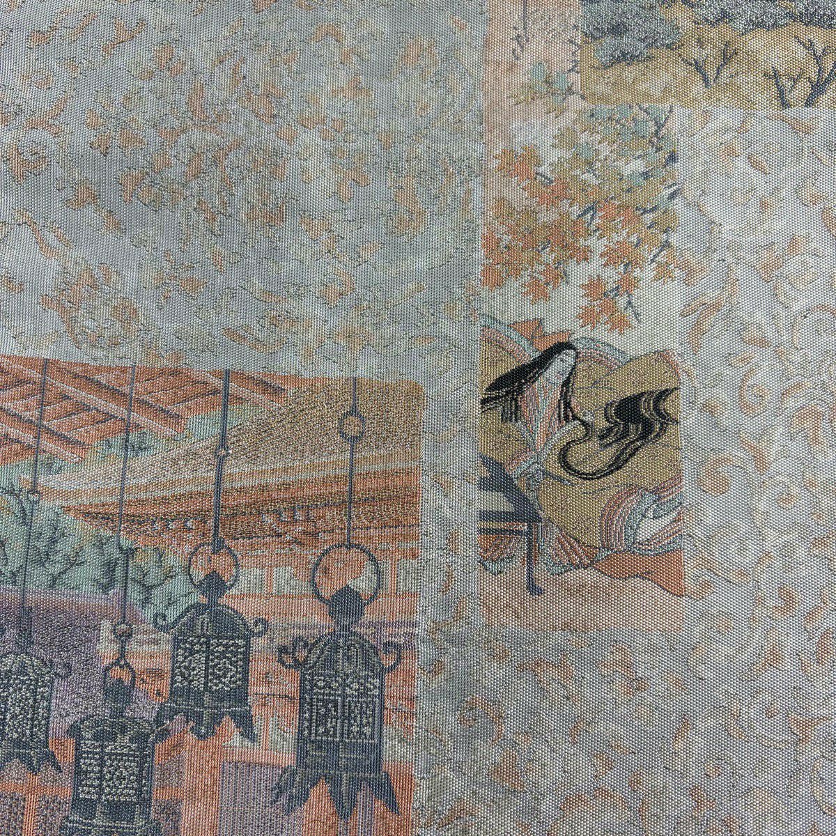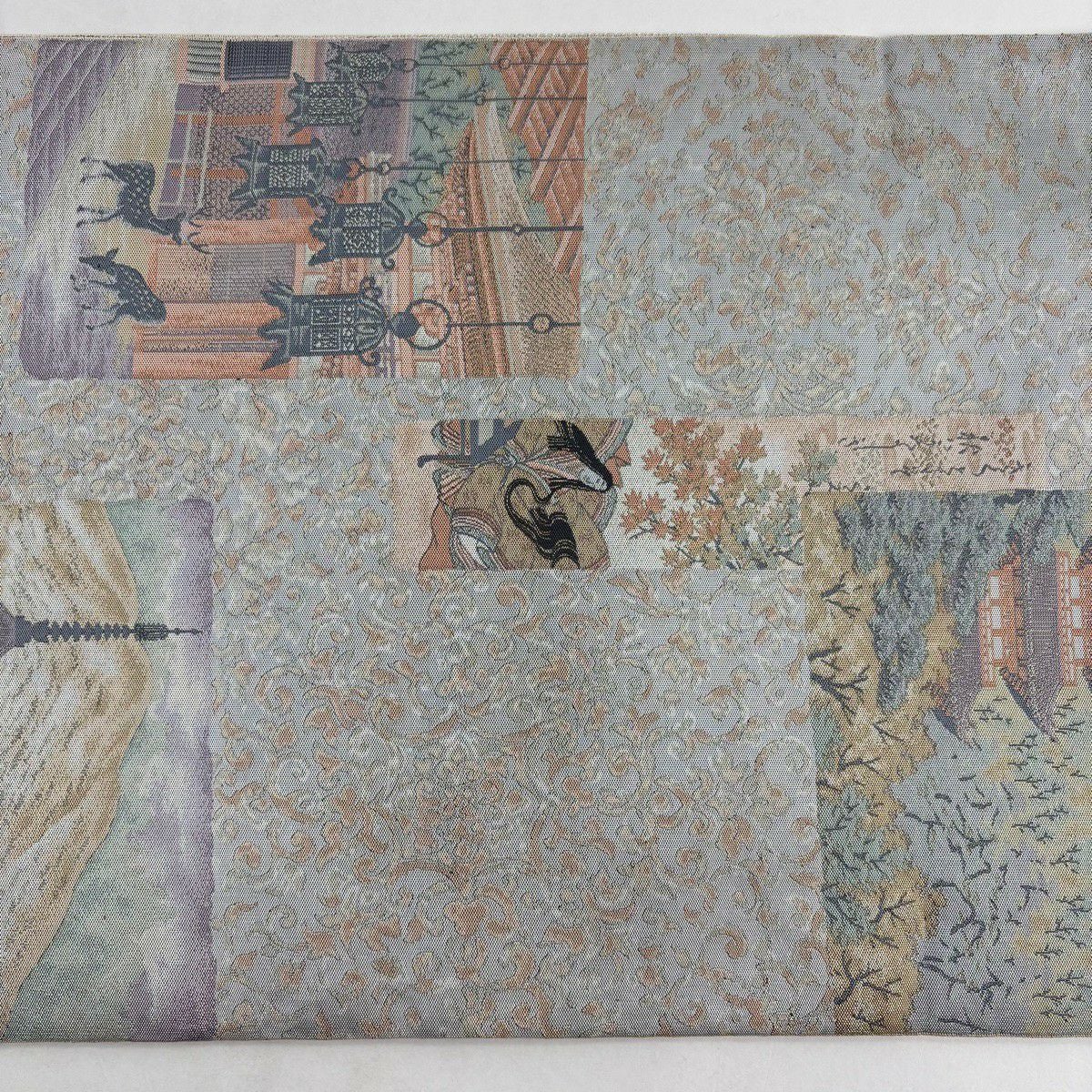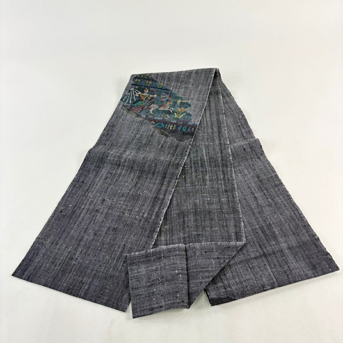 袋帯 秀品 落款あり 萬葉 関西仕立て 風景 人物 青灰色 全通 正絹