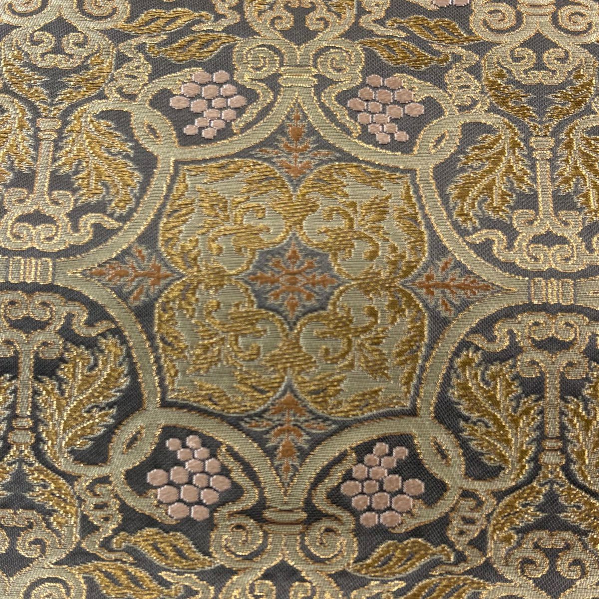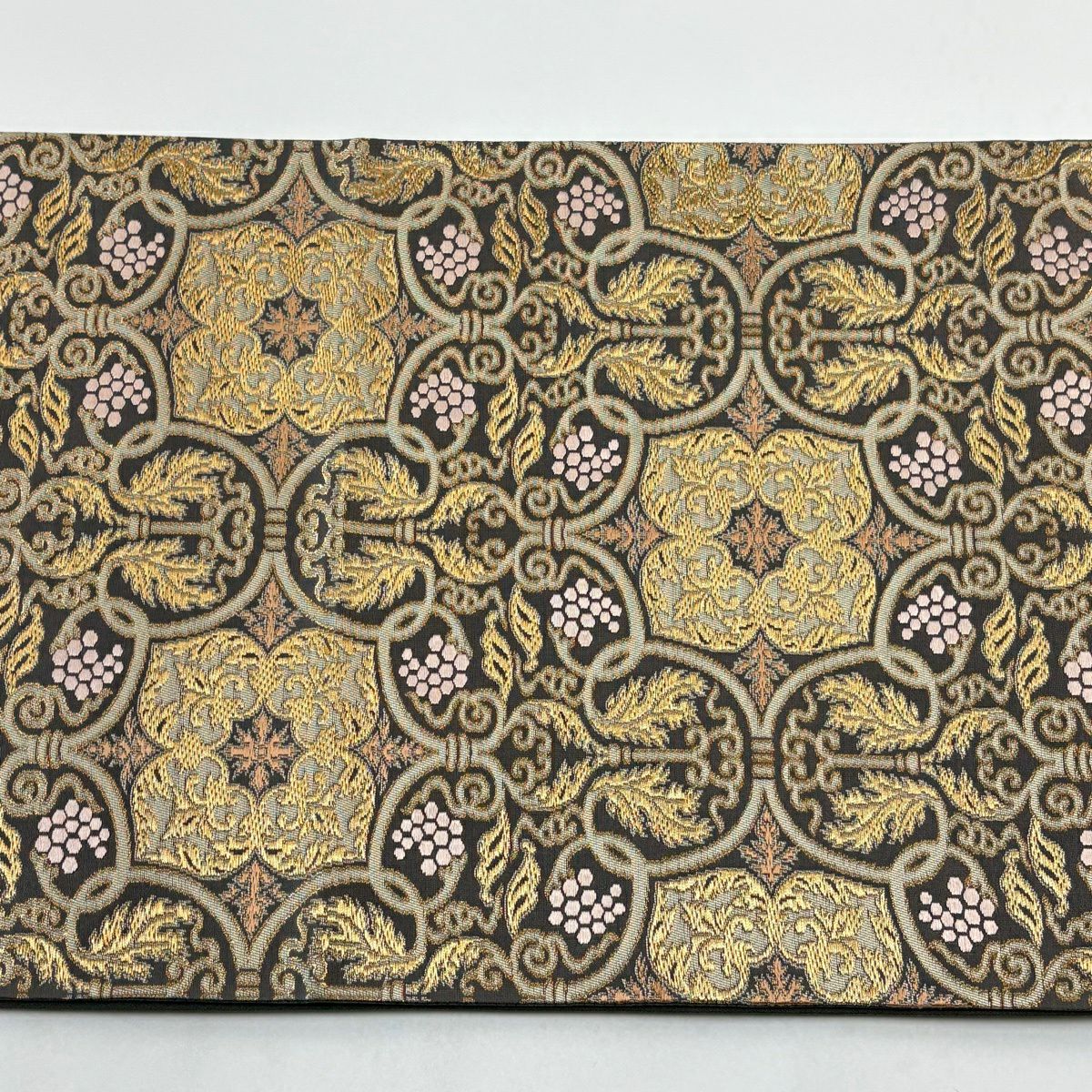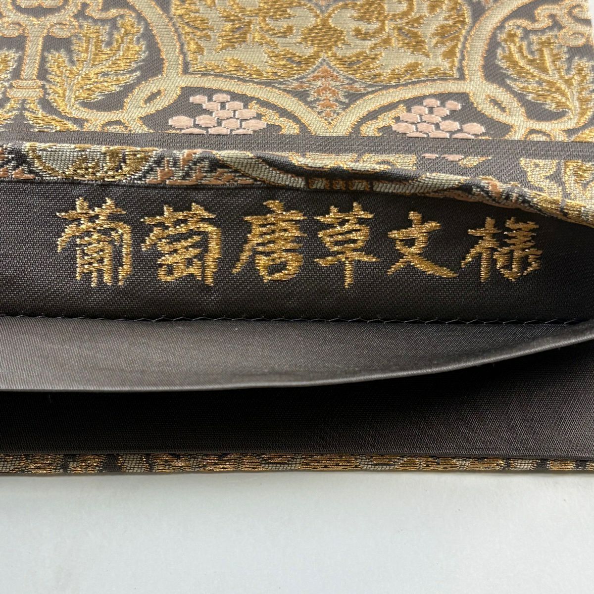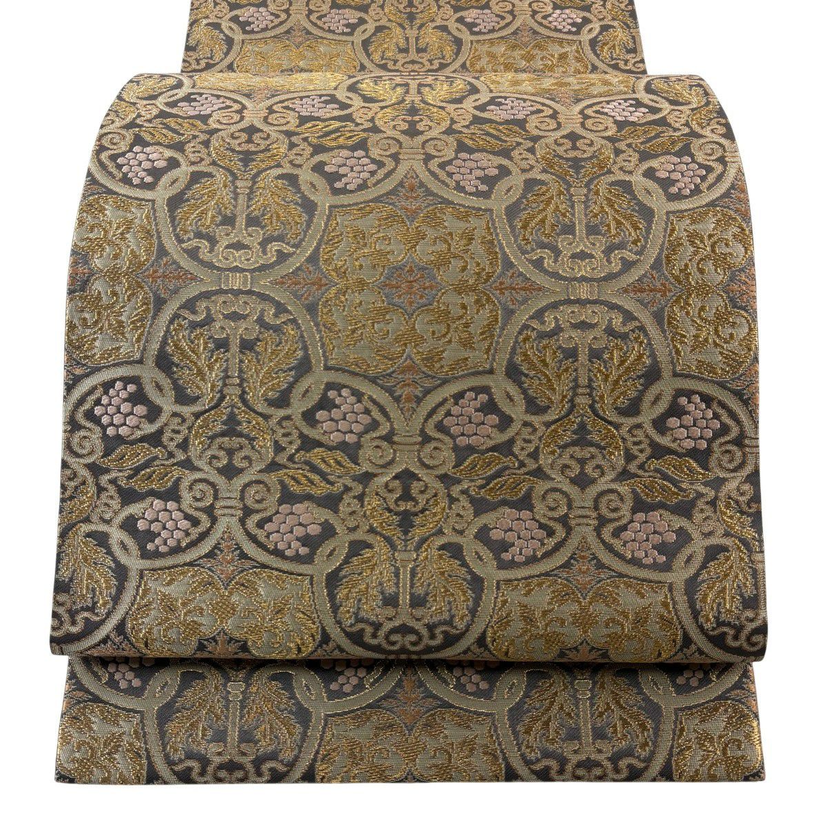 【美品】 袋帯 秀品 葡萄唐草文様 華文 刺繍 金糸 灰色 六通 正絹