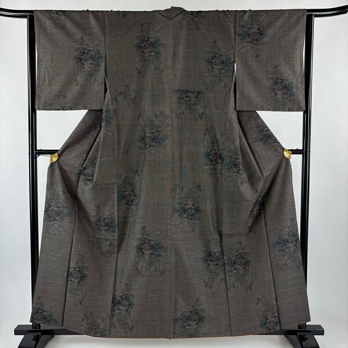 紬 身丈159cm 裄丈64cm M 袷 建物 草花 焦茶色 正絹 秀品