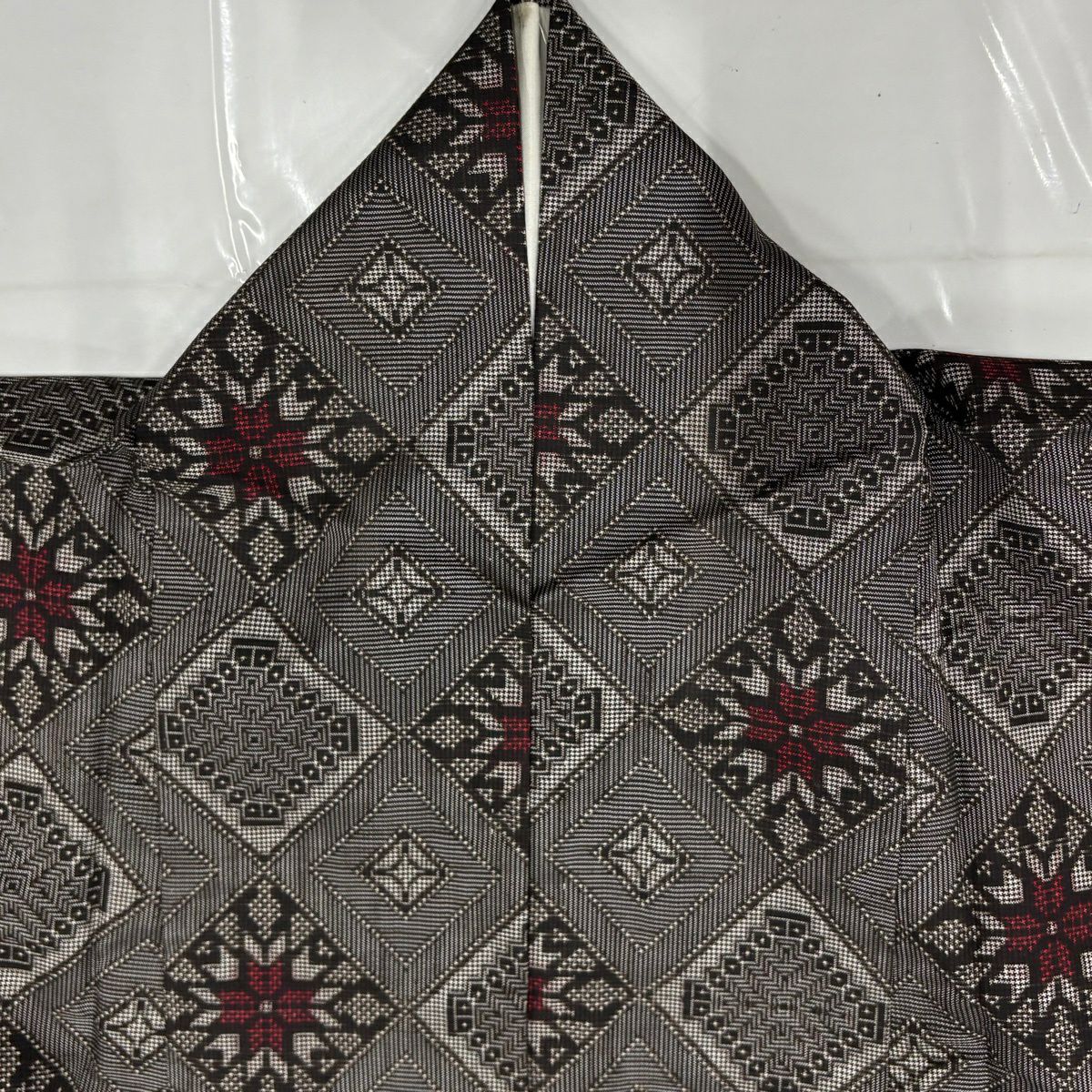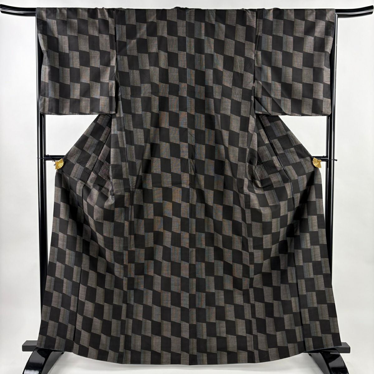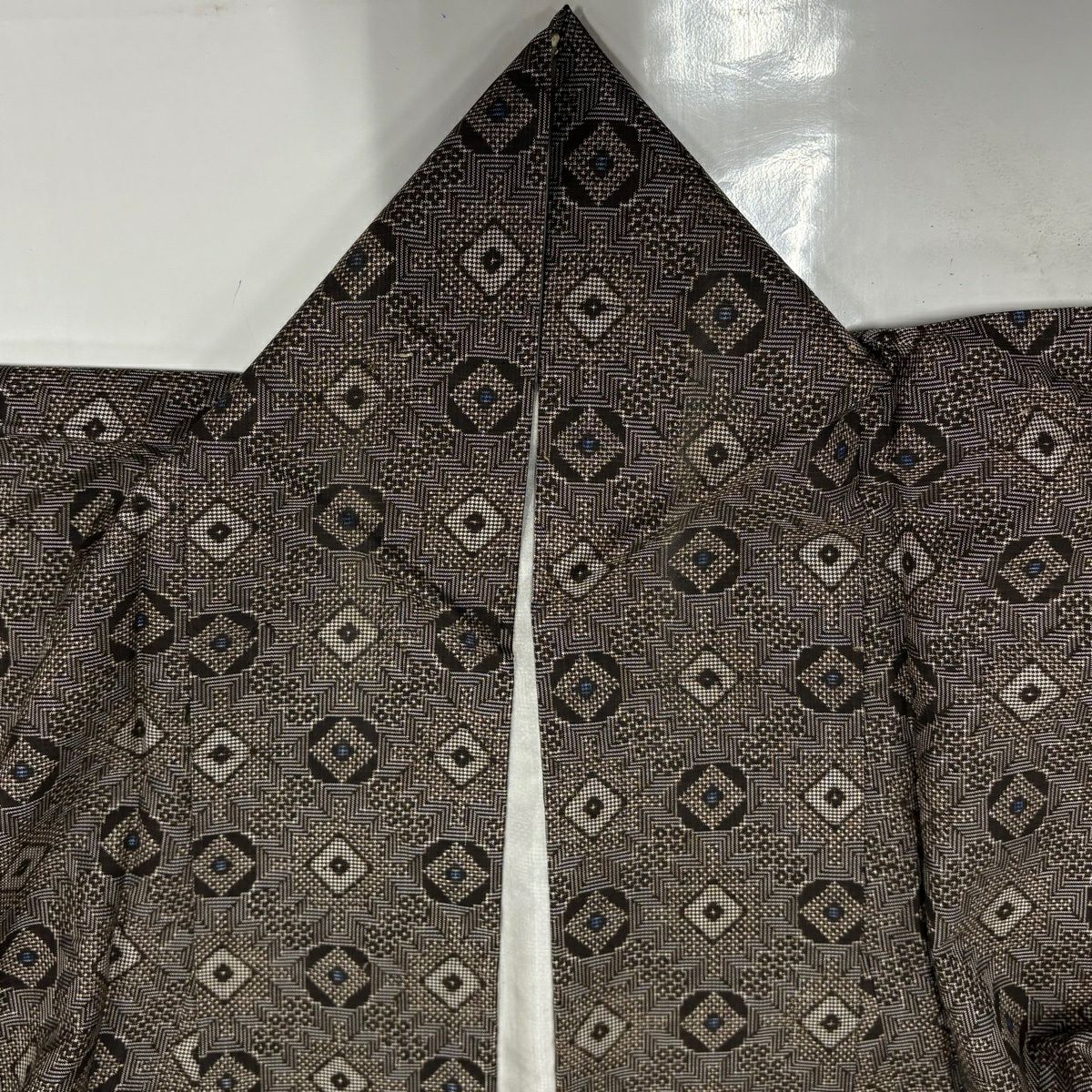 紬 身丈163.5cm 裄丈63.5cm S 袷 幾何学模様 焦茶色 正絹 秀品
