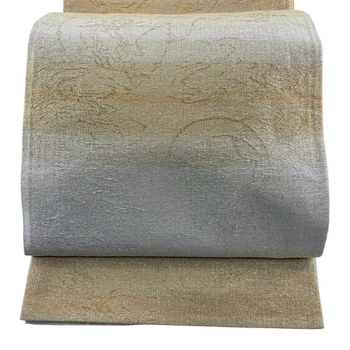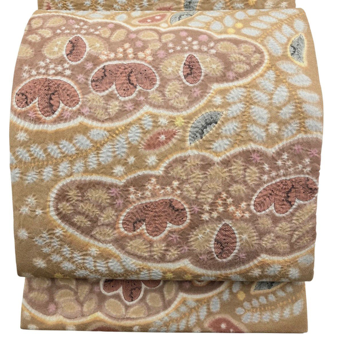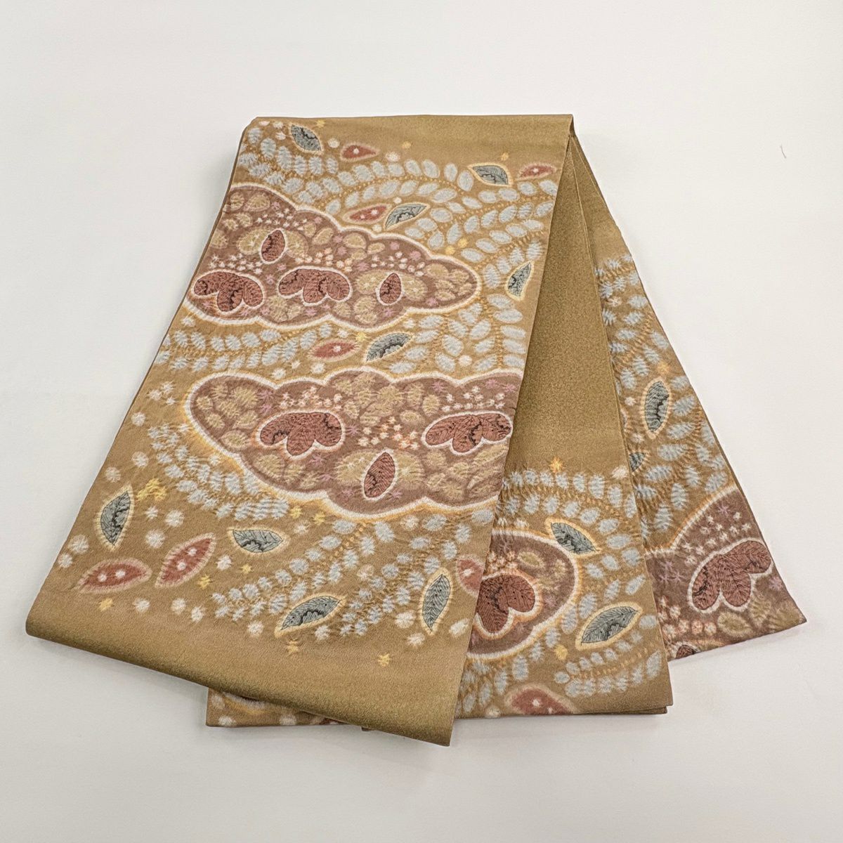 【美品】 名古屋帯 秀品 紬地 花唐草 金糸 刺繍 ベージュ 正絹