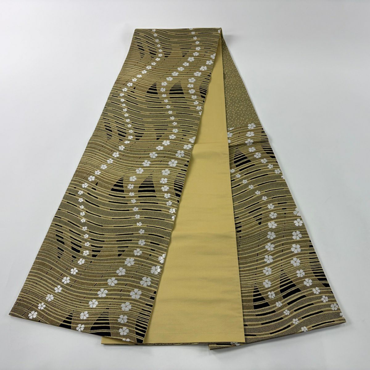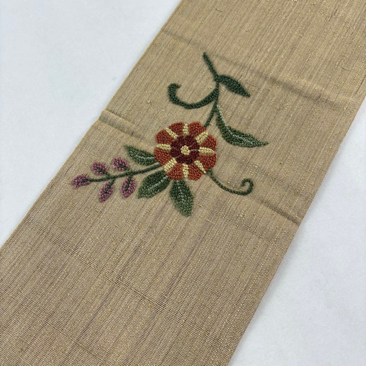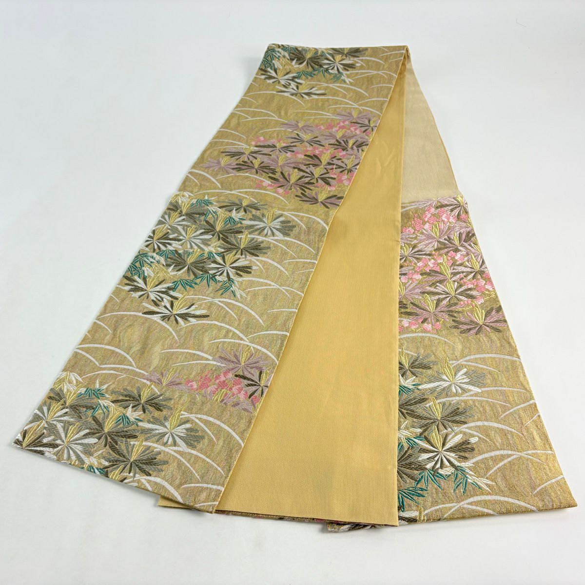 【美品】 名古屋帯 秀品 紬地 花唐草 金糸 刺繍 ベージュ 正絹