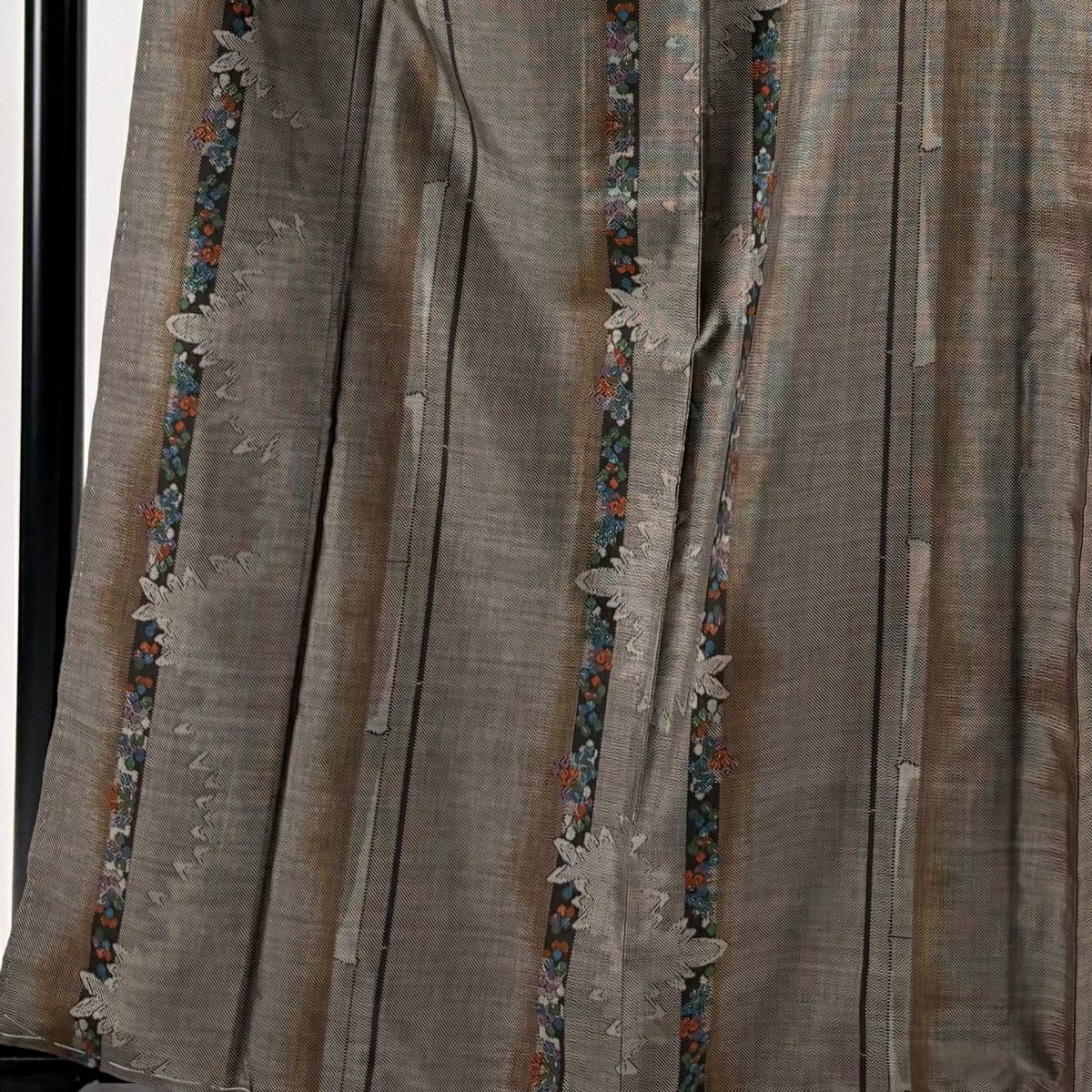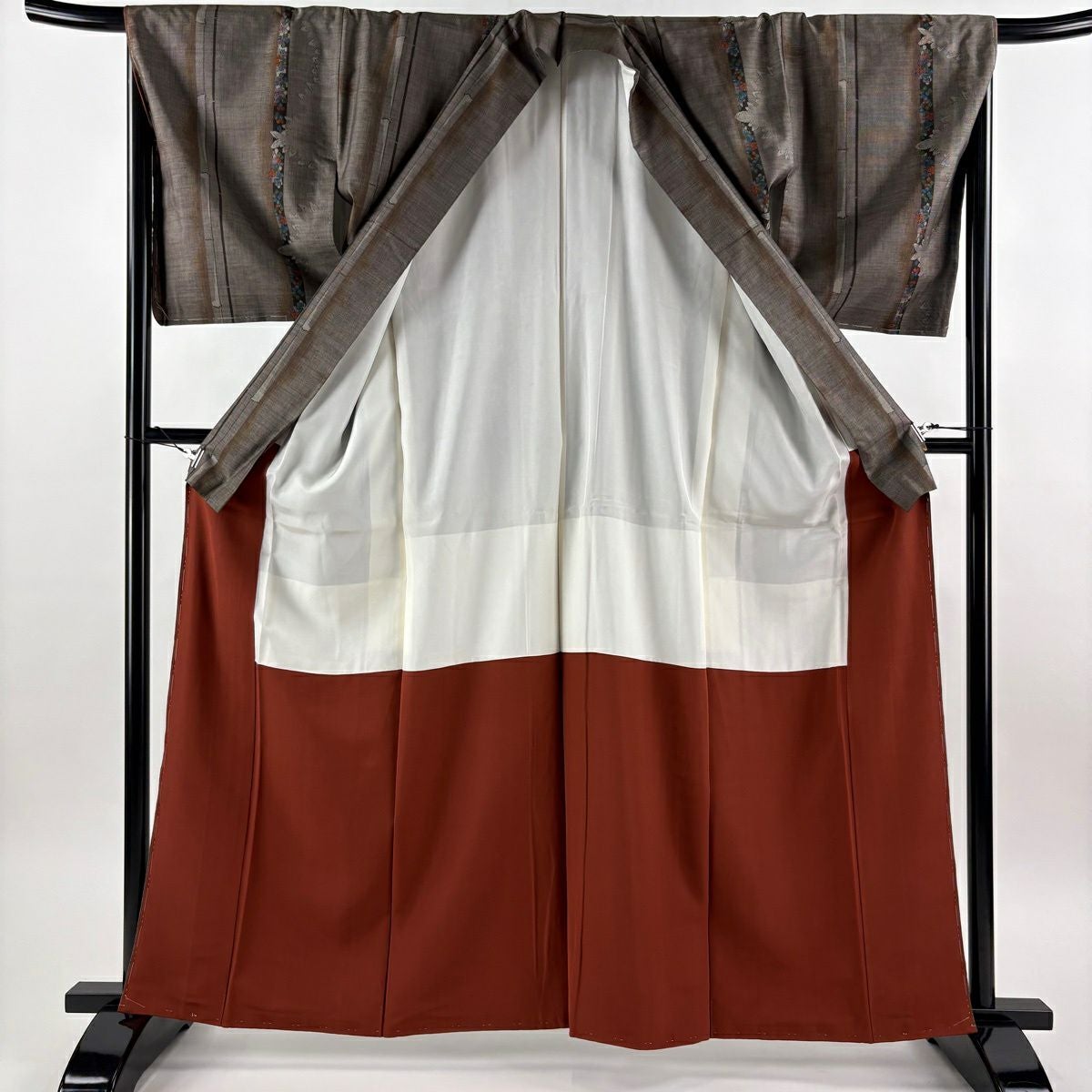 紬 身丈163cm 裄丈67cm M 袷 竹縞 草花 焦茶色 正絹 秀品