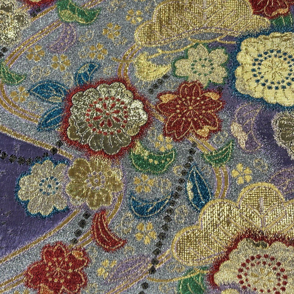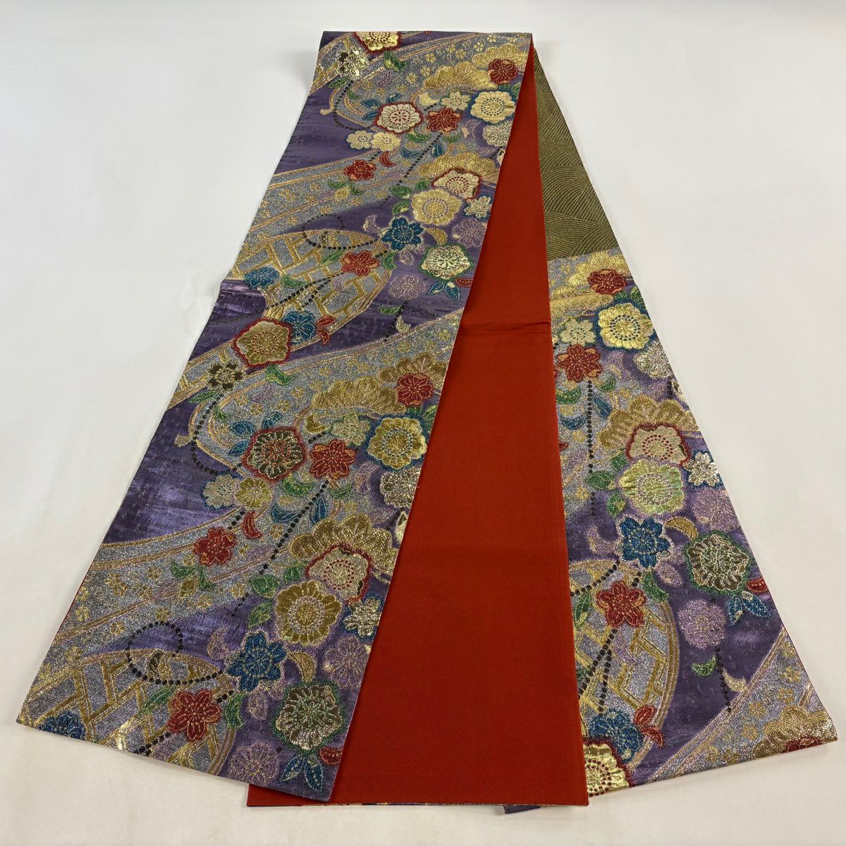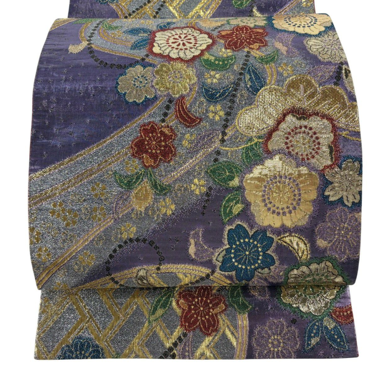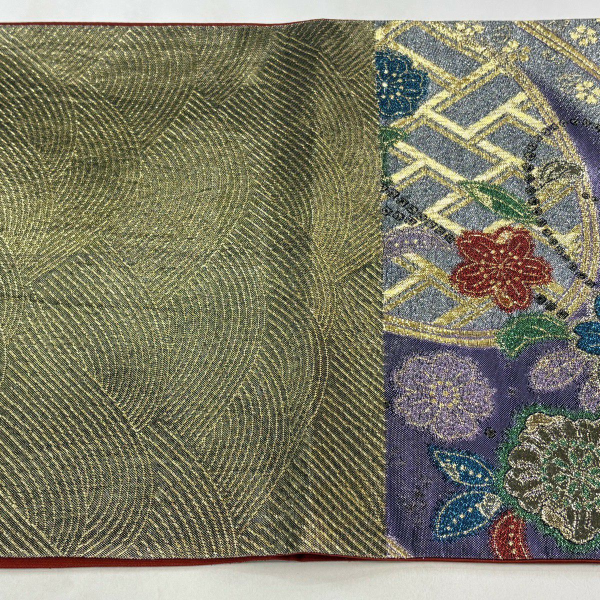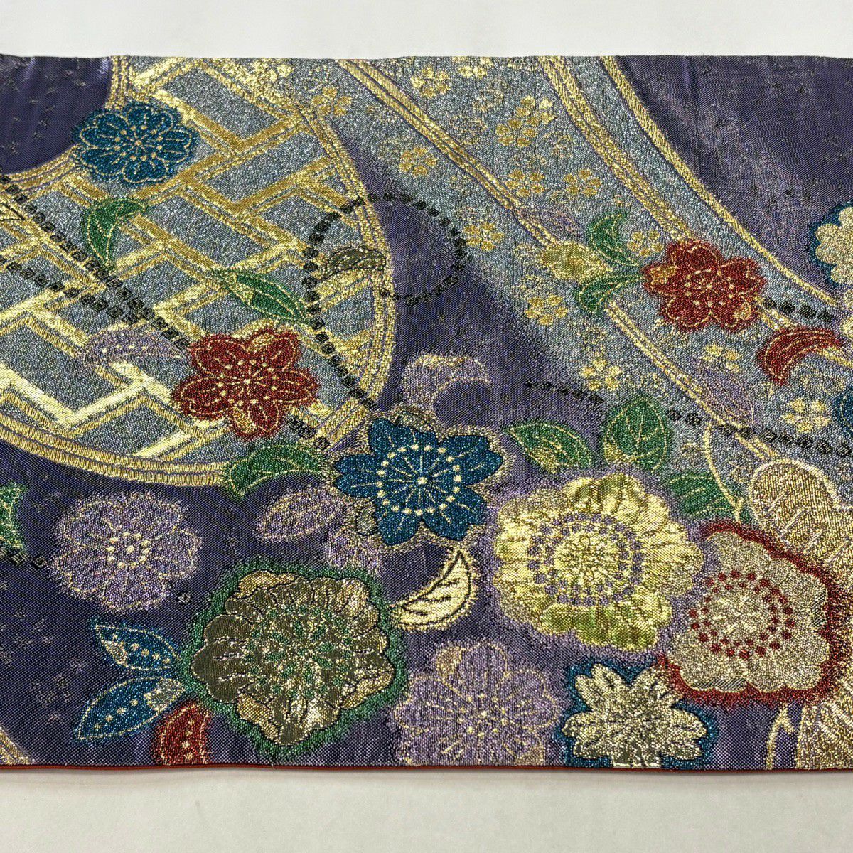 【美品】 袋帯 秀品 証紙あり 花鳥 雪輪 金糸 箔 茶紫 全通 正絹