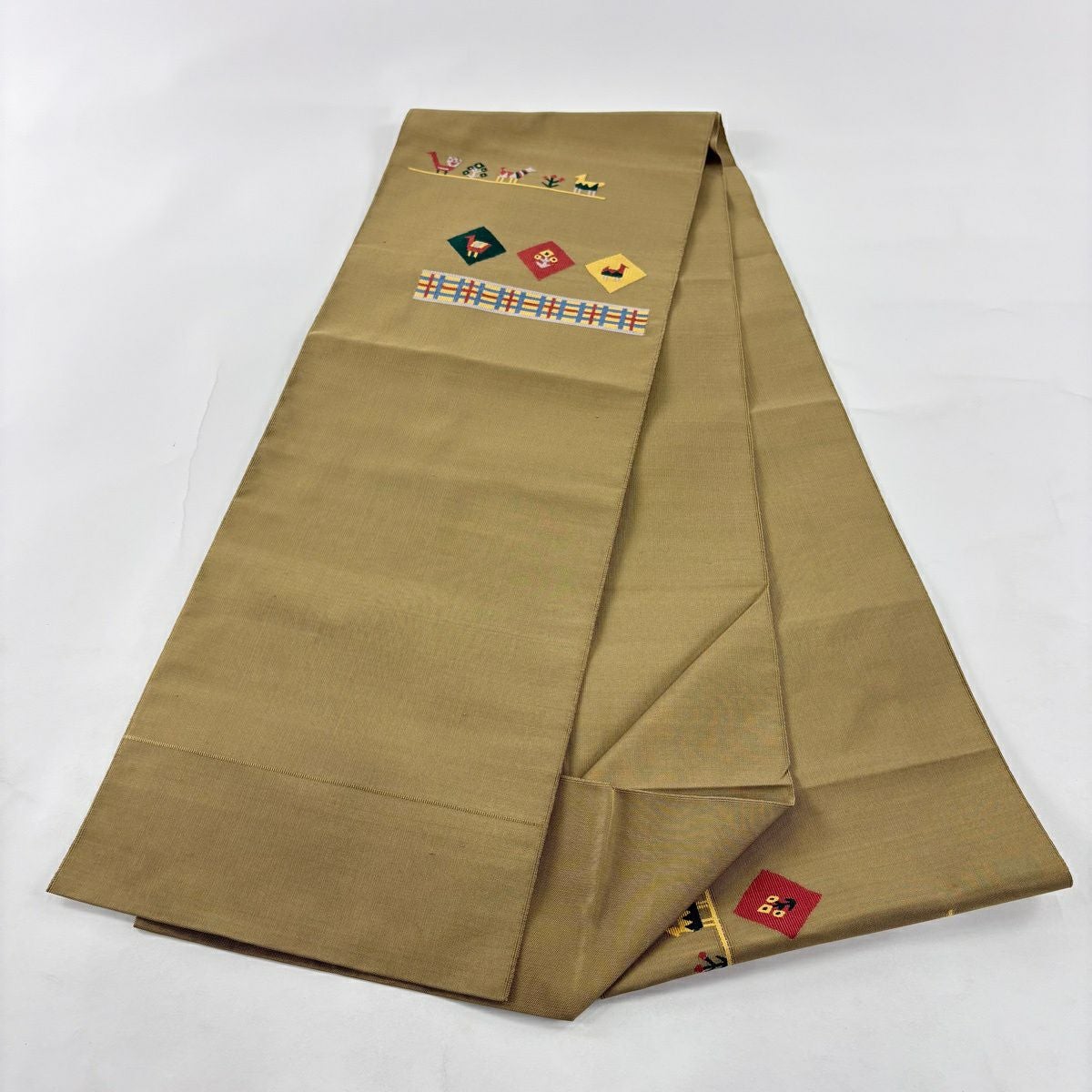 【美品】 名古屋帯 秀品 八寸名古屋帯 松葉仕立て 草花 動物 茶緑色 正絹