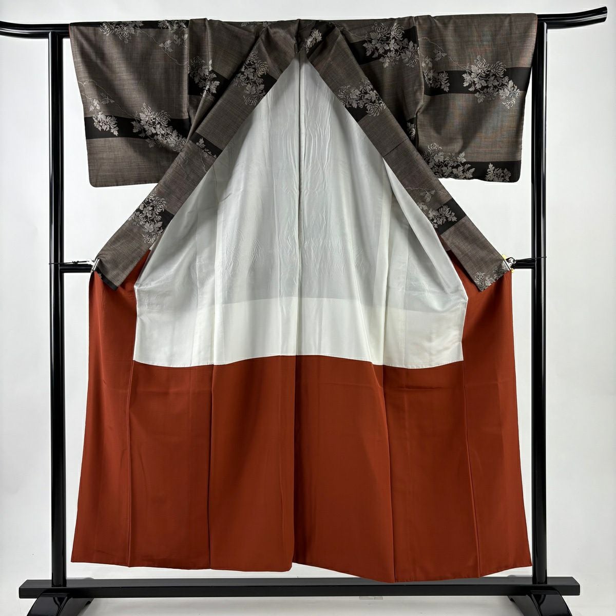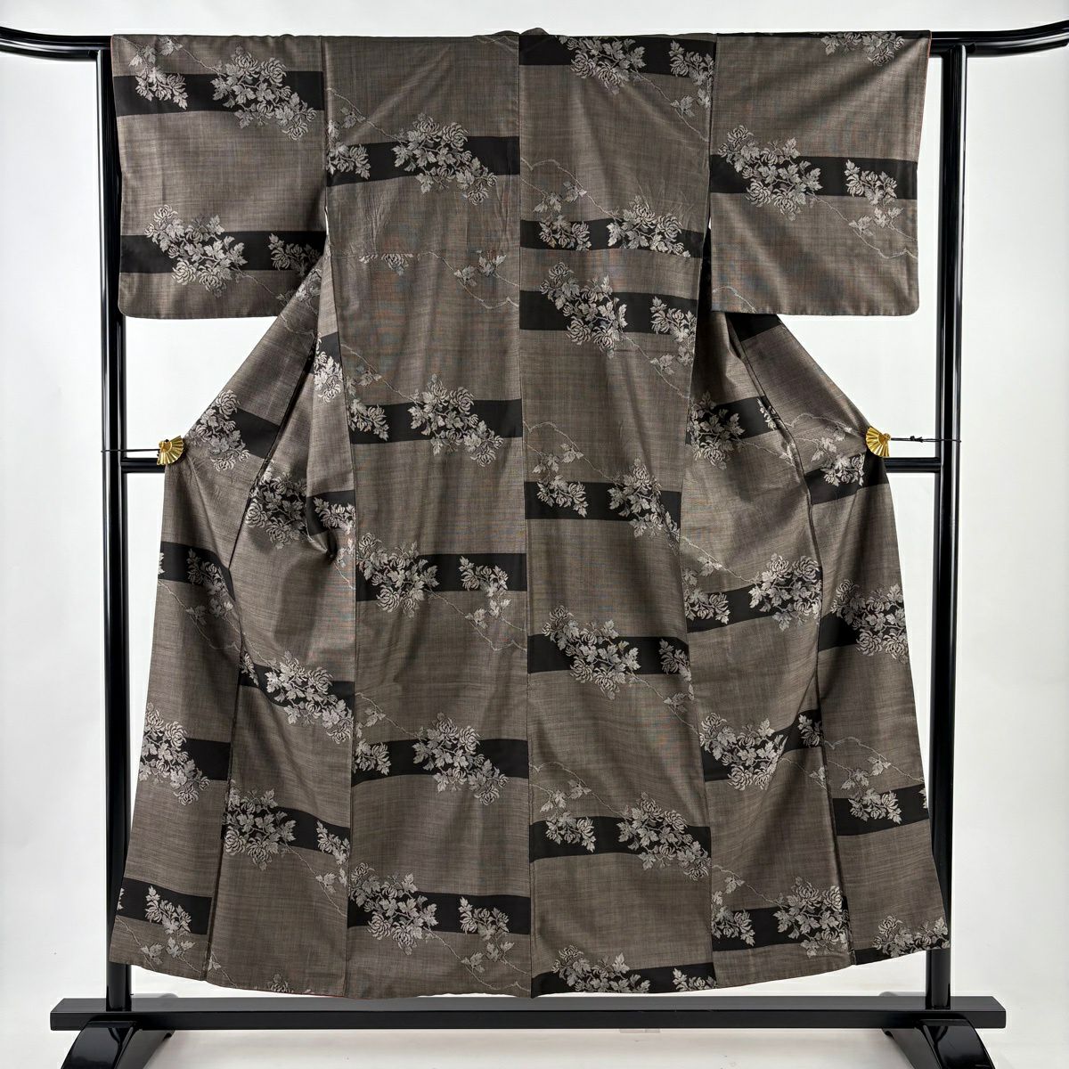紬 身丈155cm 裄丈62cm S 袷 枝花 段縞 焦茶色 正絹 秀品