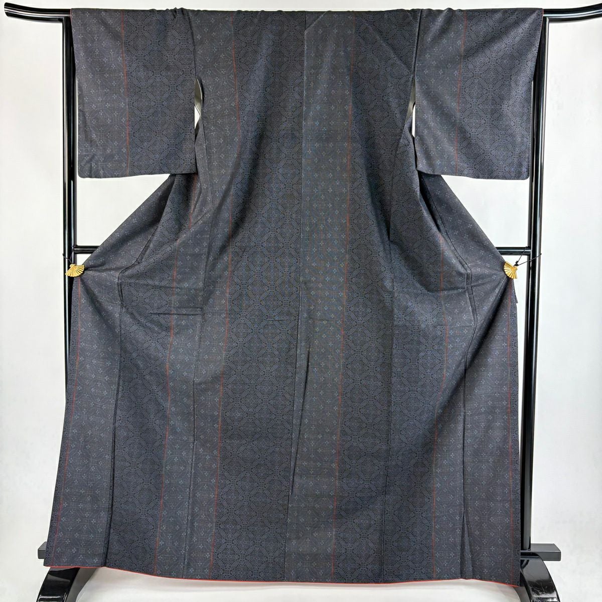 紬 身丈167cm 裄丈66.5cm M 袷 七宝 花 濃紺 正絹 秀品
