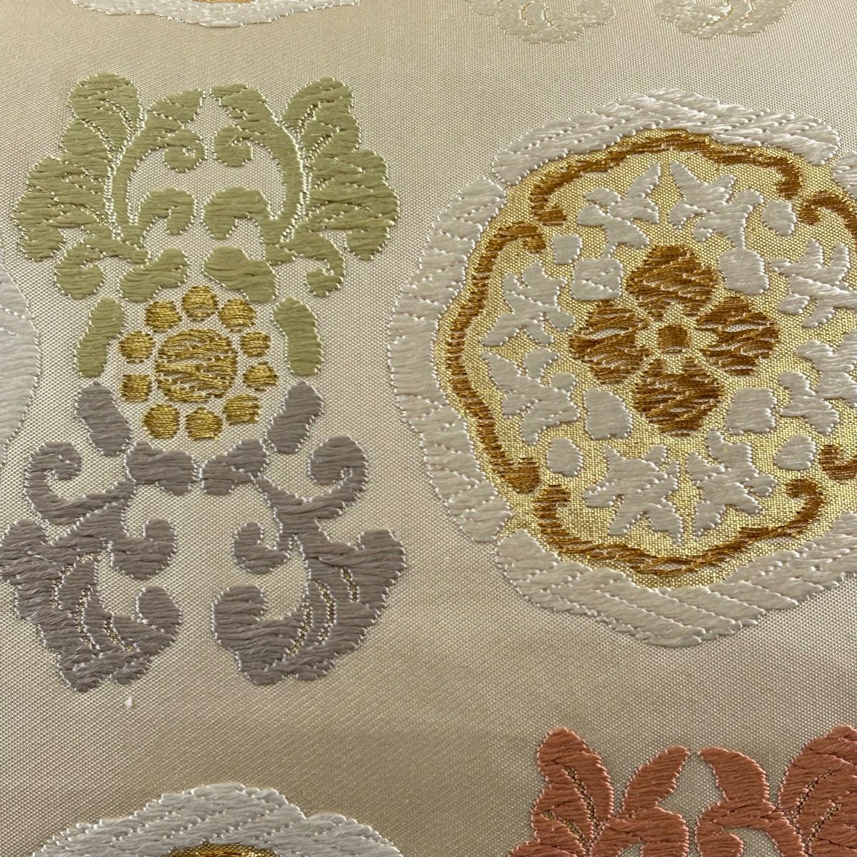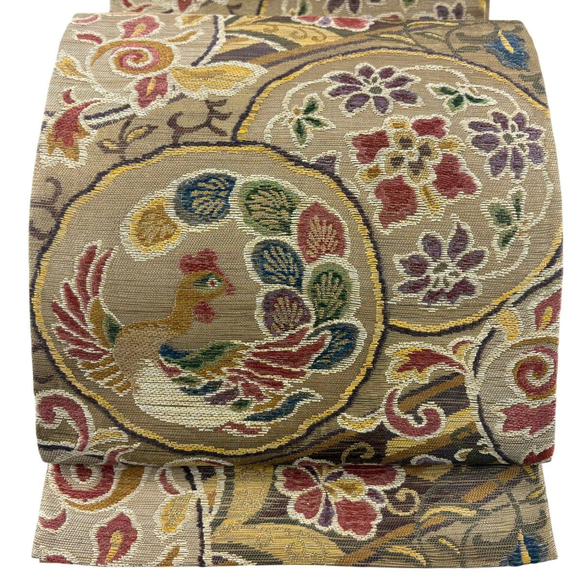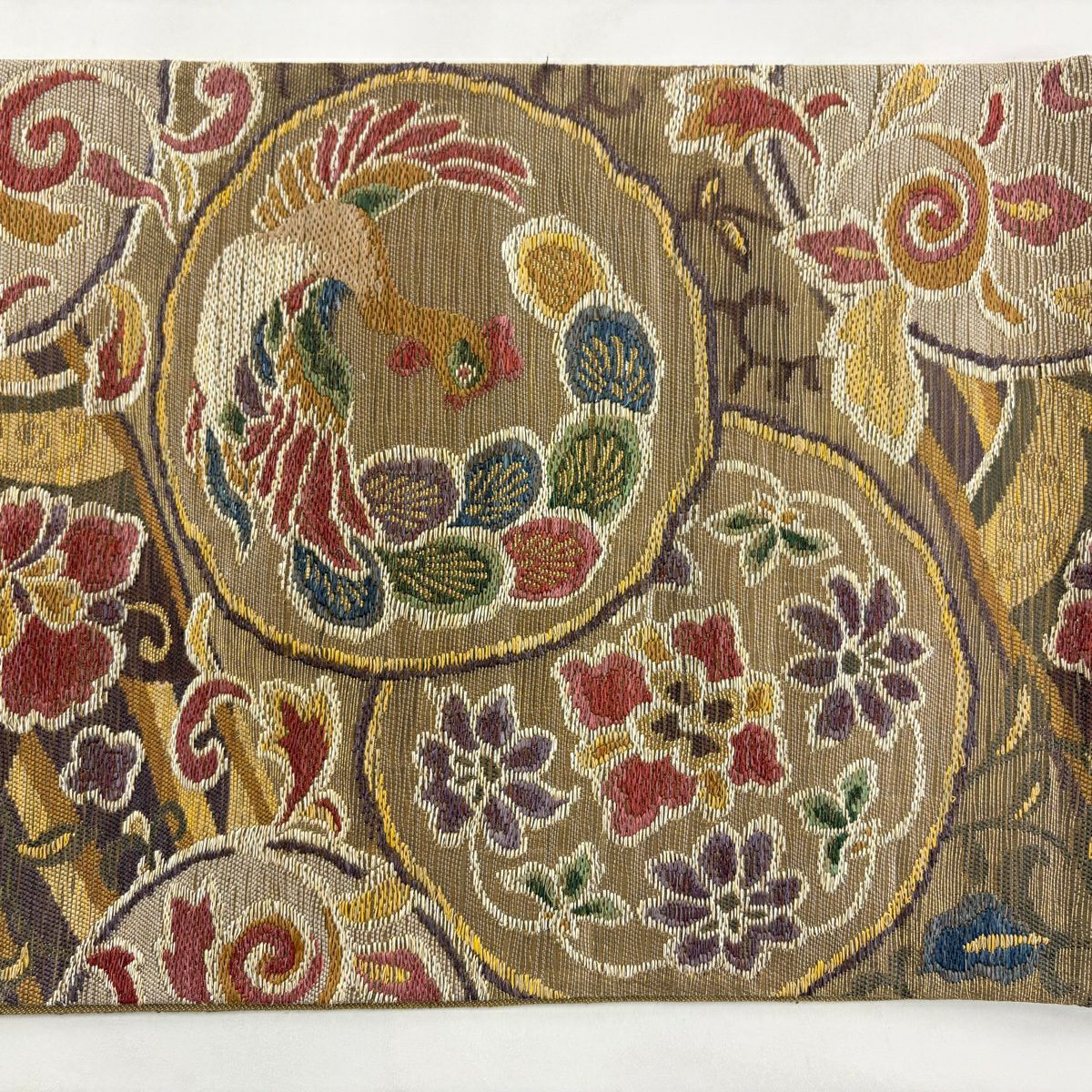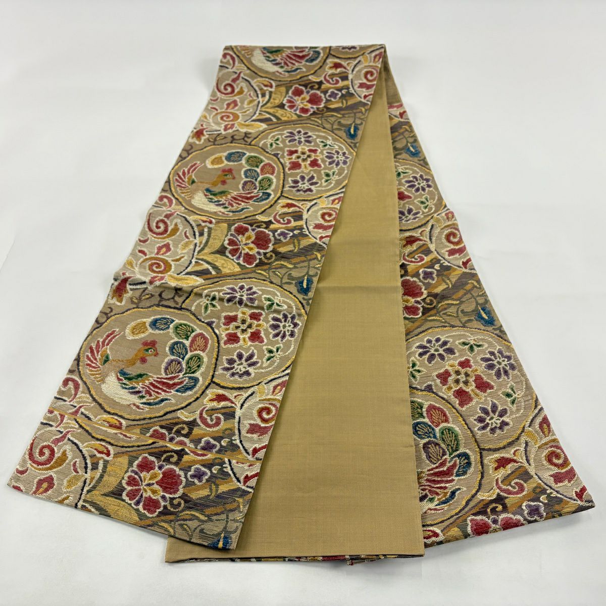 【美品】 袋名古屋帯 秀品 鳥丸文 花丸文 金糸 箔 ベージュ 正絹