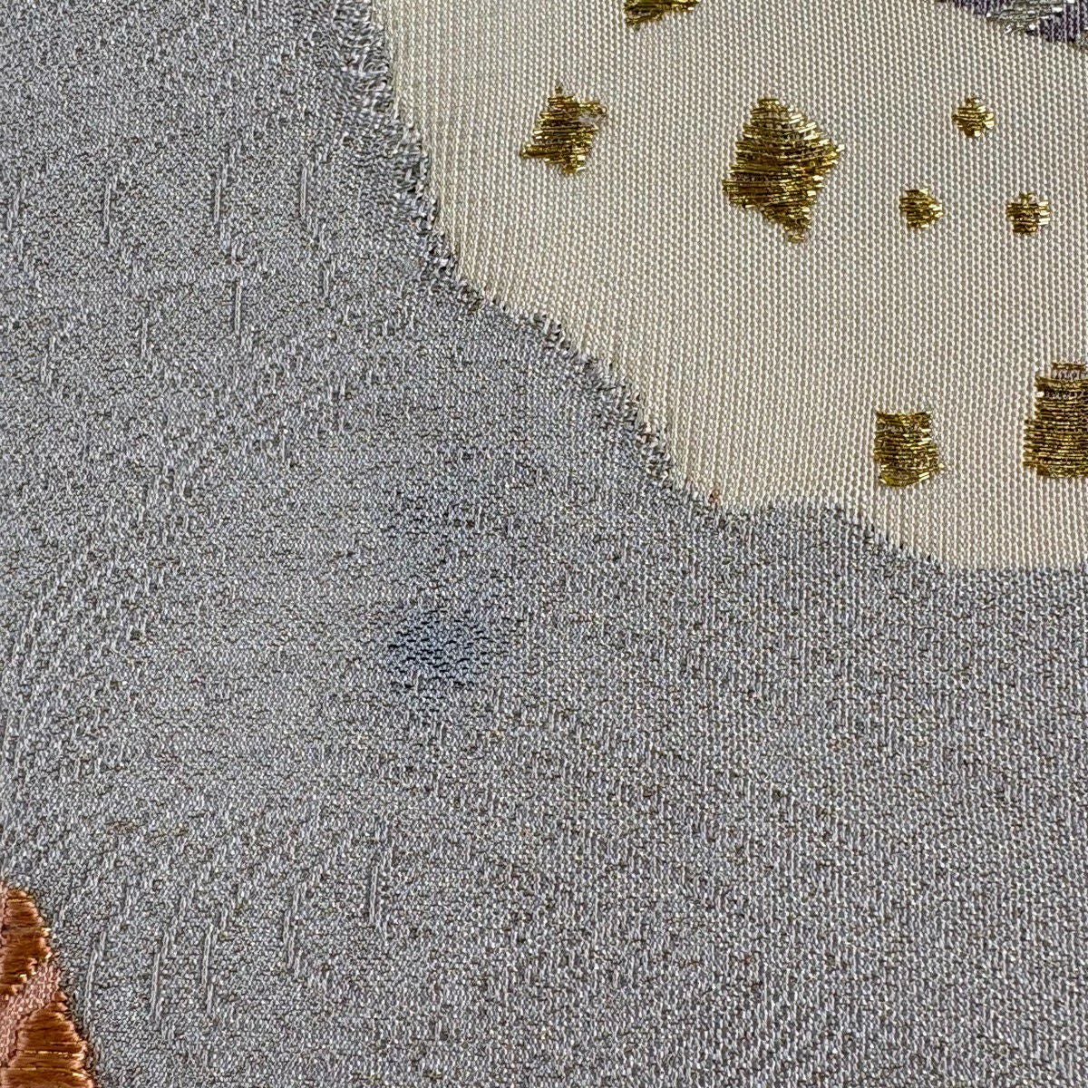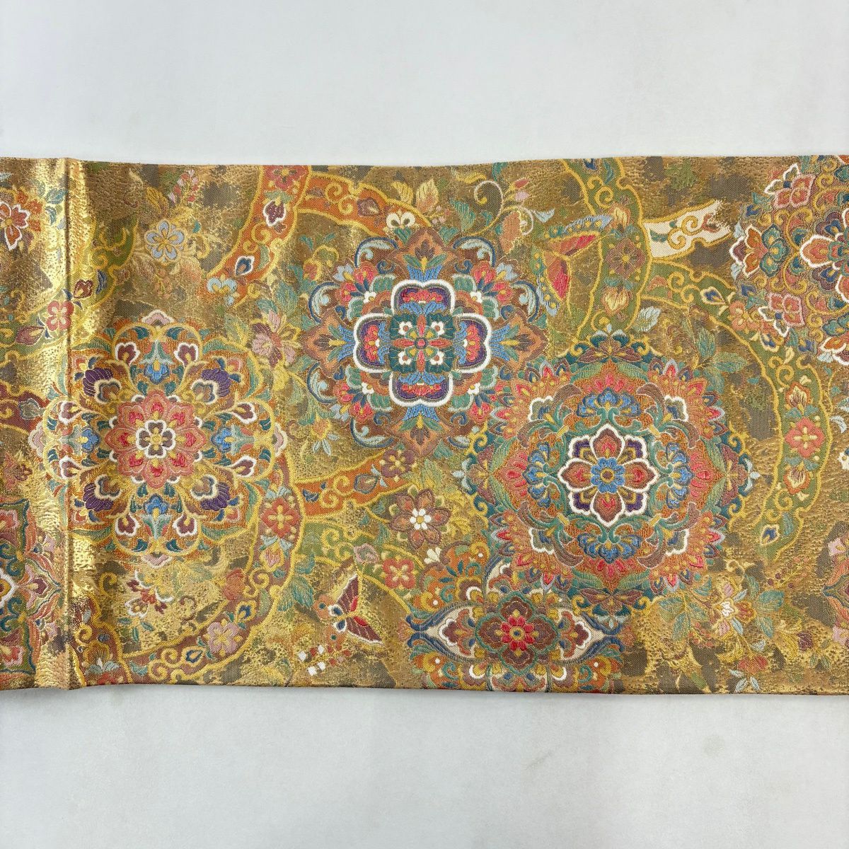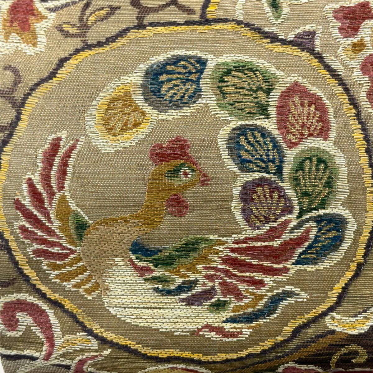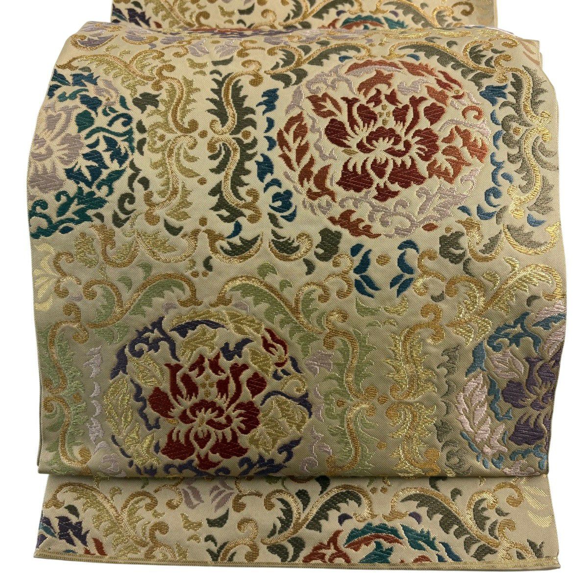 【美品】 袋名古屋帯 秀品 鳥丸文 花丸文 金糸 箔 ベージュ 正絹