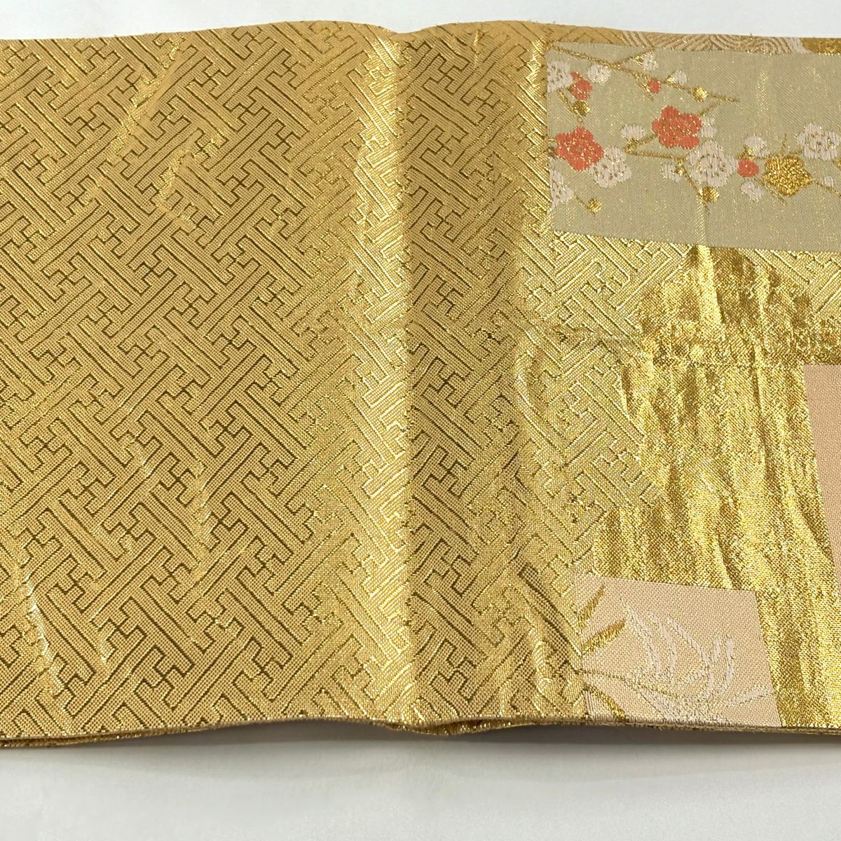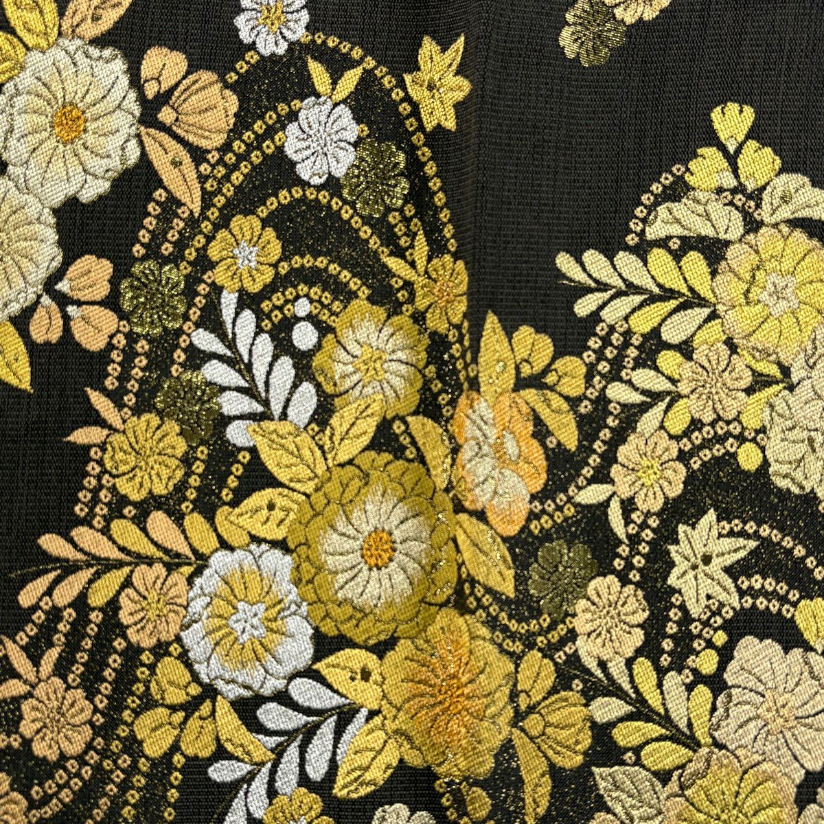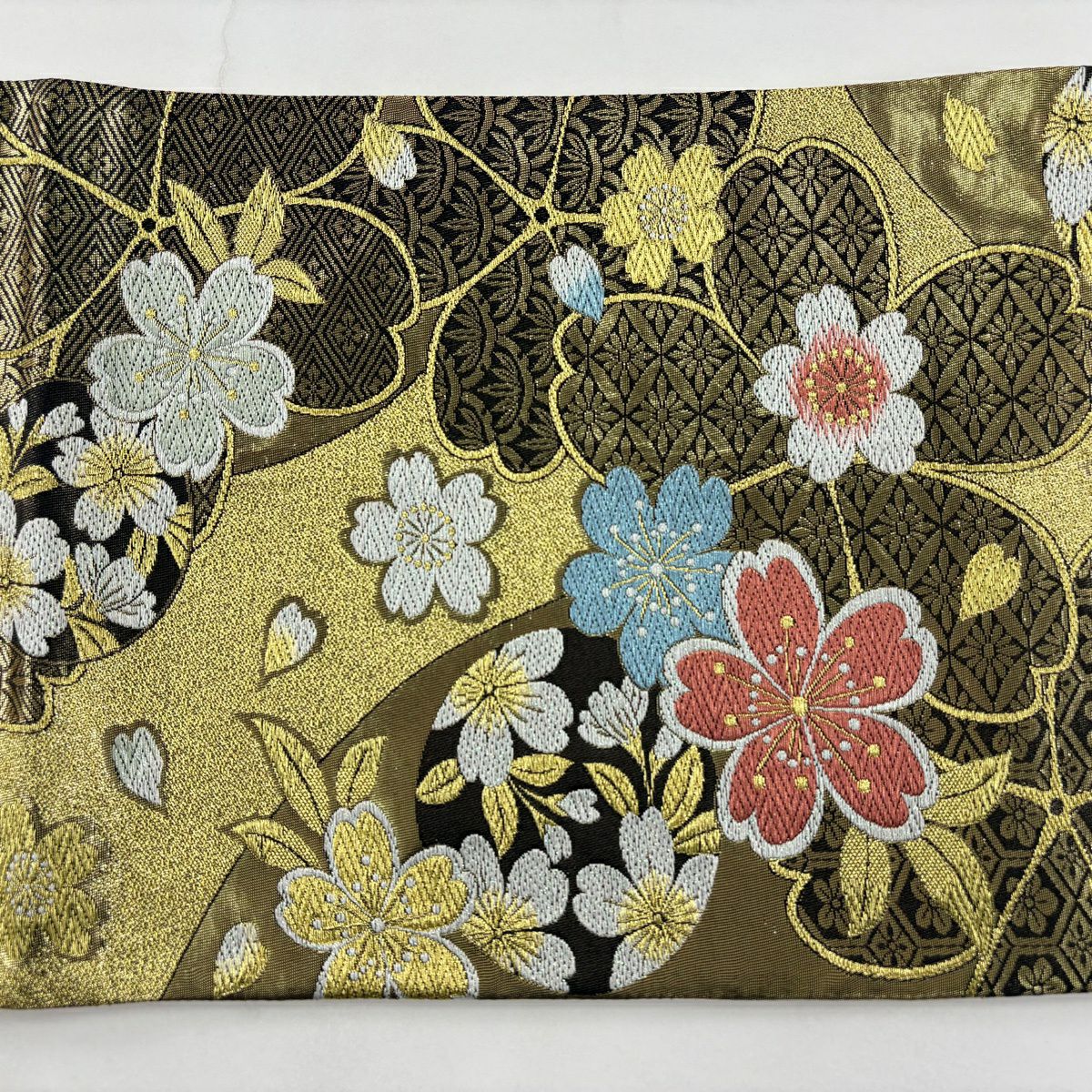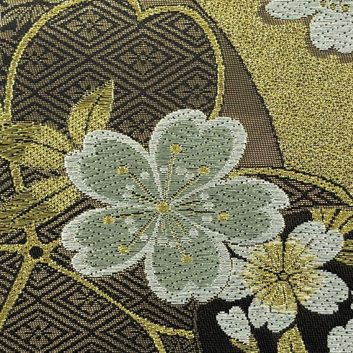 【美品】 袋帯 秀品 関西仕立て 桜 籠目 唐織 箔 金色 六通 正絹