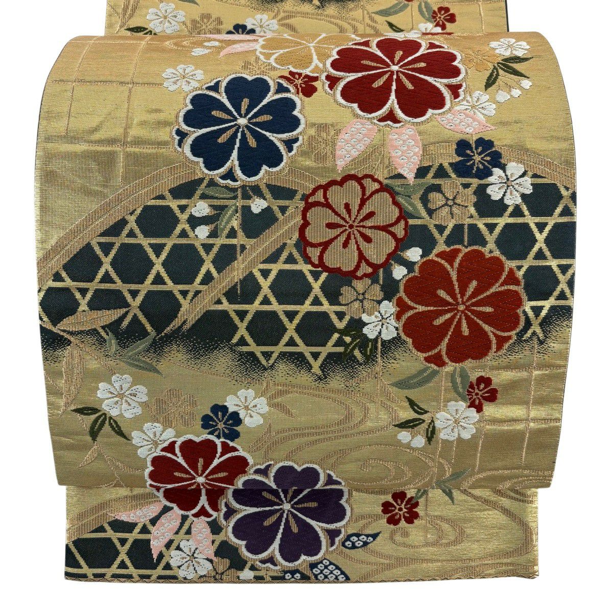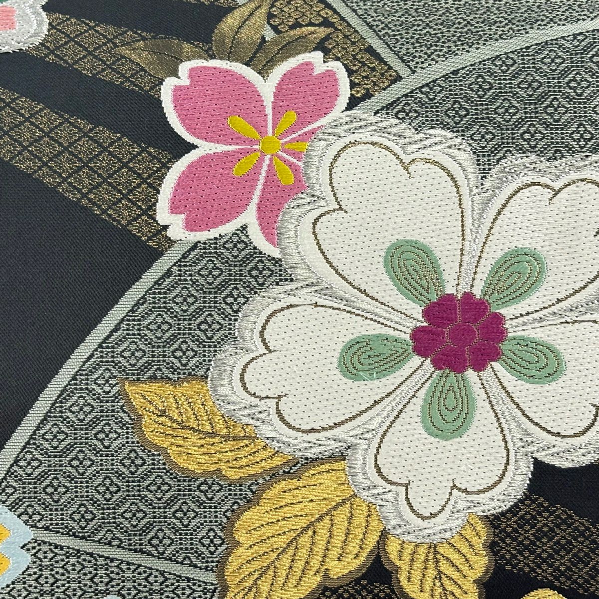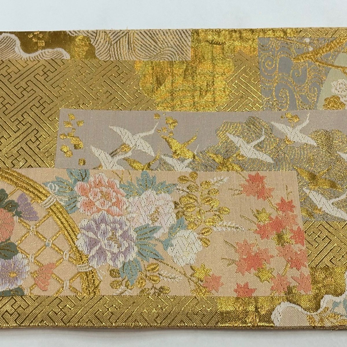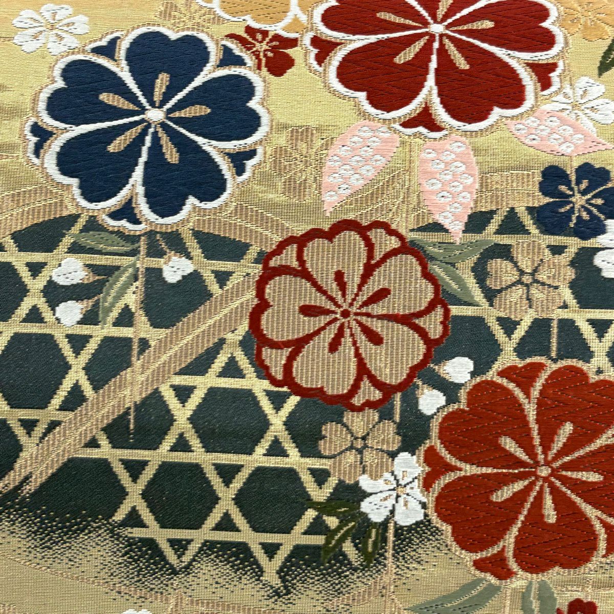 【美品】 袋帯 秀品 関西仕立て 桜 籠目 唐織 箔 金色 六通 正絹