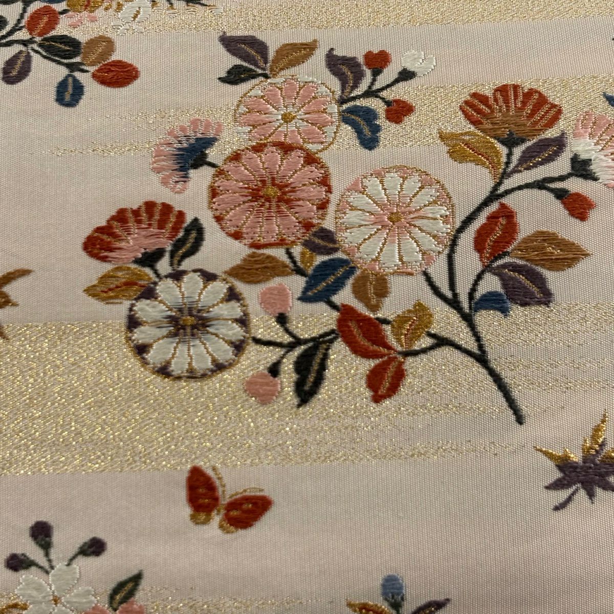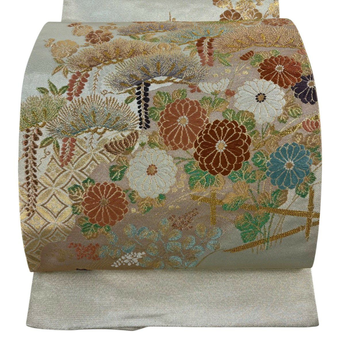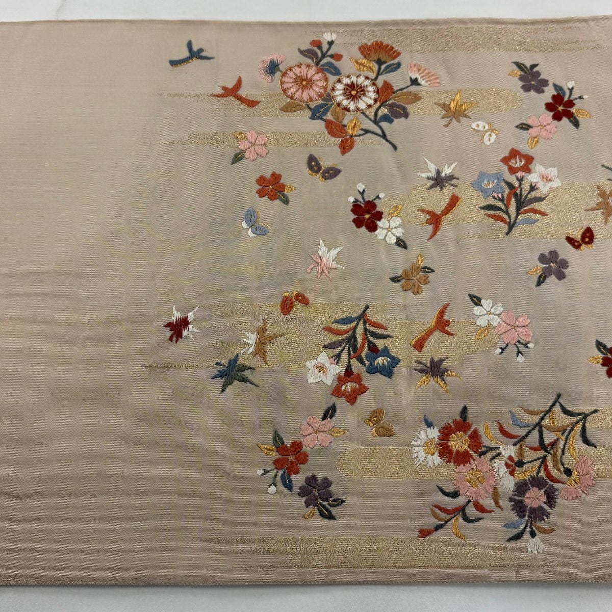 袋帯 秀品 関西仕立て 鈴 草花 刺繍 金糸 ベージュ 六通 正絹