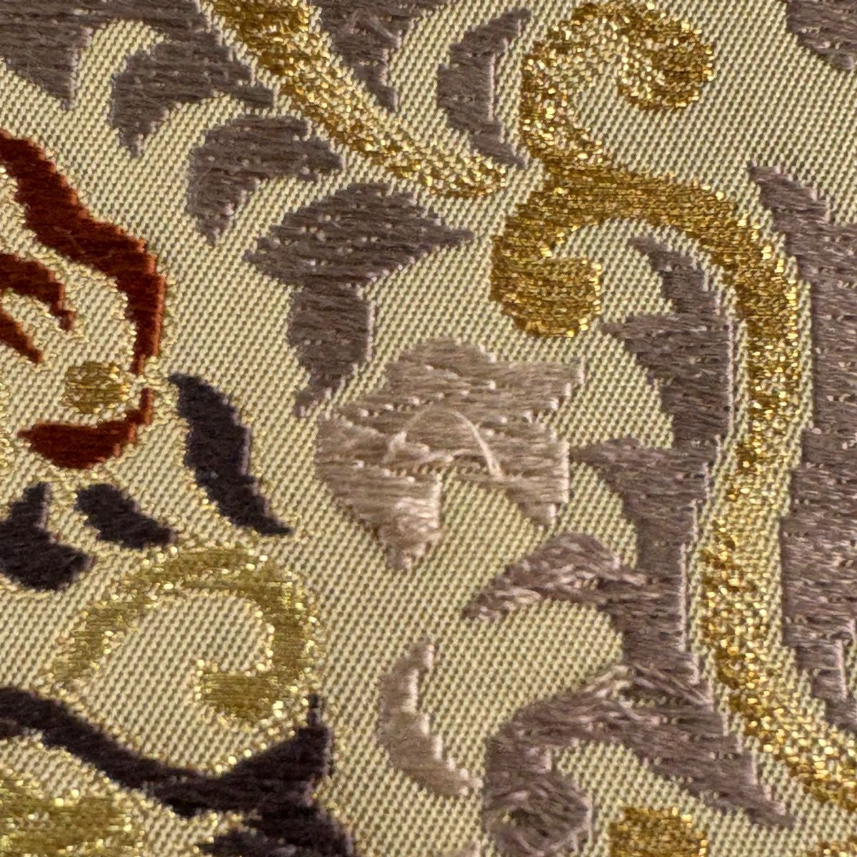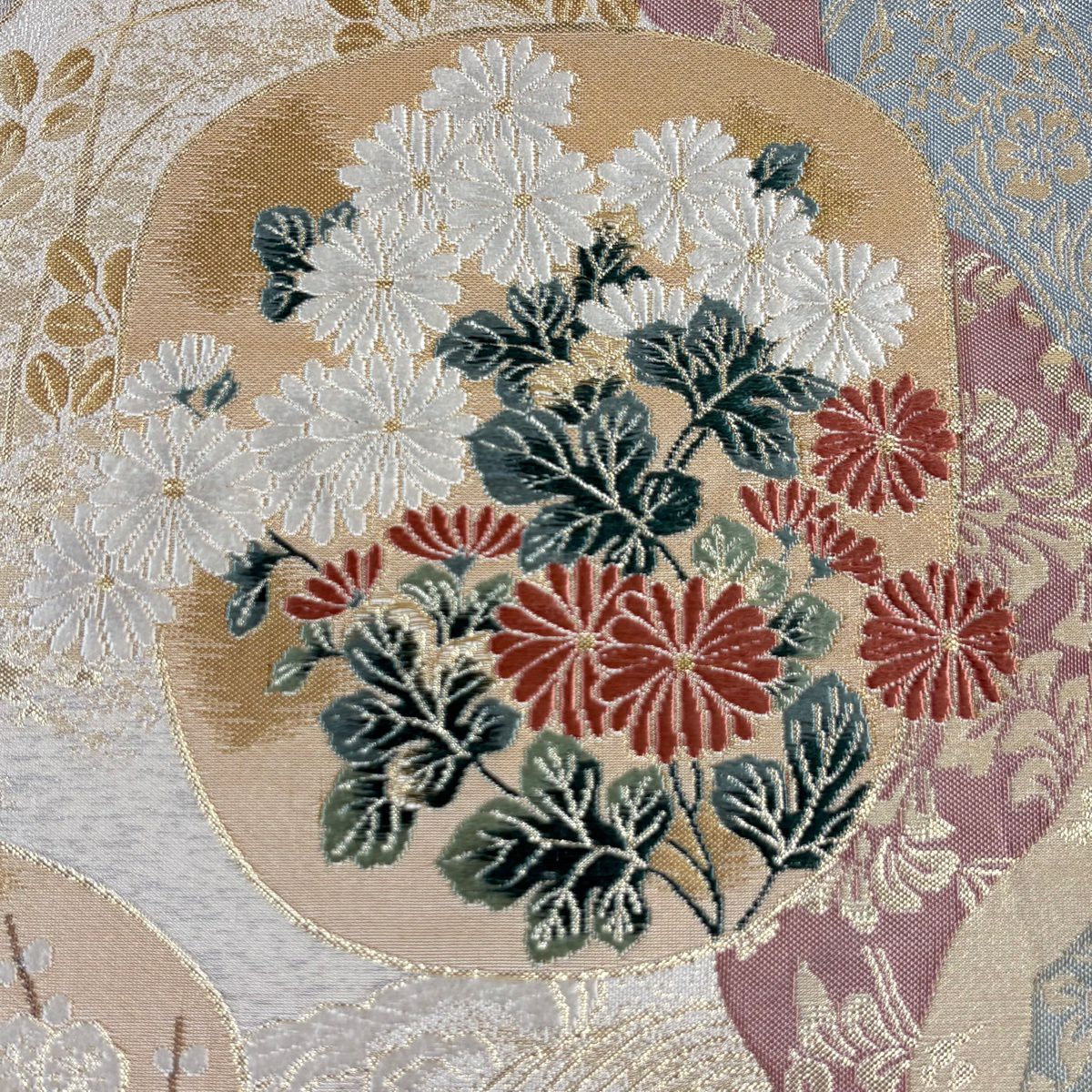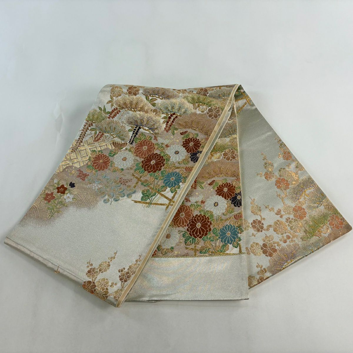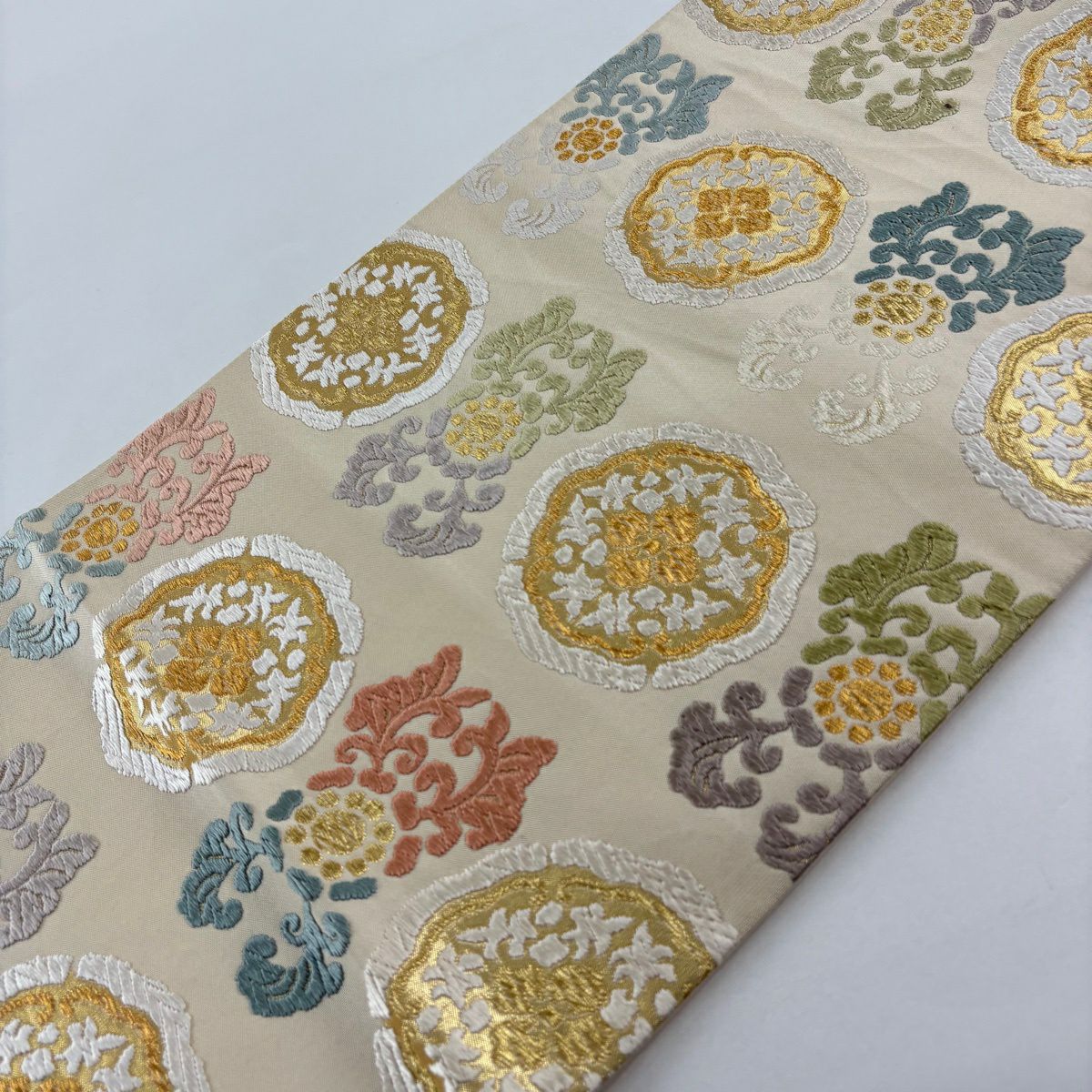袋帯 秀品 関西仕立て 鈴 草花 刺繍 金糸 ベージュ 六通 正絹
