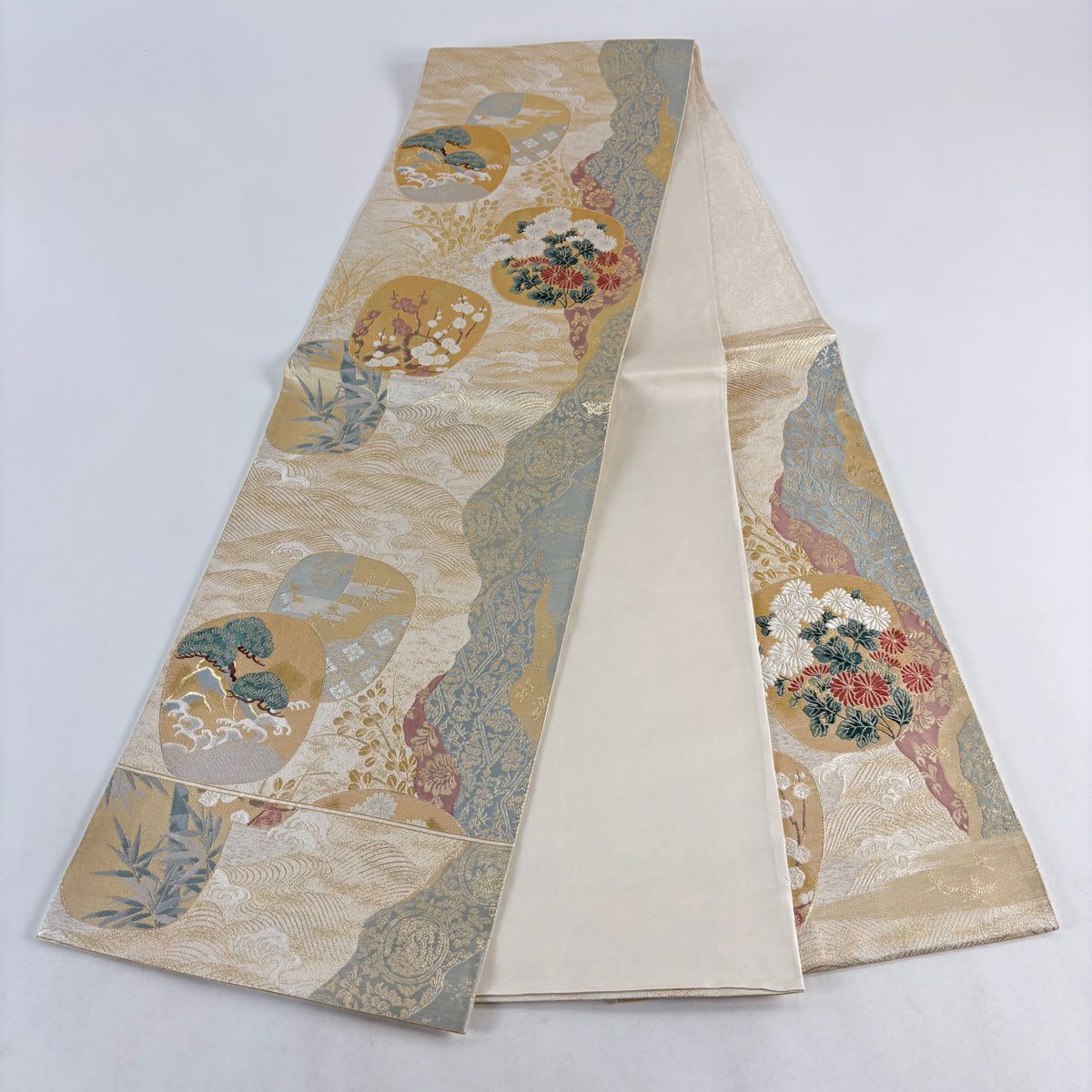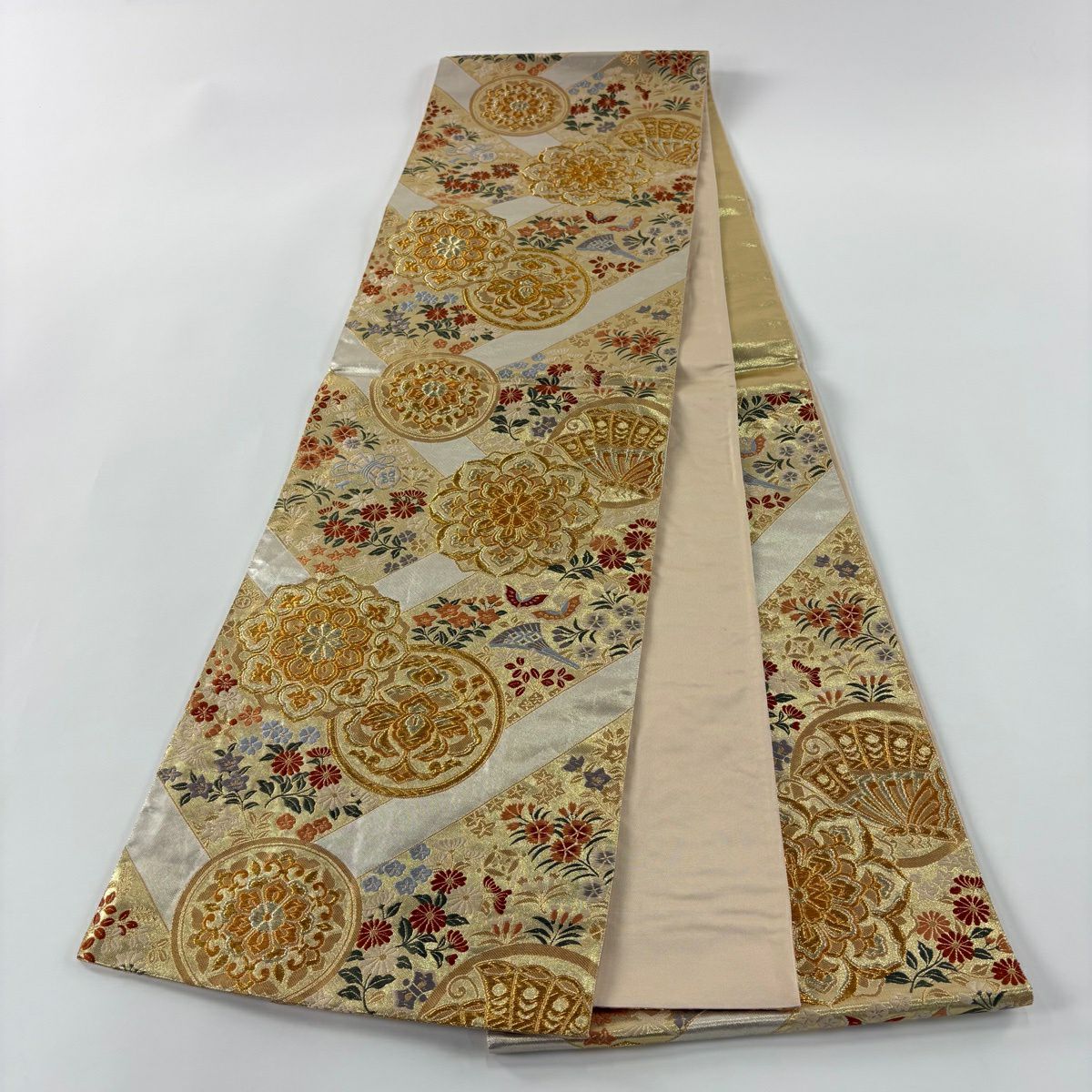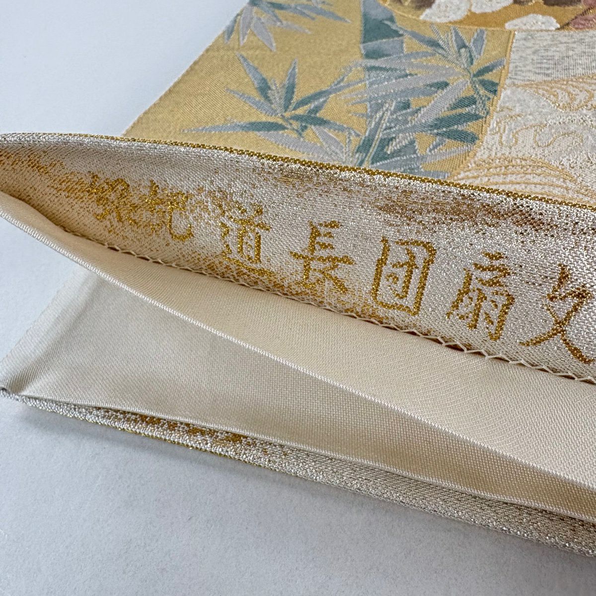 【美品】 袋帯 秀品 紹巴道長団扇文 金銀糸 箔 クリーム 六通 正絹