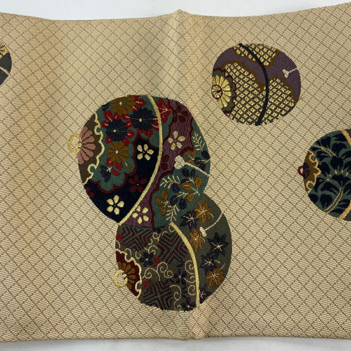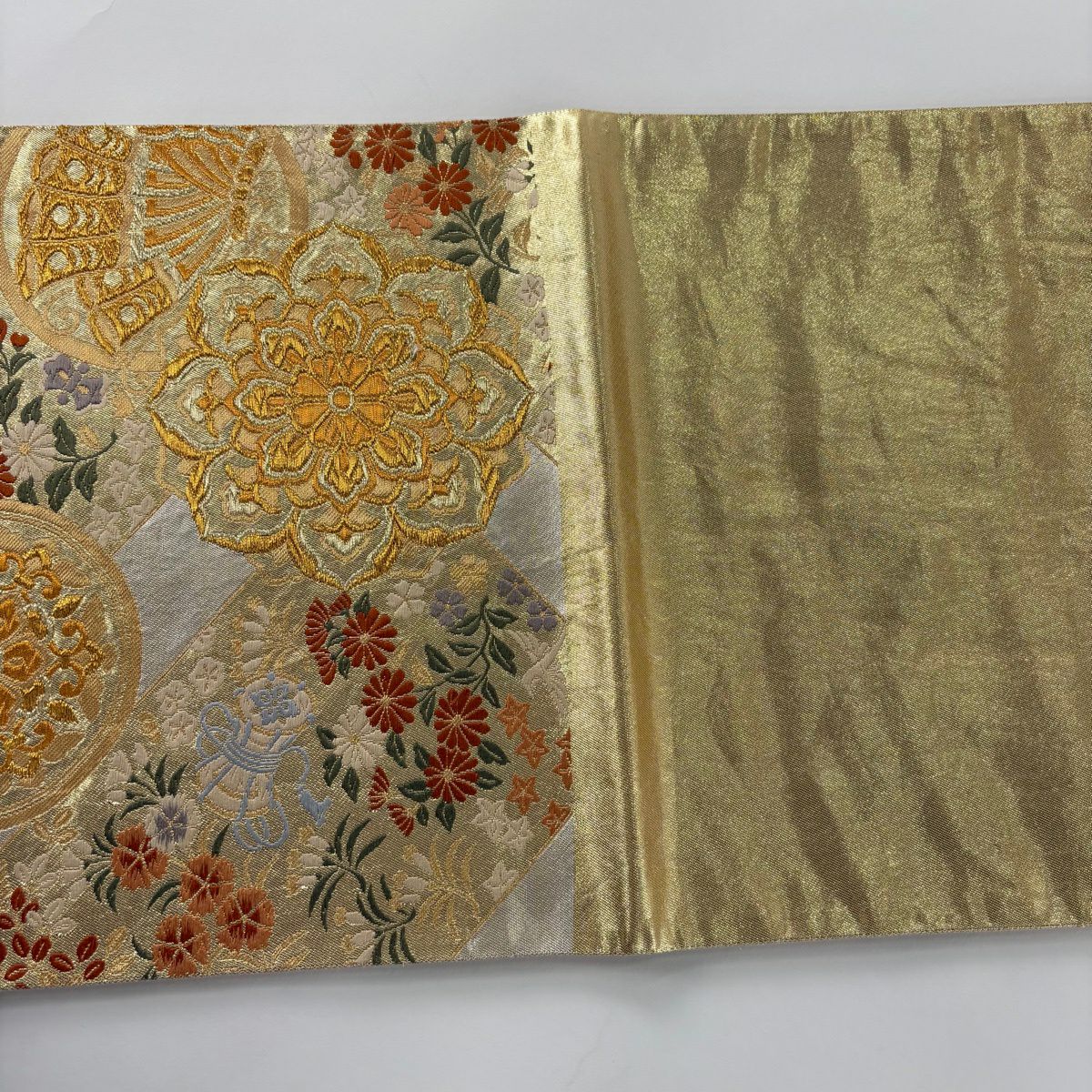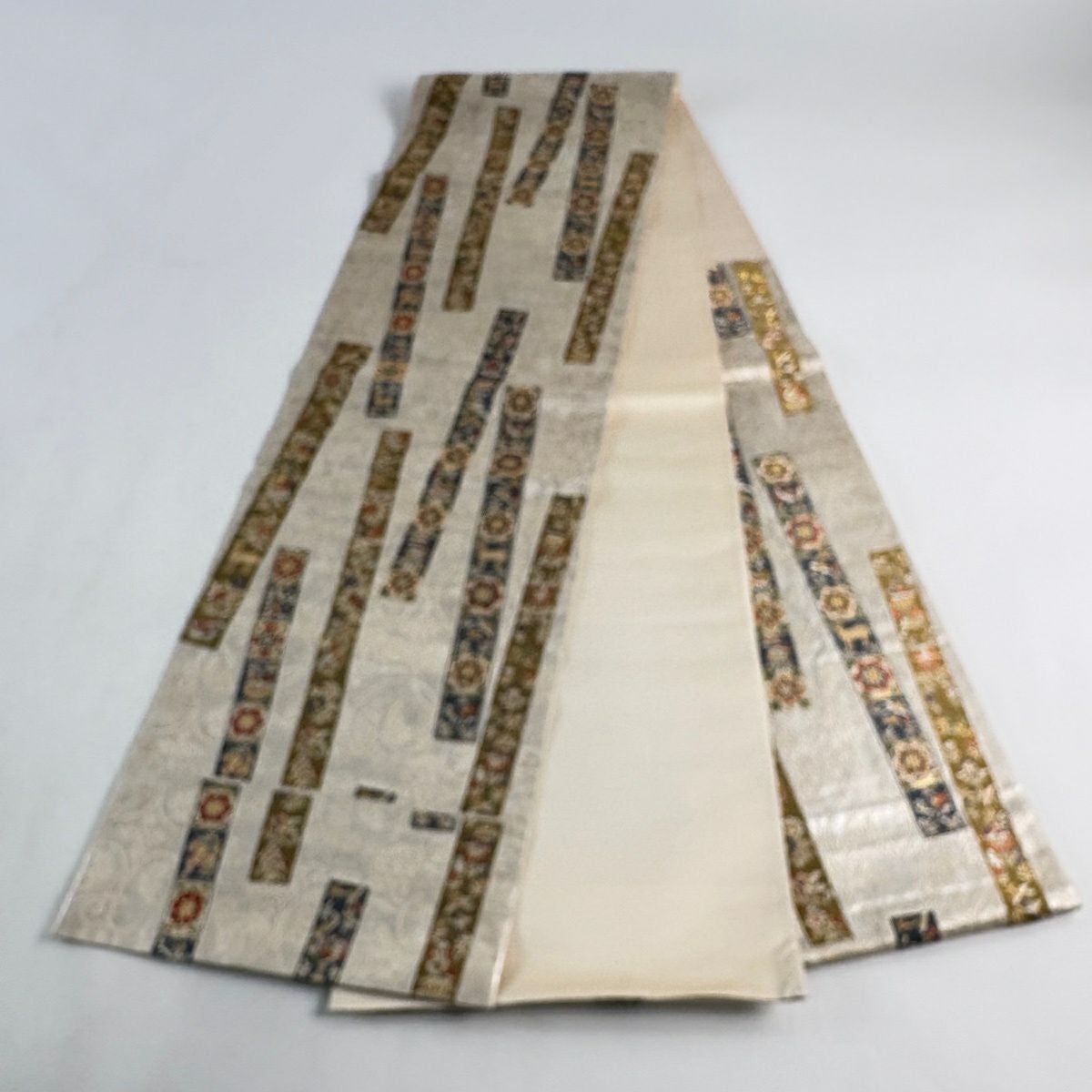 【美品】 袋帯 秀品 紹巴道長団扇文 金銀糸 箔 クリーム 六通 正絹