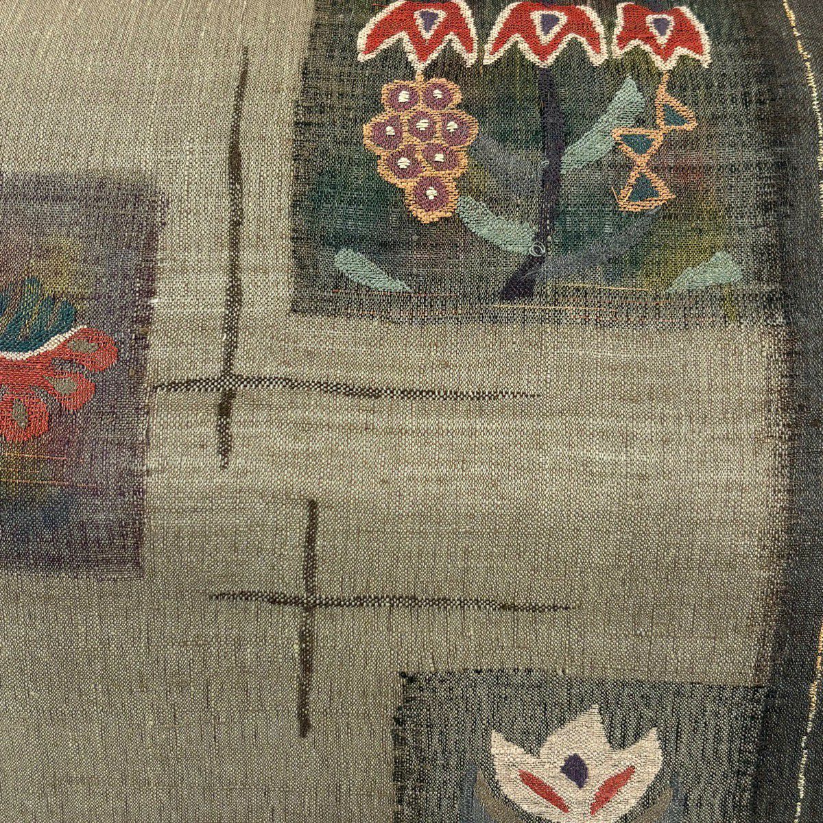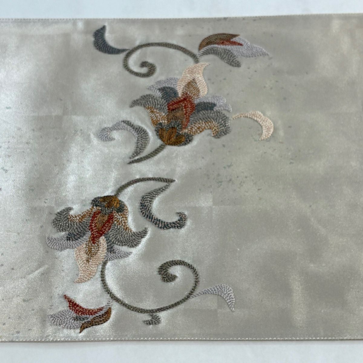 【美品】 袋帯 秀品 向かい鳥 草花 刺繍 金糸 灰緑 お太鼓柄 正絹