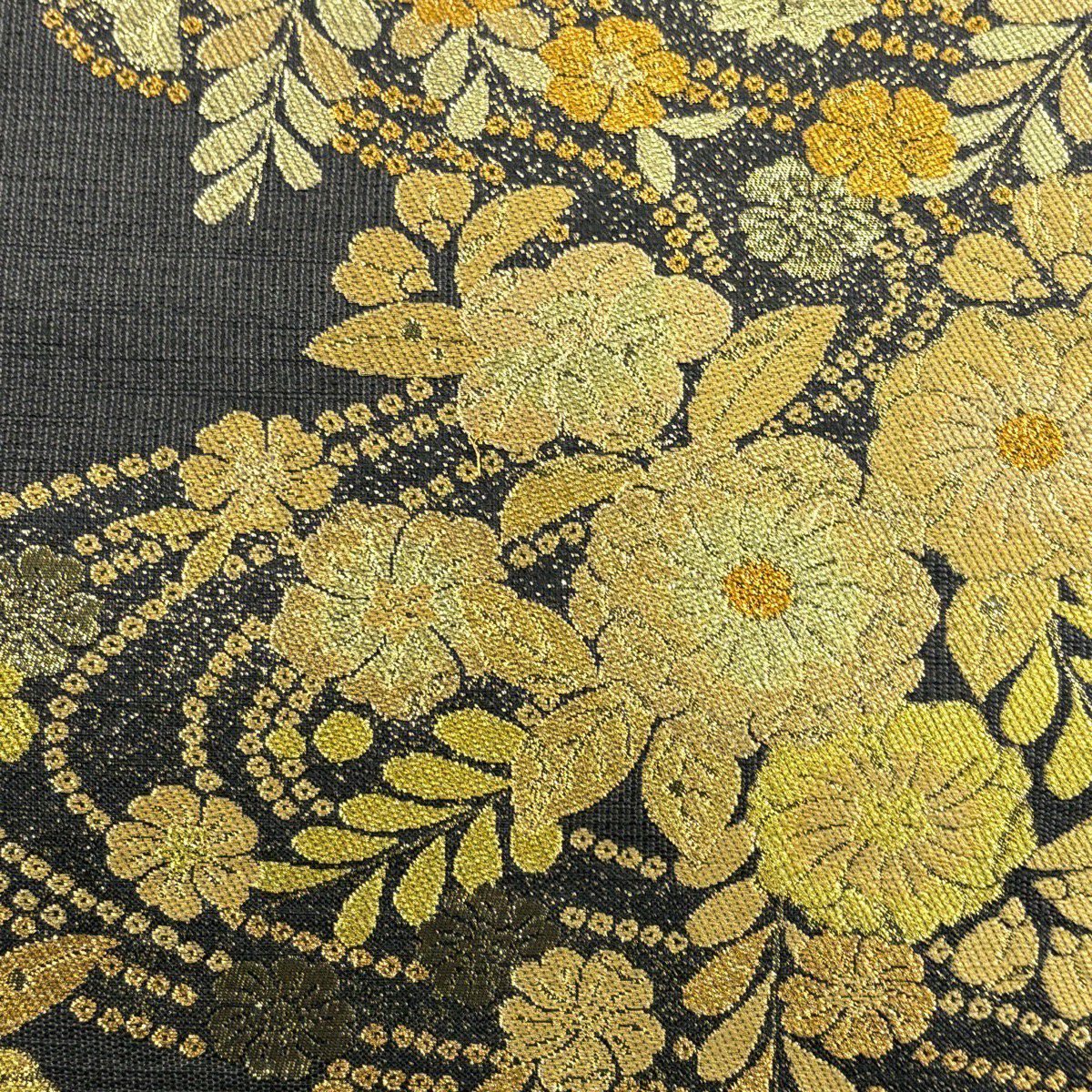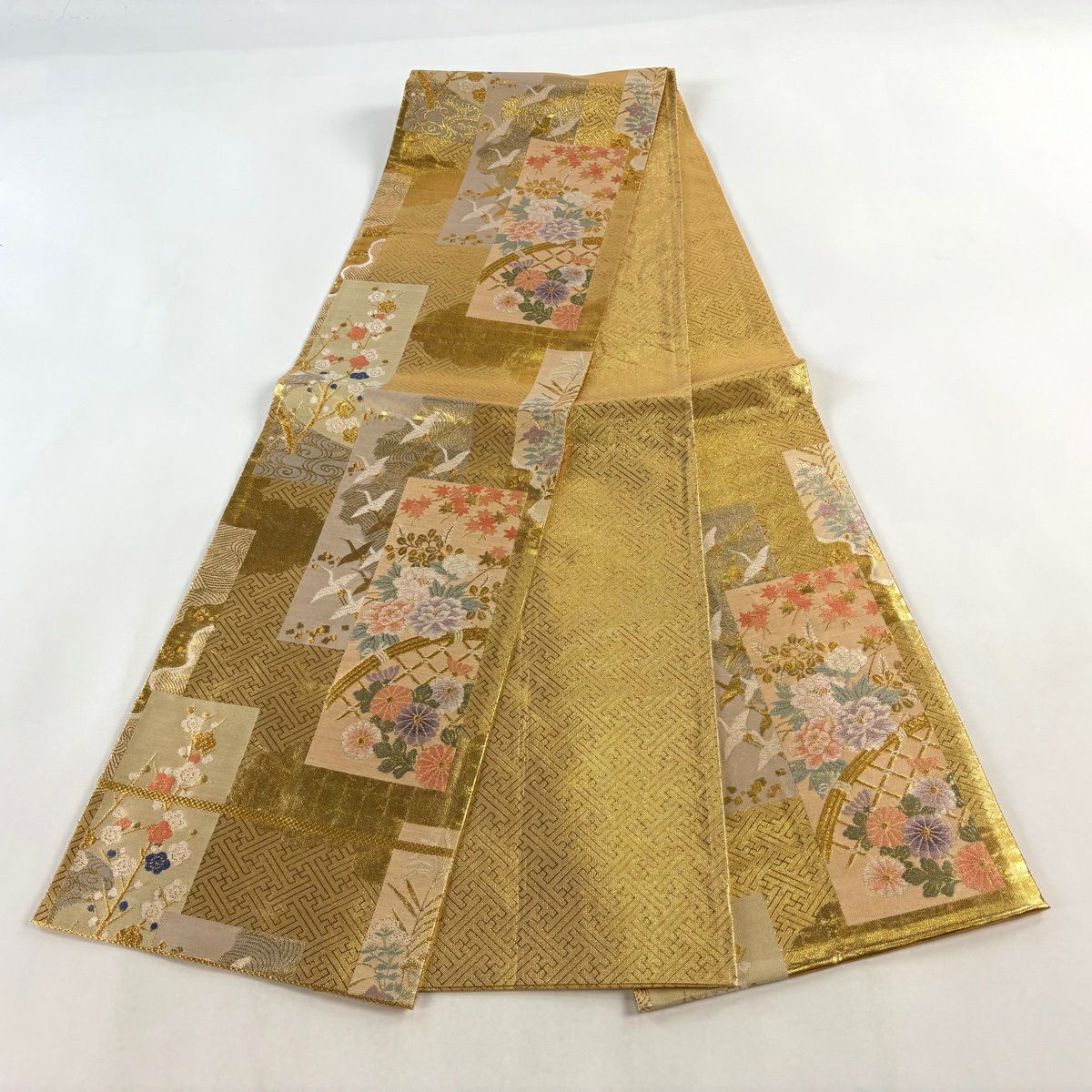 【美品】 袋帯 秀品 関西仕立て 草花 鶴 箔 唐織 金色 六通 正絹