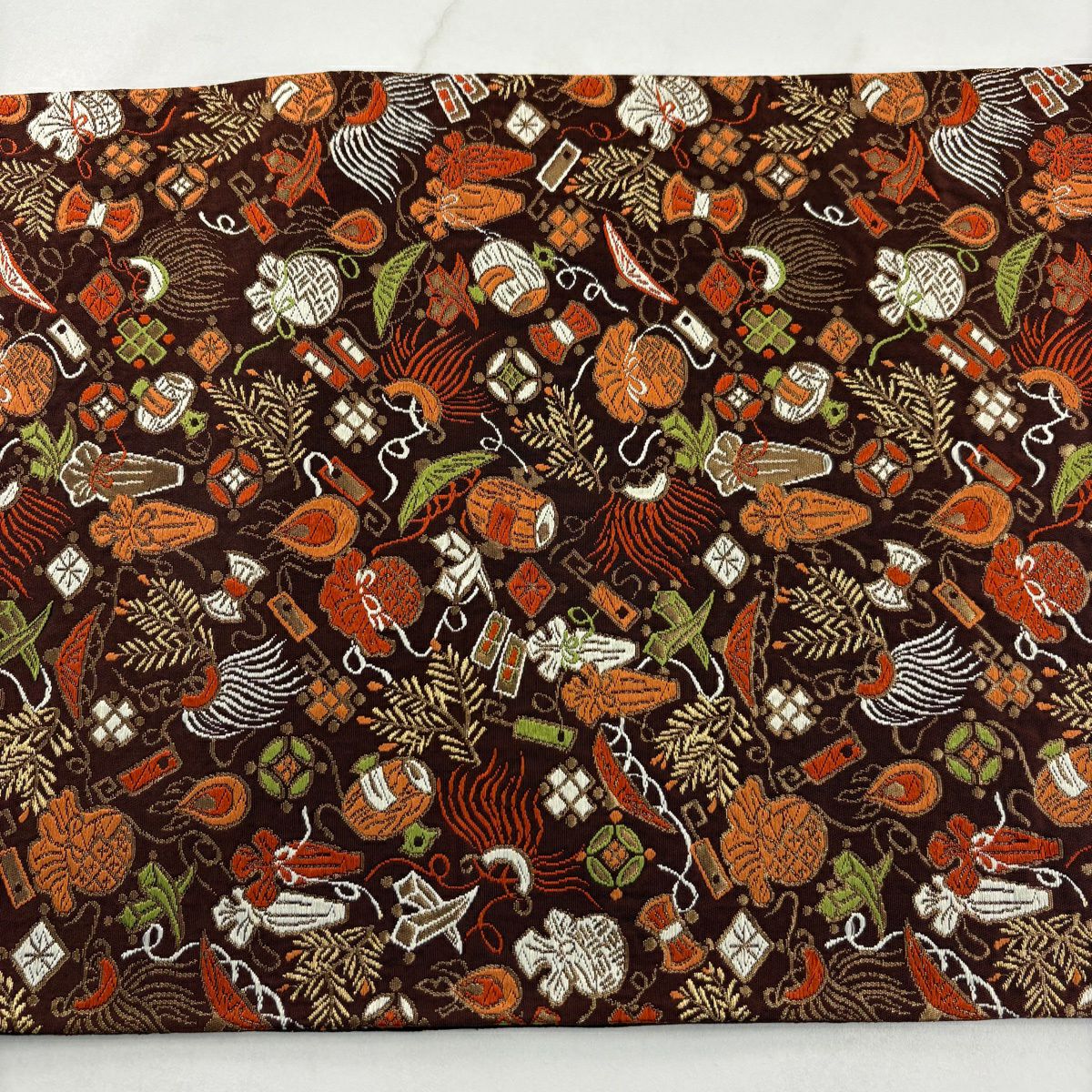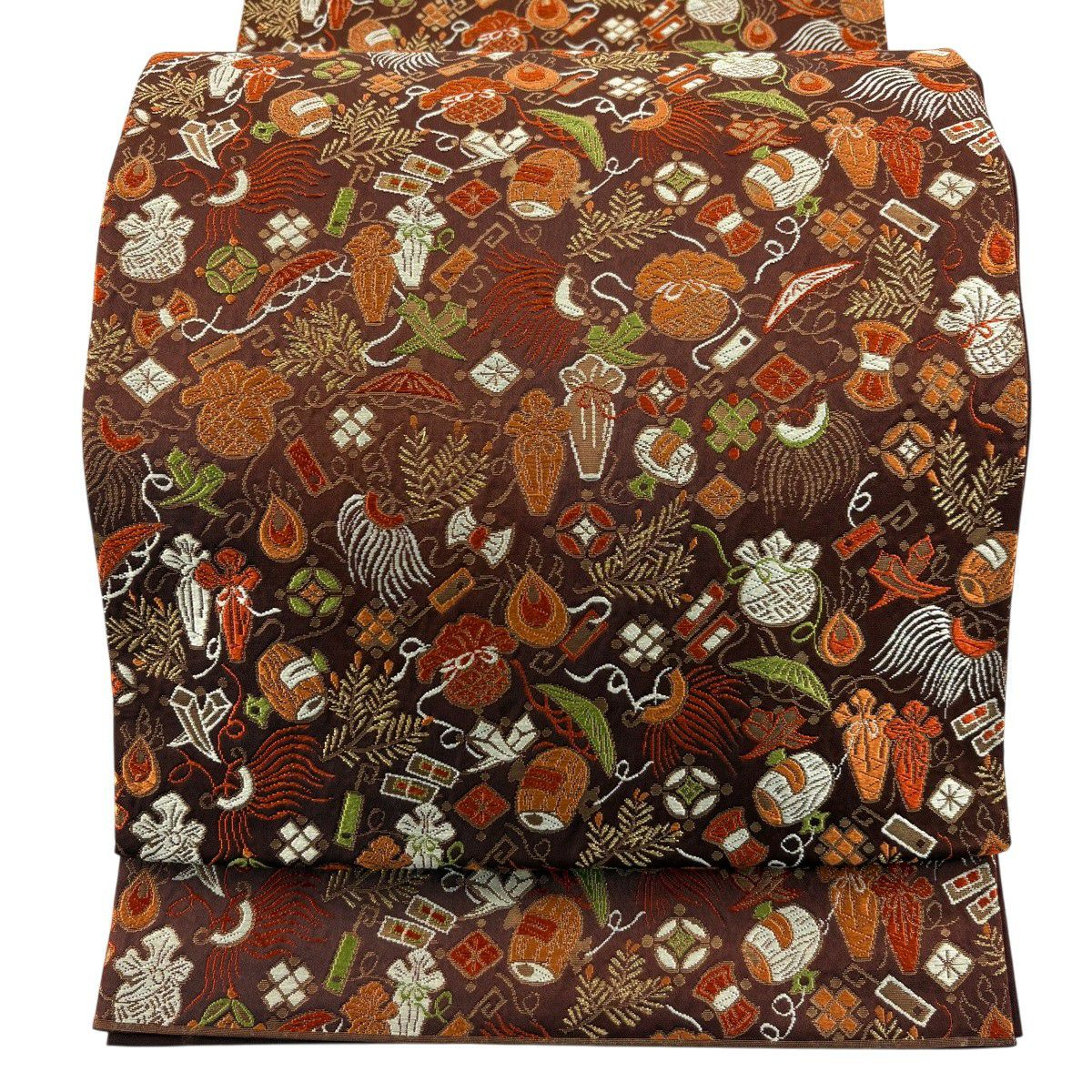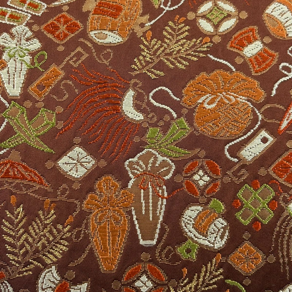 【美品】 袋帯 秀品 関西仕立て 宝尽くし 金糸 箔 茶色 六通 正絹