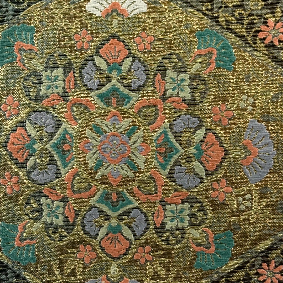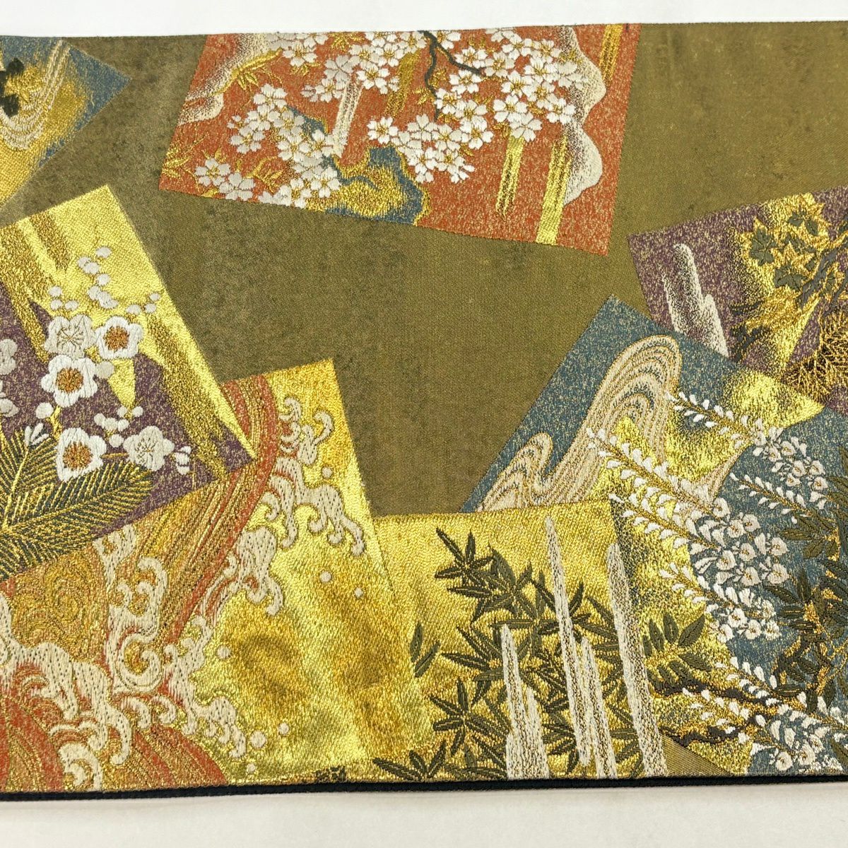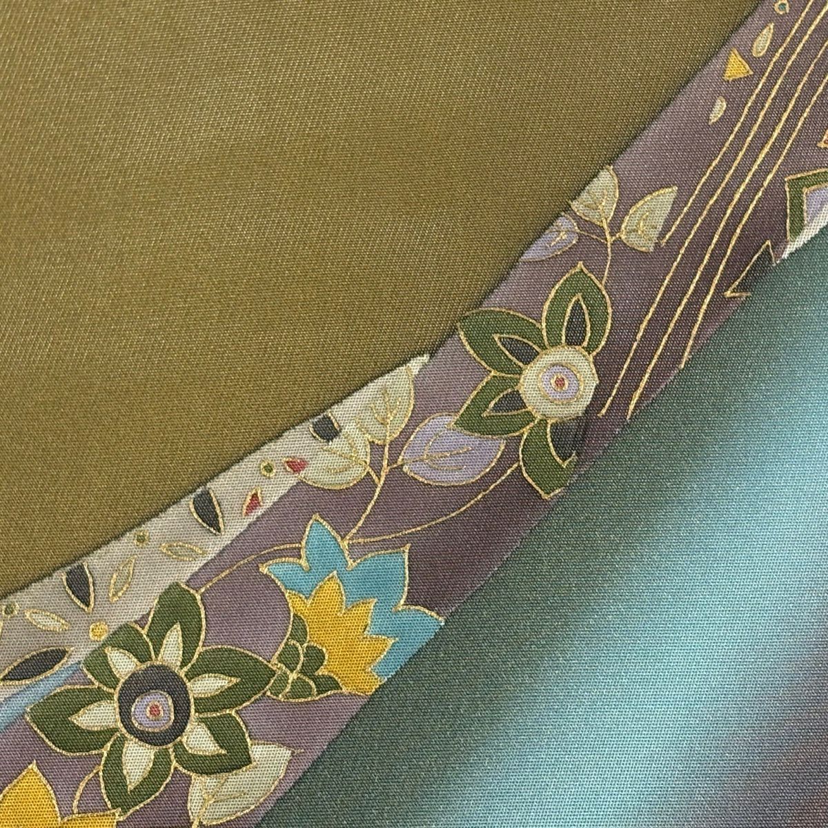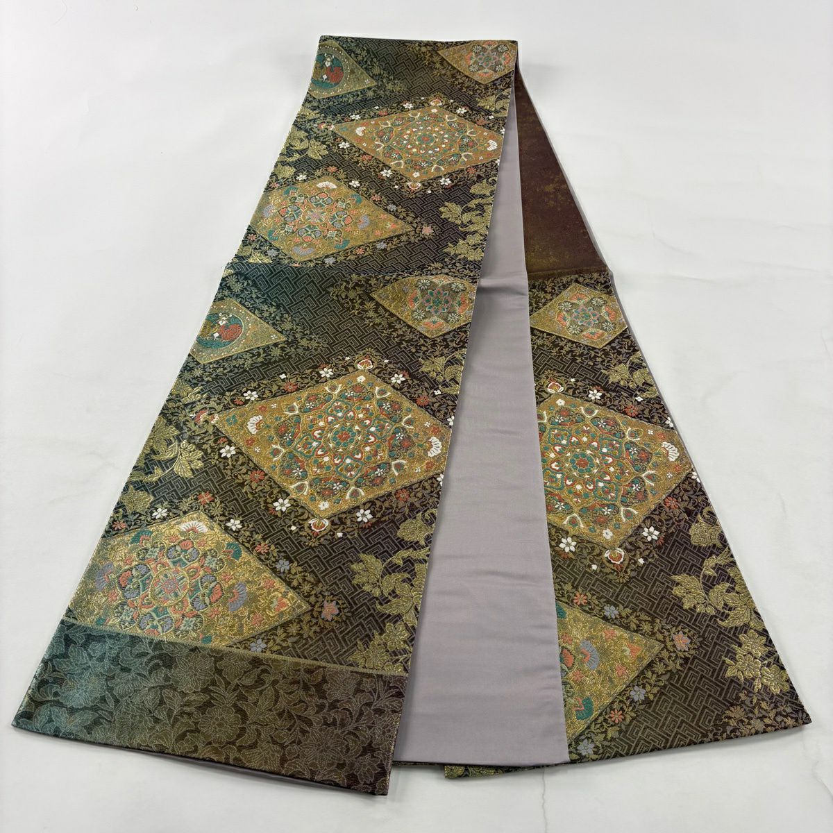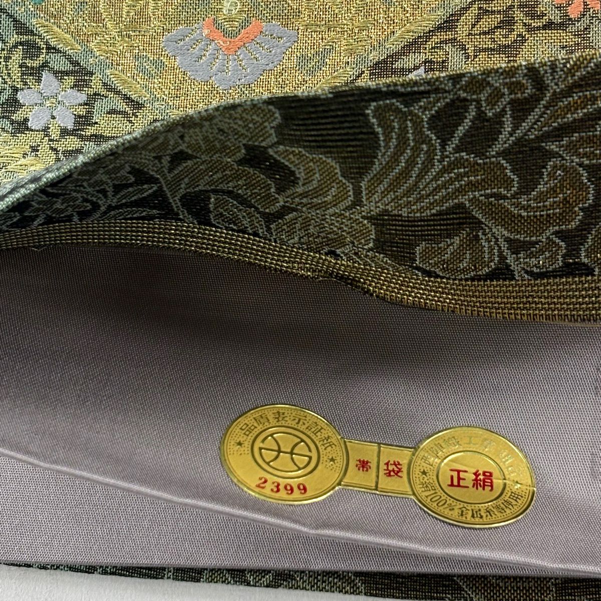 【美品】 袋帯 秀品 証紙あり 華文 菱 金糸 箔 茶緑色 六通 正絹