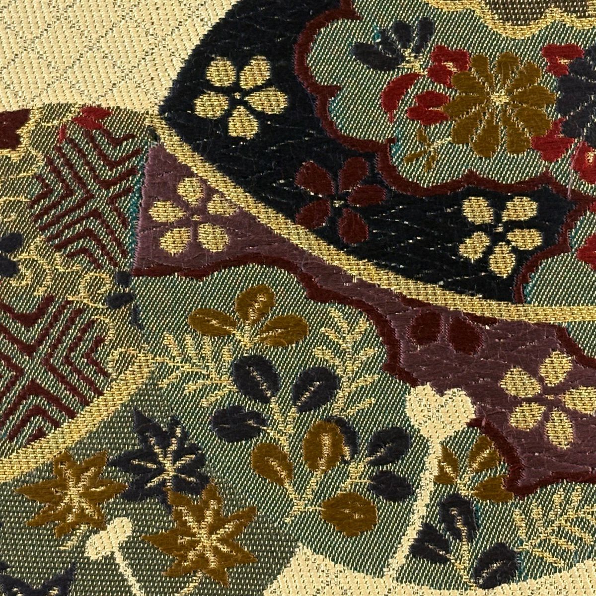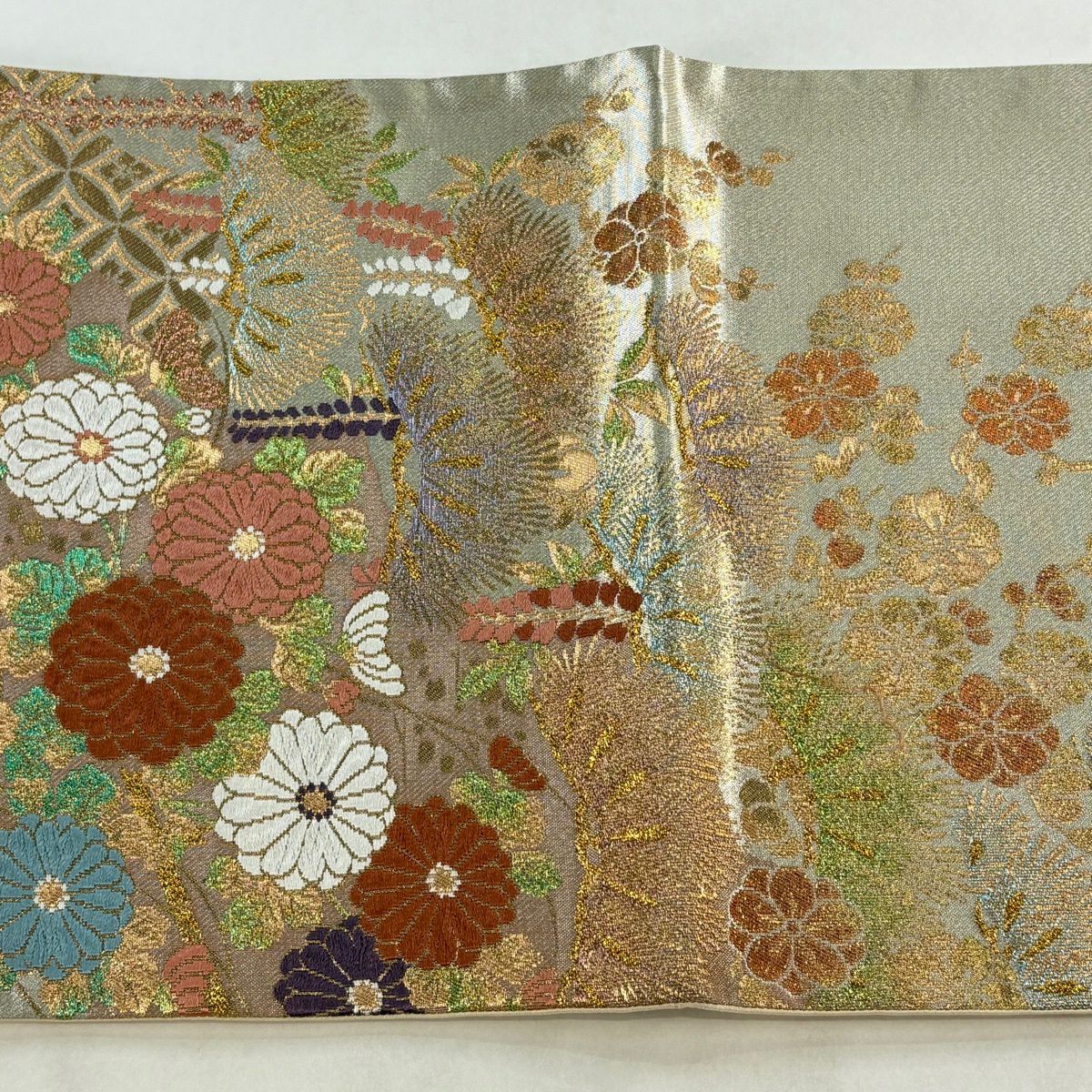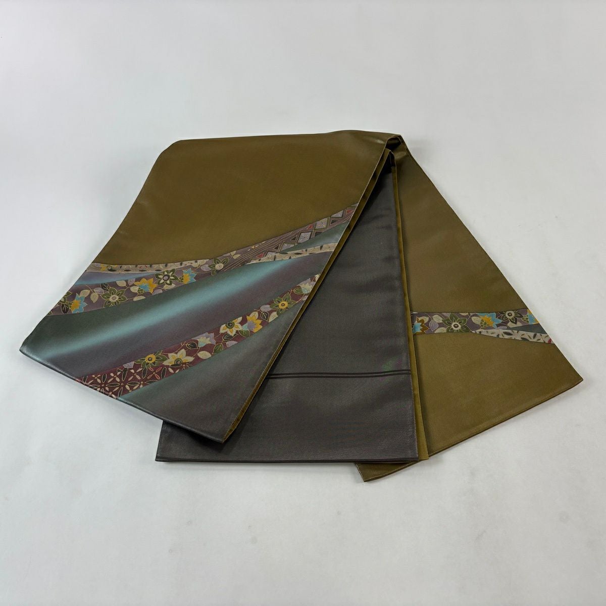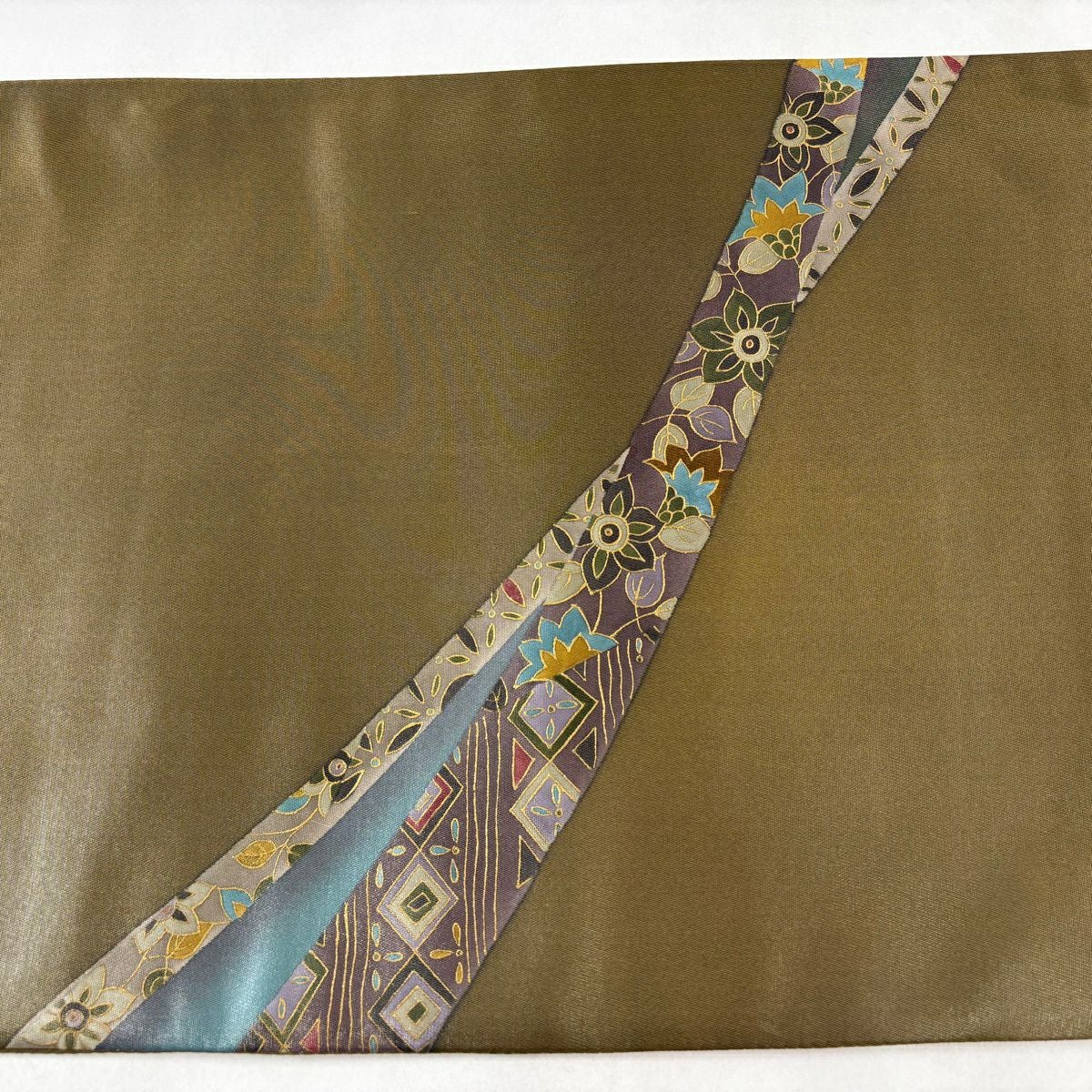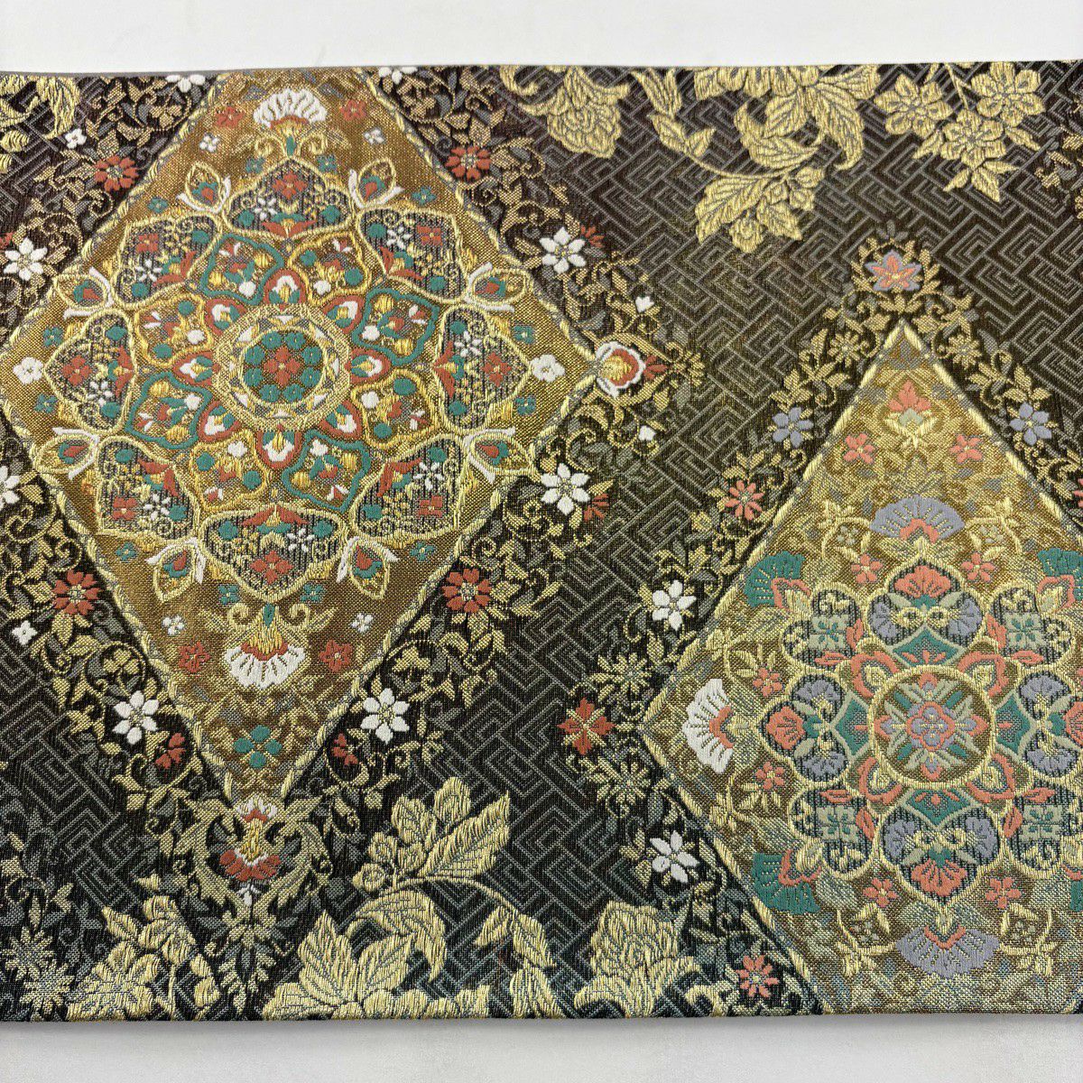 【美品】 袋帯 秀品 証紙あり 華文 菱 金糸 箔 茶緑色 六通 正絹