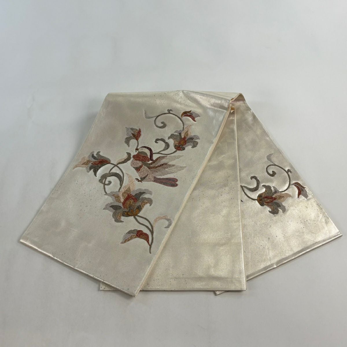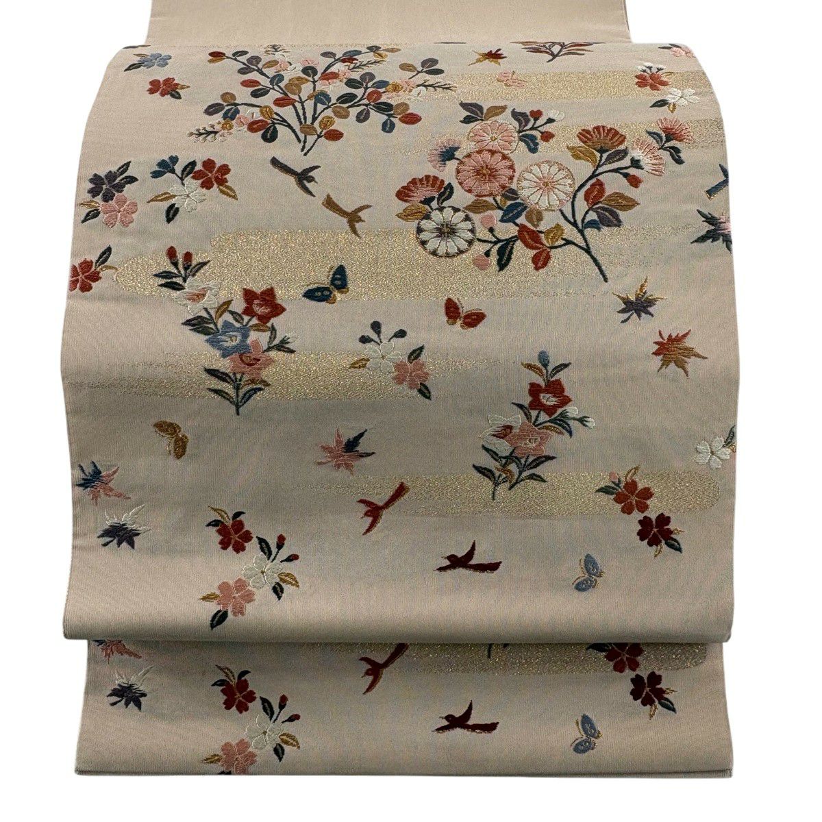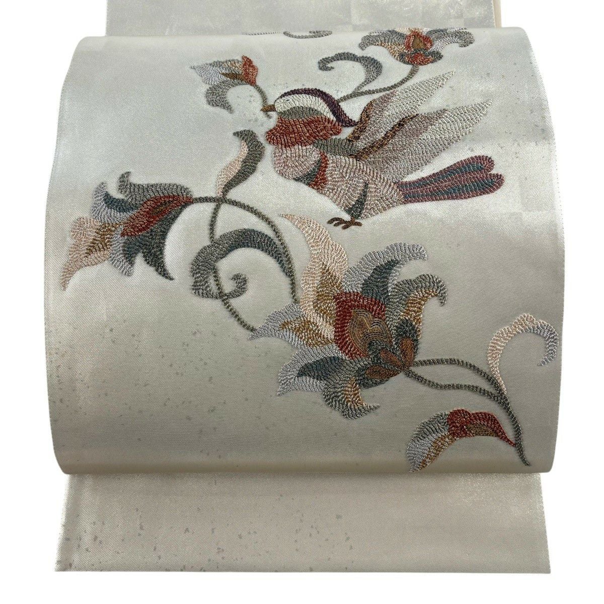 袋帯 秀品 鈴乃屋 秋草 鳥 金糸 刺繍 ベージュ お太鼓柄 正絹