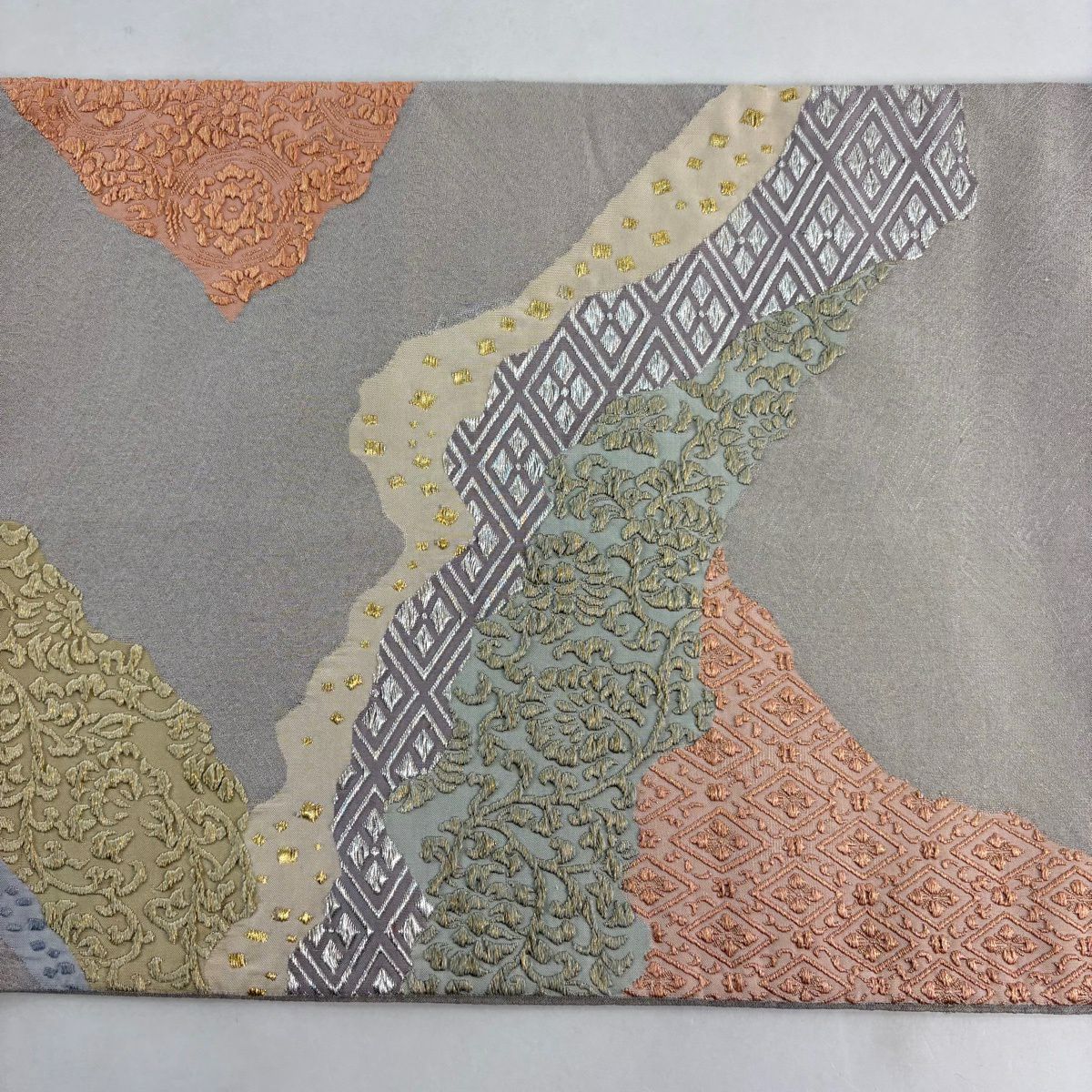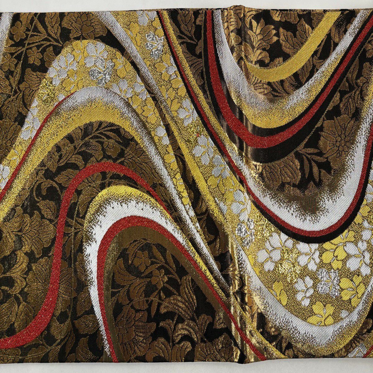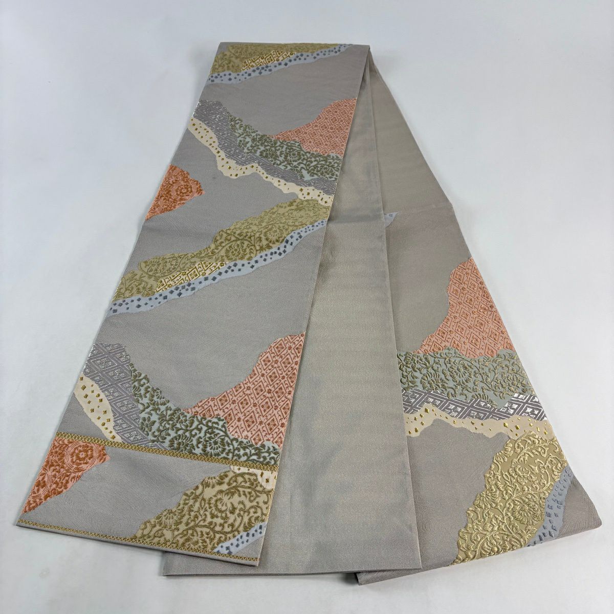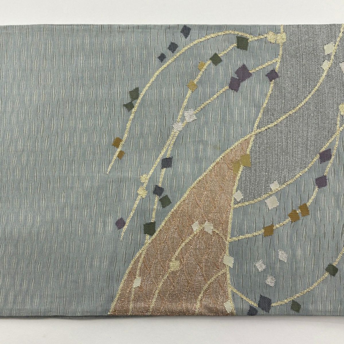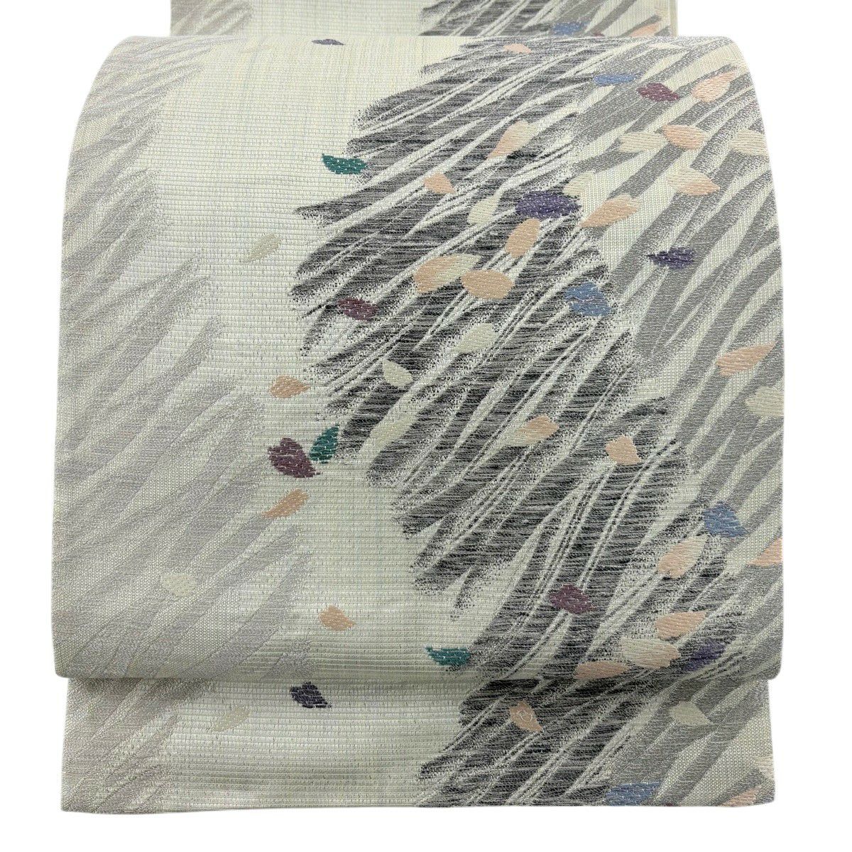 【美品】 袋帯 秀品 桜の花びら よろけ縞 唐織 箔 灰緑 六通 正絹
