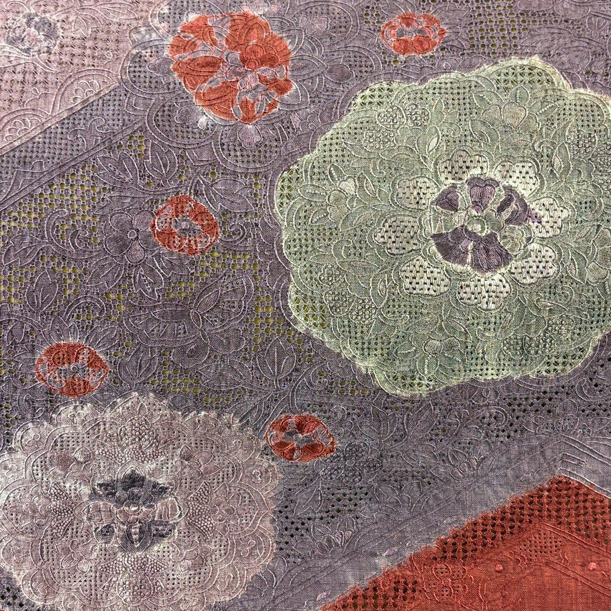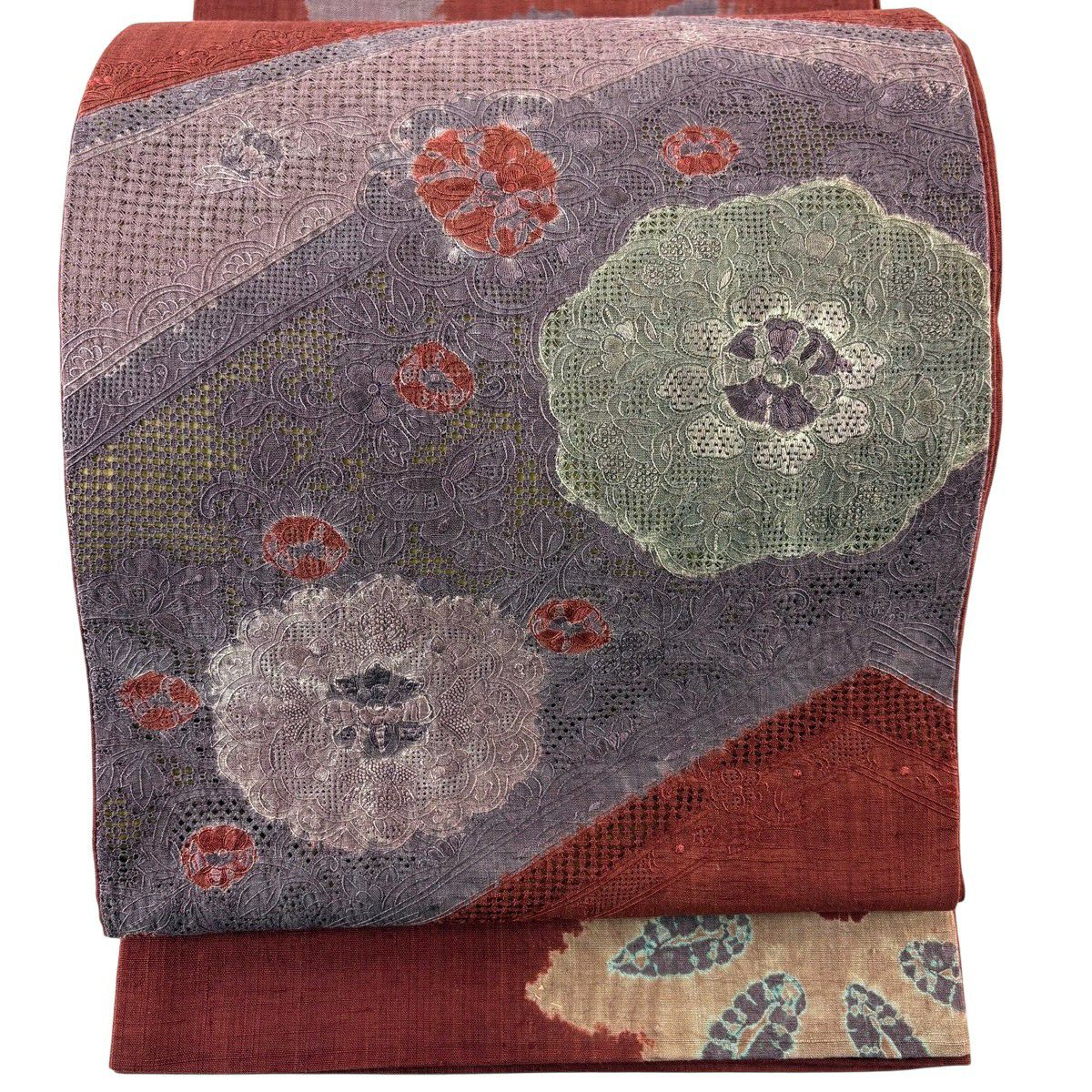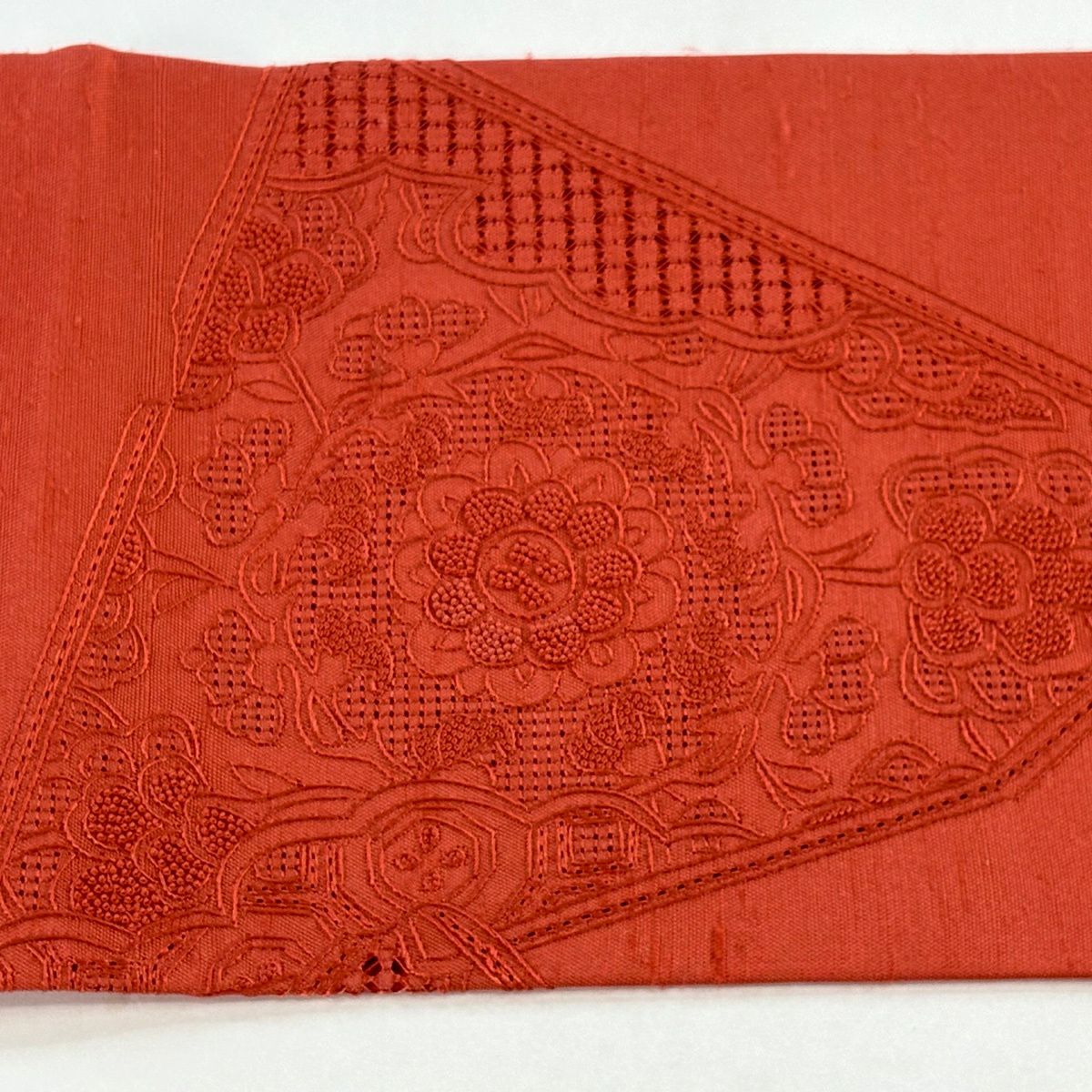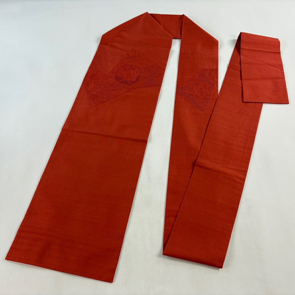 【美品】 袋帯 秀品 紬地 華文 笹 刺繍 絞り 赤茶 お太鼓柄 正絹