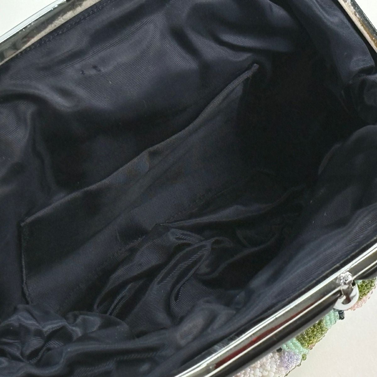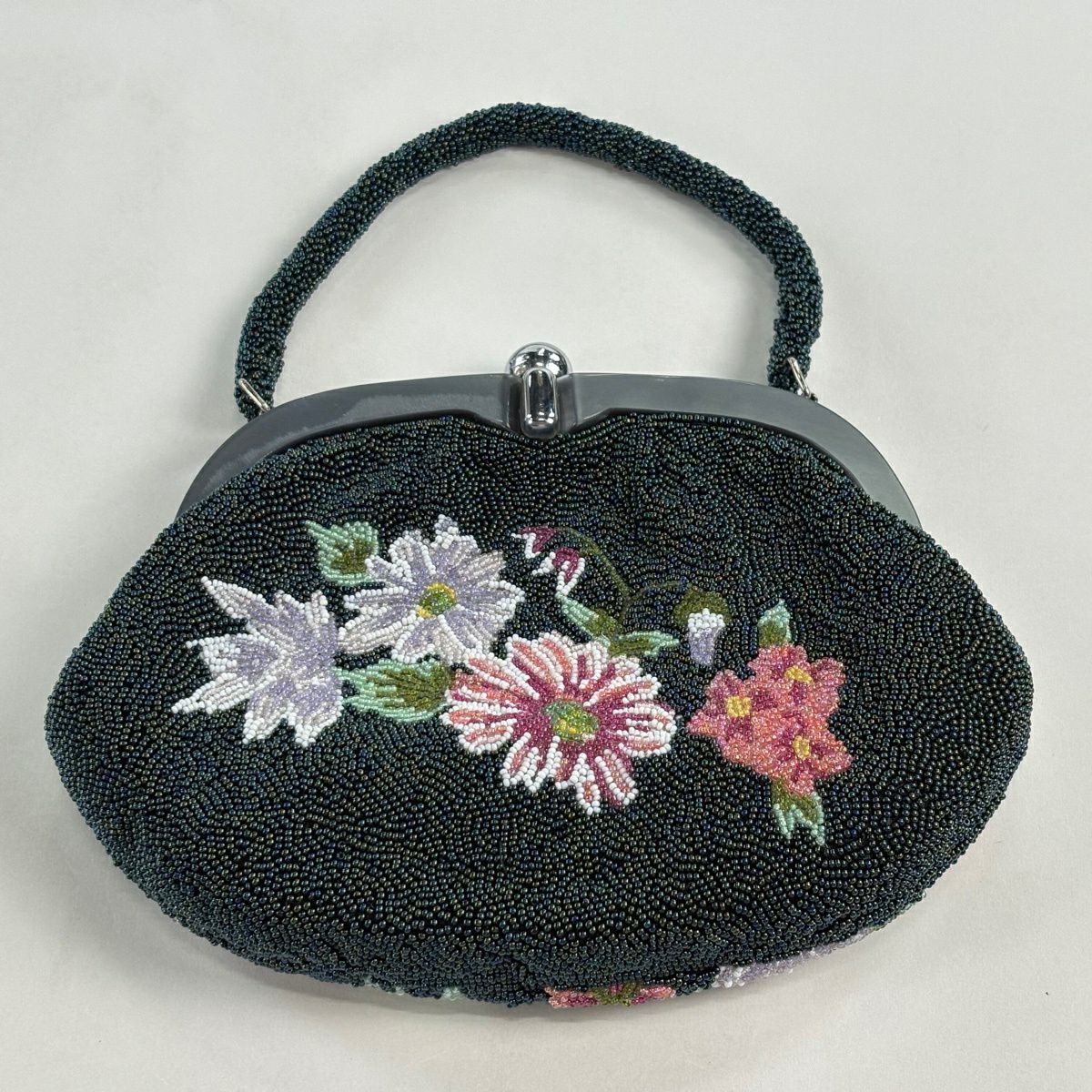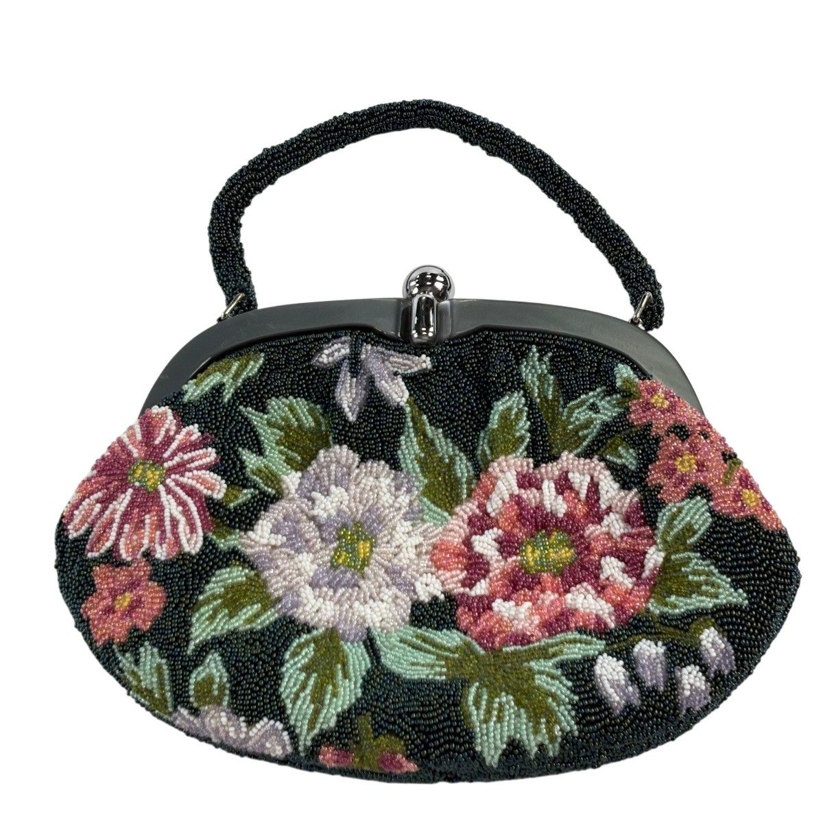 和装バッグ 秀品 ビーズバッグ フォーマル 草花 深緑 正絹 和装小物