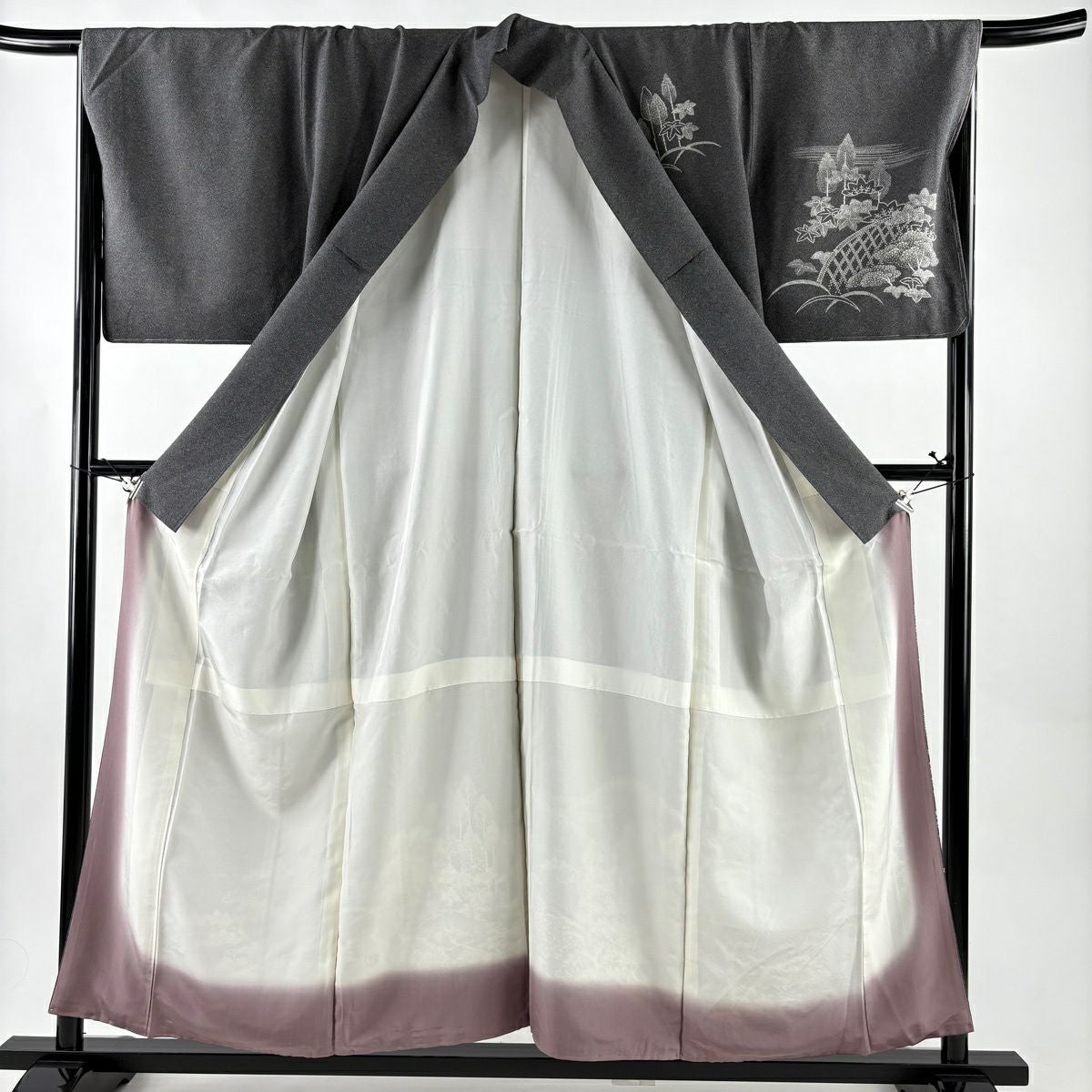 紬 身丈156.5cm 裄丈62cm S 袷 草花 鳥 灰色 正絹 秀品