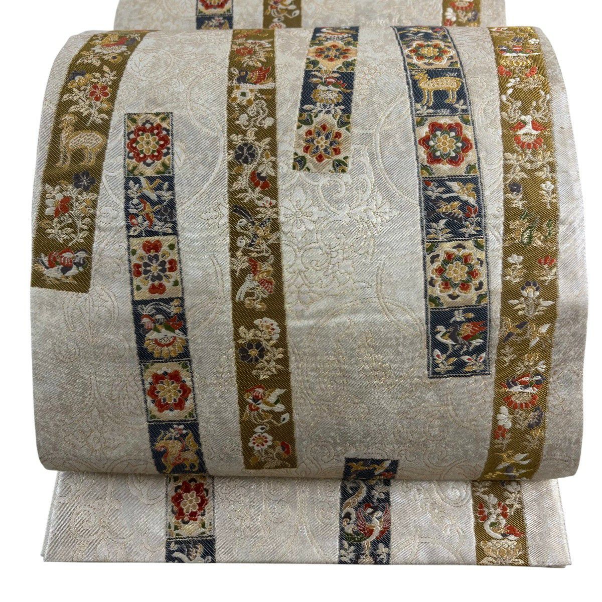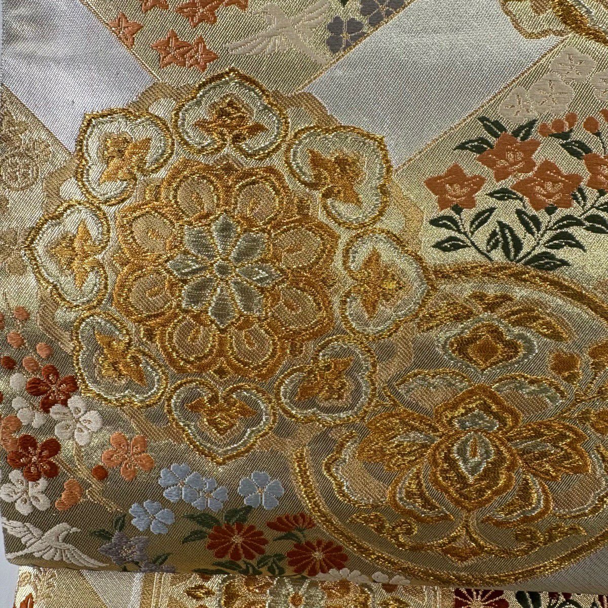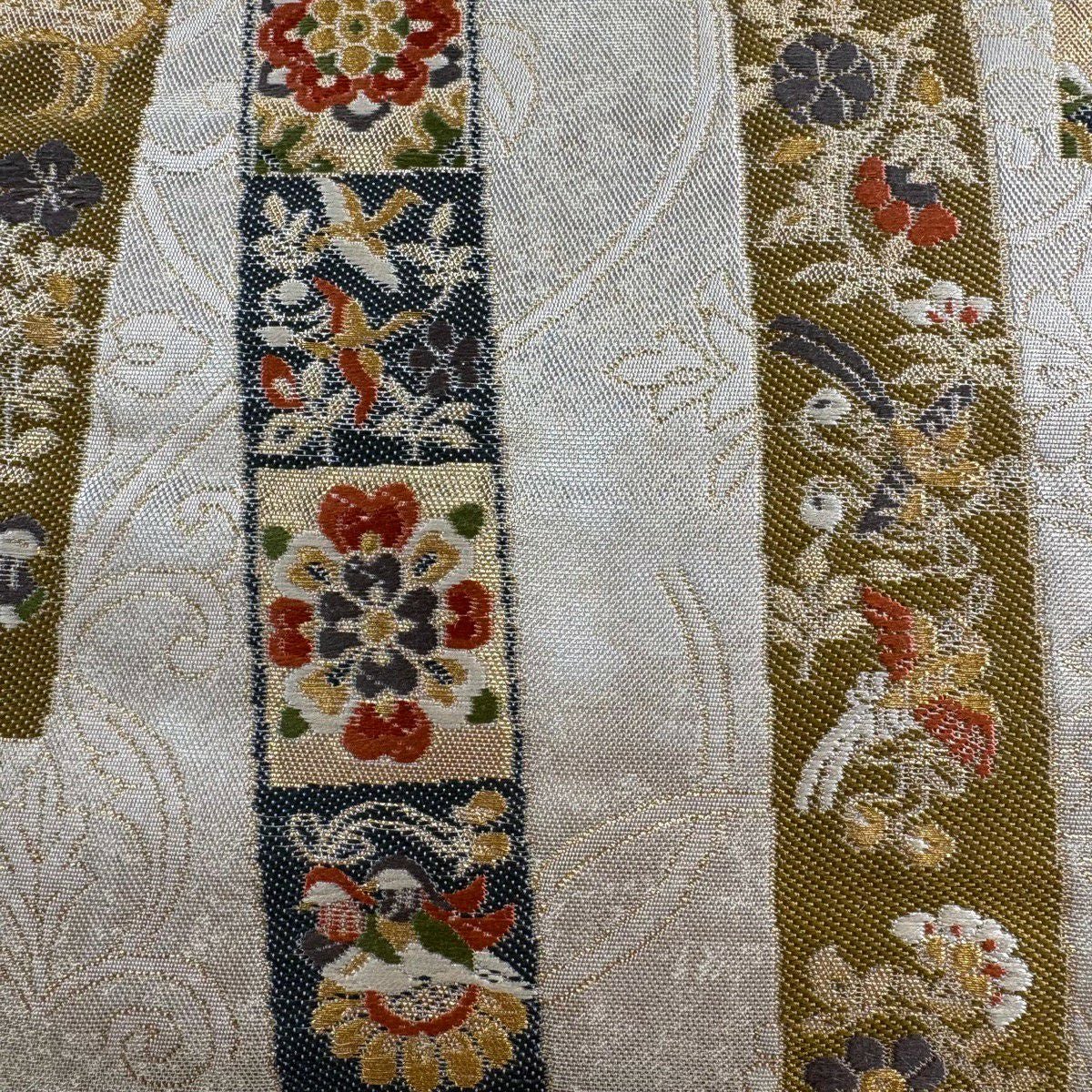 【美品】 袋帯 秀品 花喰い鳥 花唐草 金銀糸 箔 銀色 お太鼓柄 正絹