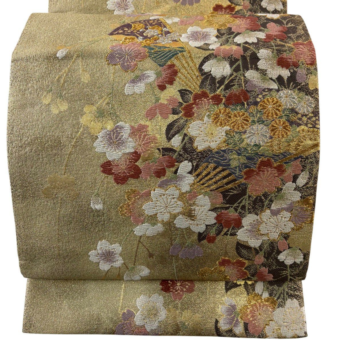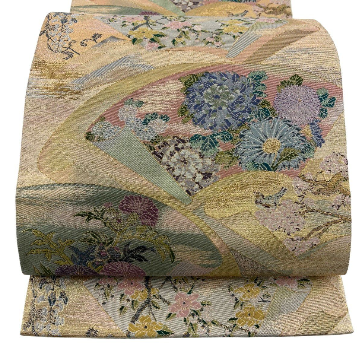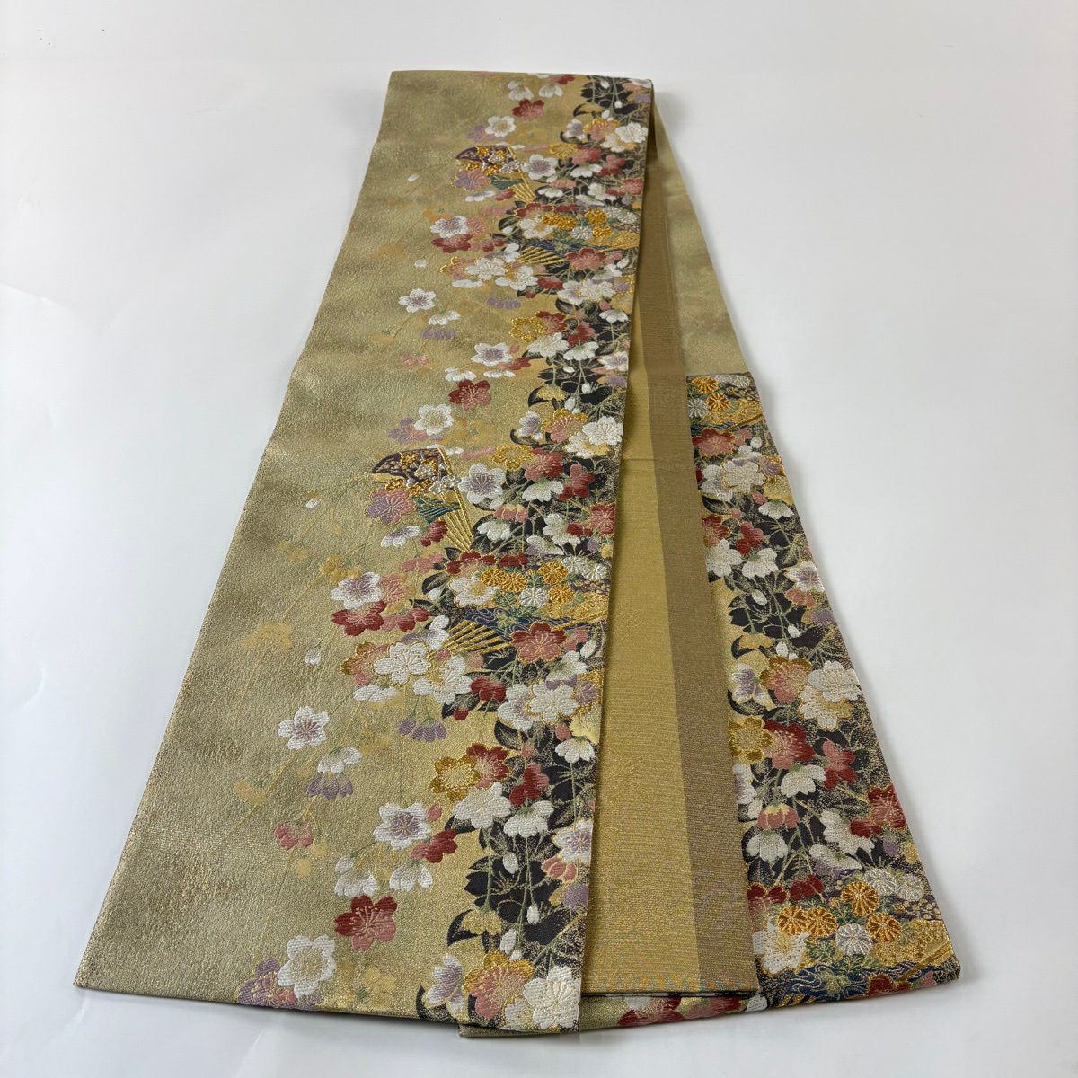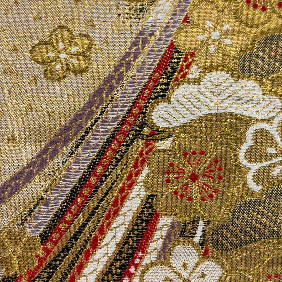 50%OFF 袋帯 秀品 扇面 花鳥 金糸 箔 金色 六通 正絹 K50
