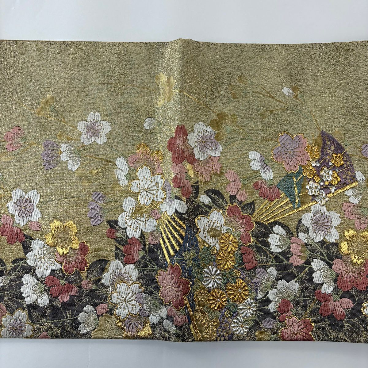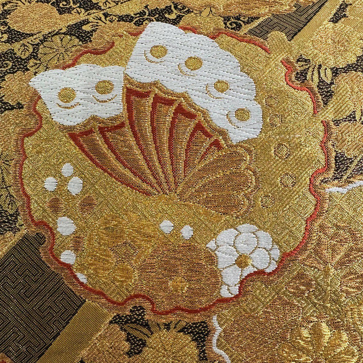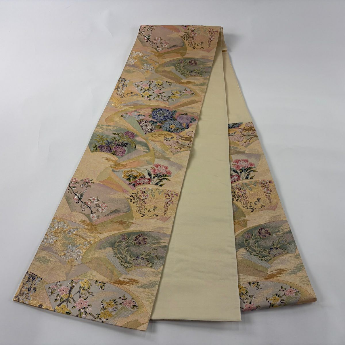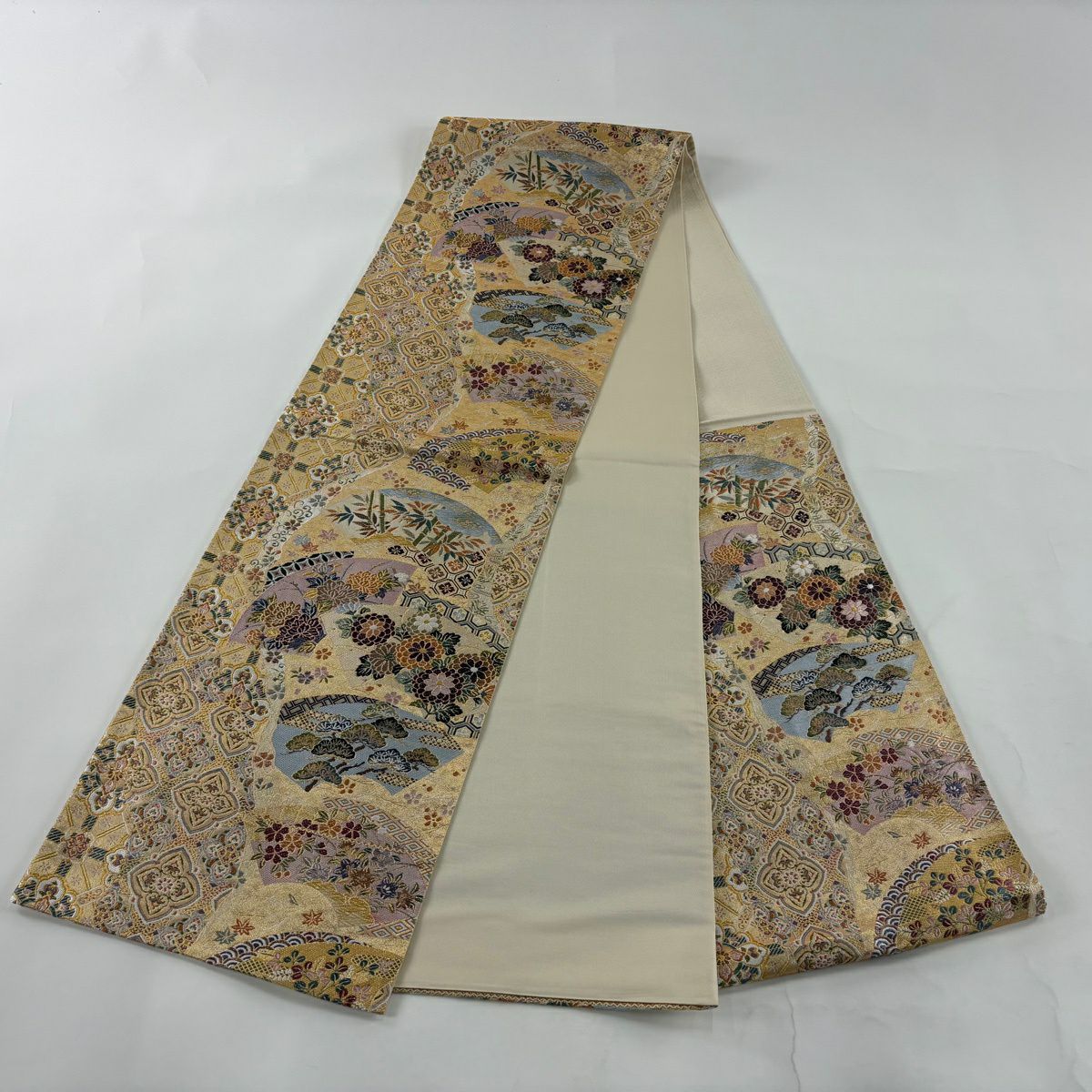 50%OFF 袋帯 秀品 扇面 花鳥 金糸 箔 金色 六通 正絹 K50