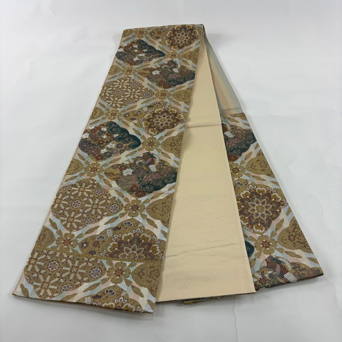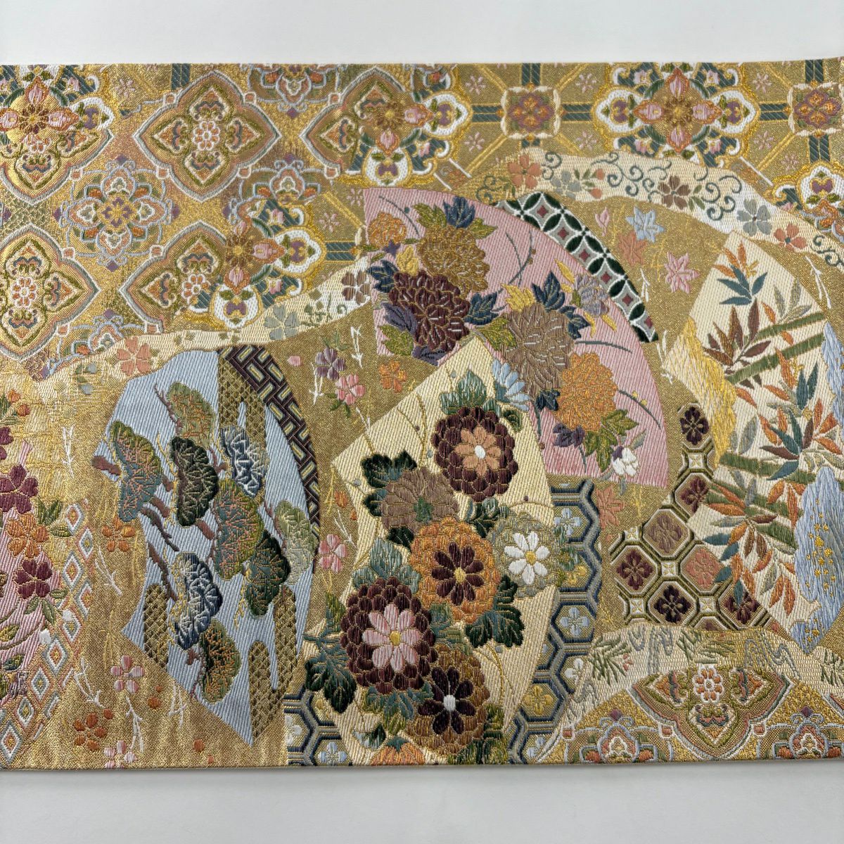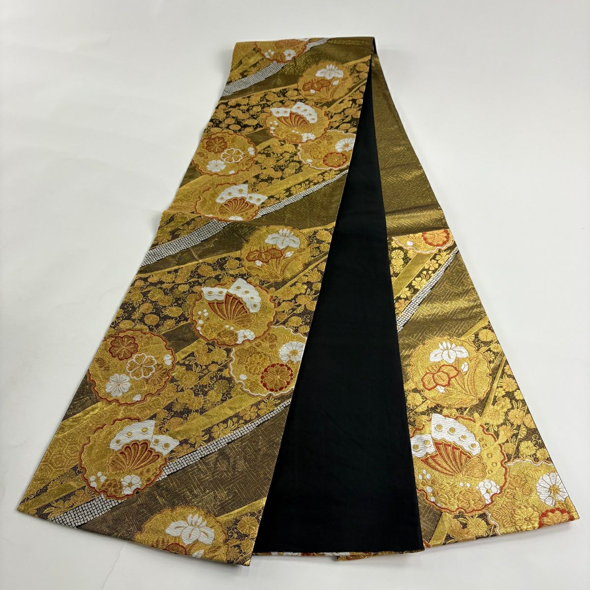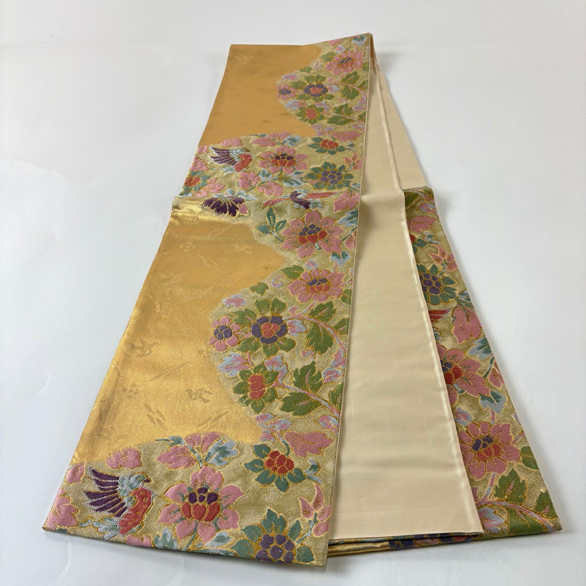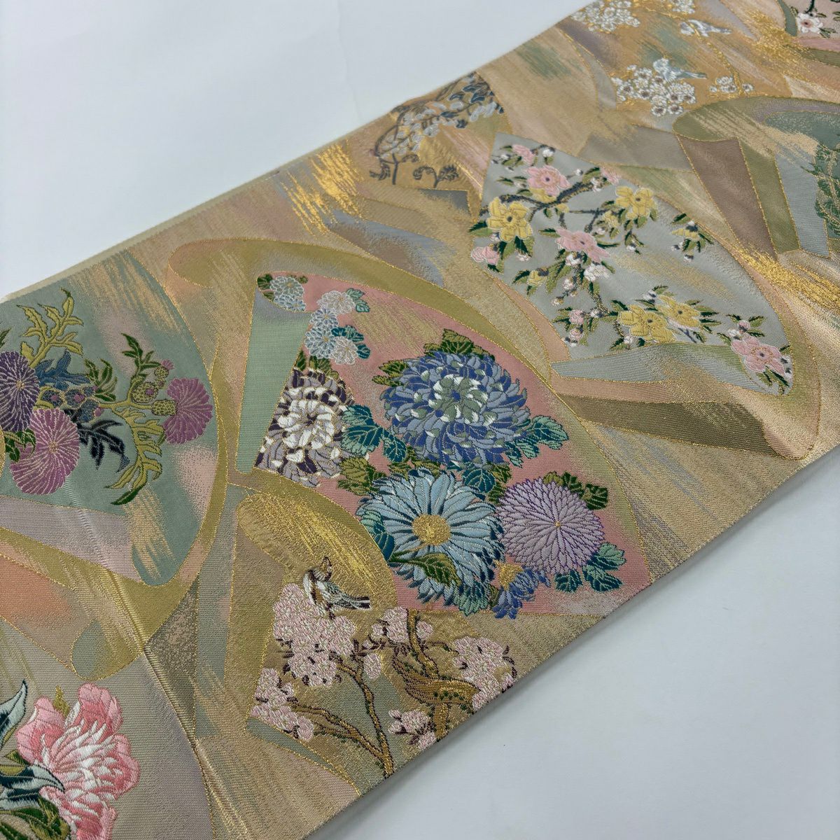 50%OFF 袋帯 秀品 扇面 花鳥 金糸 箔 金色 六通 正絹 K50