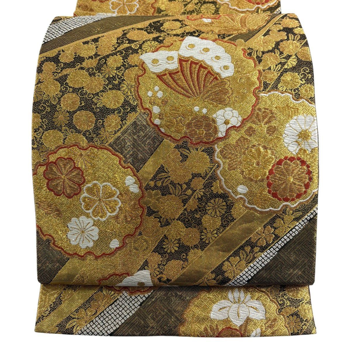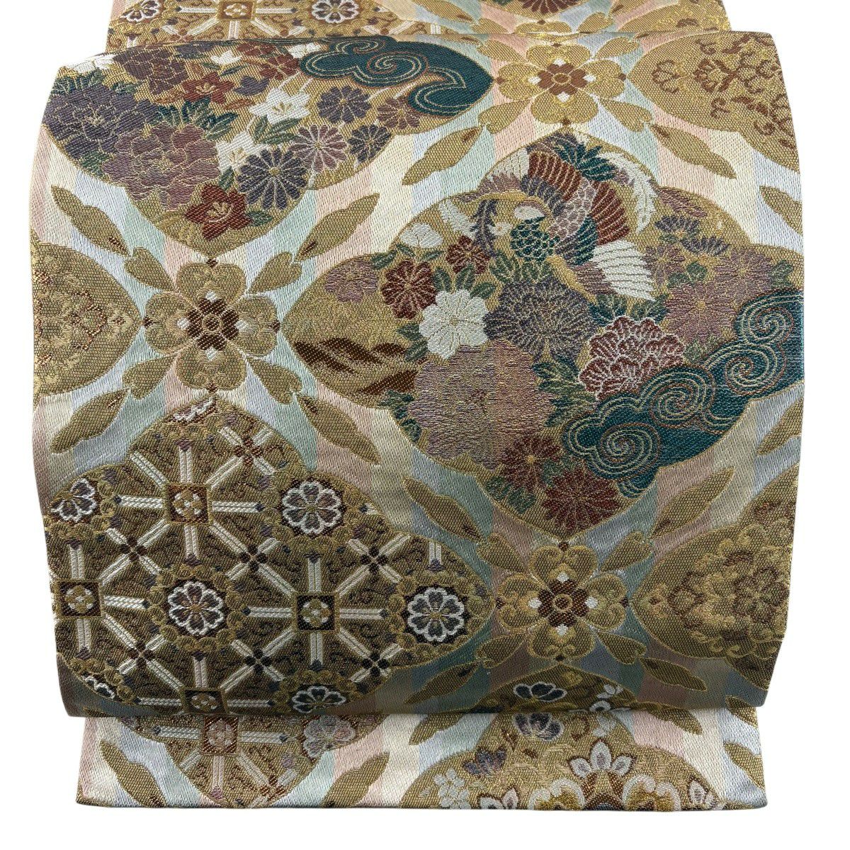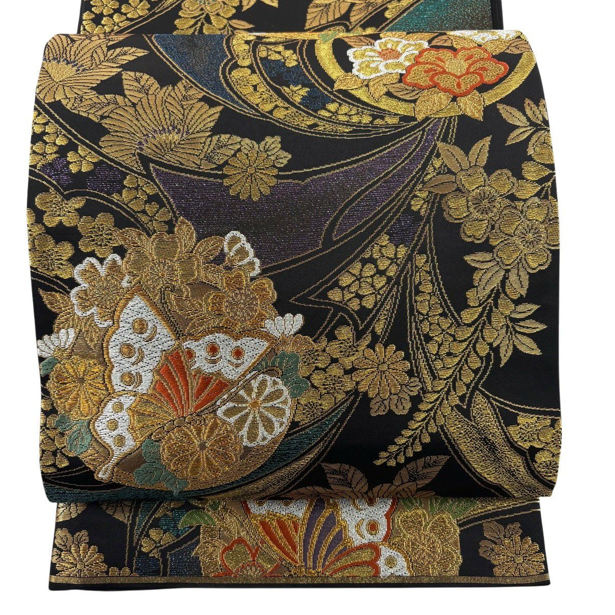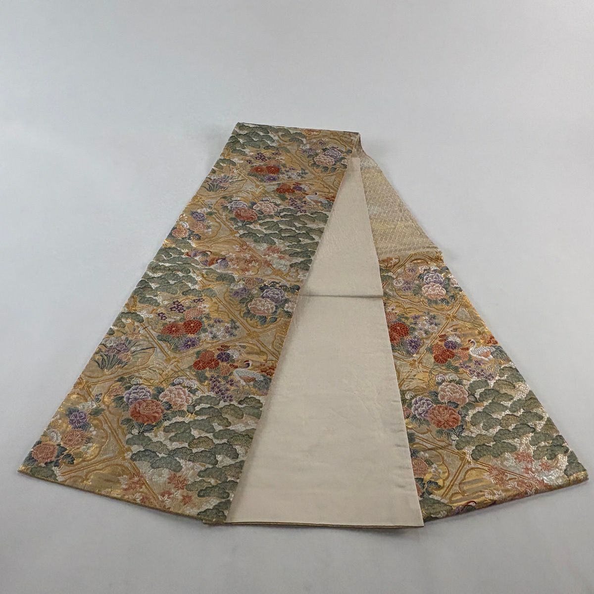 50%OFF 袋帯 秀品 扇面 花鳥 金糸 箔 金色 六通 正絹 K50